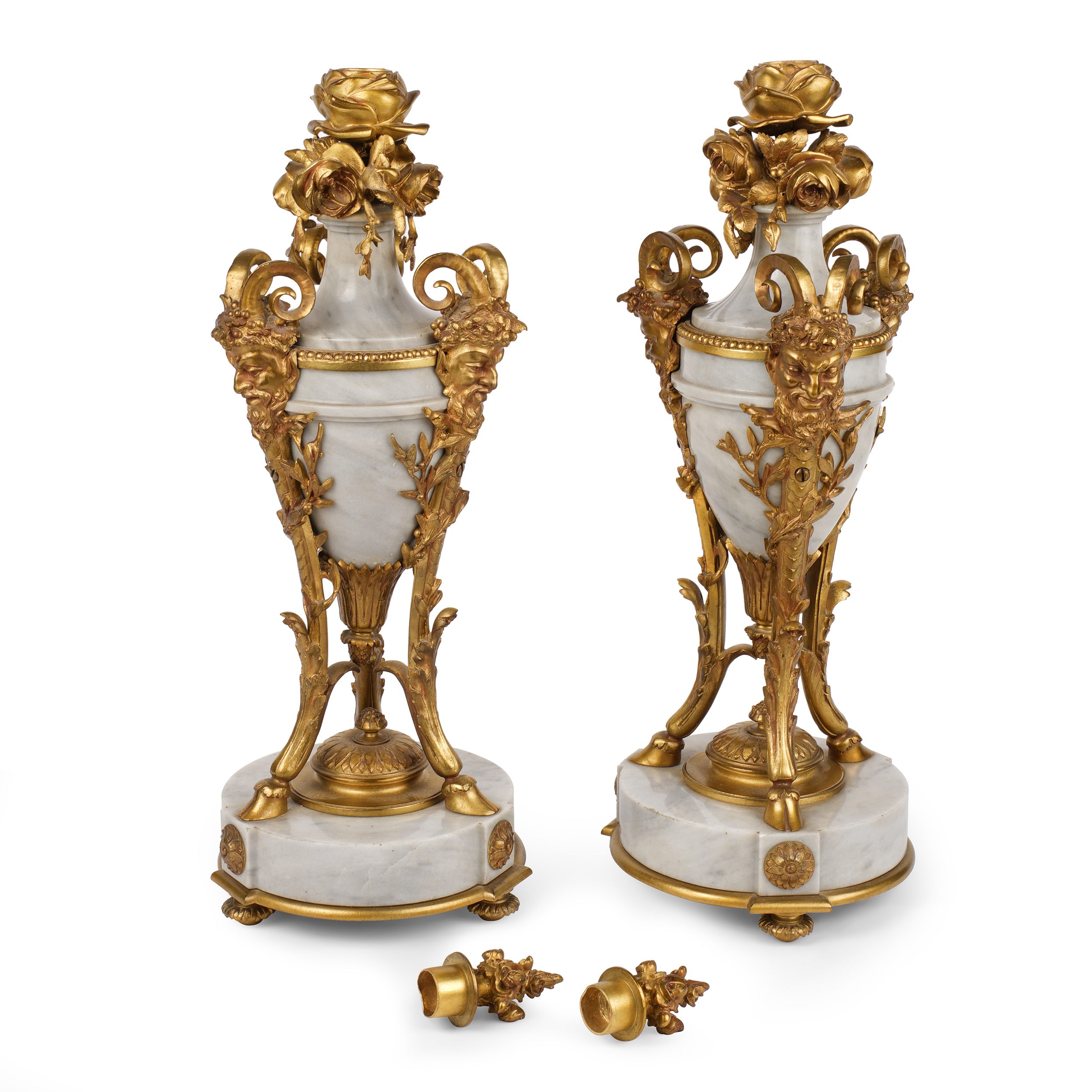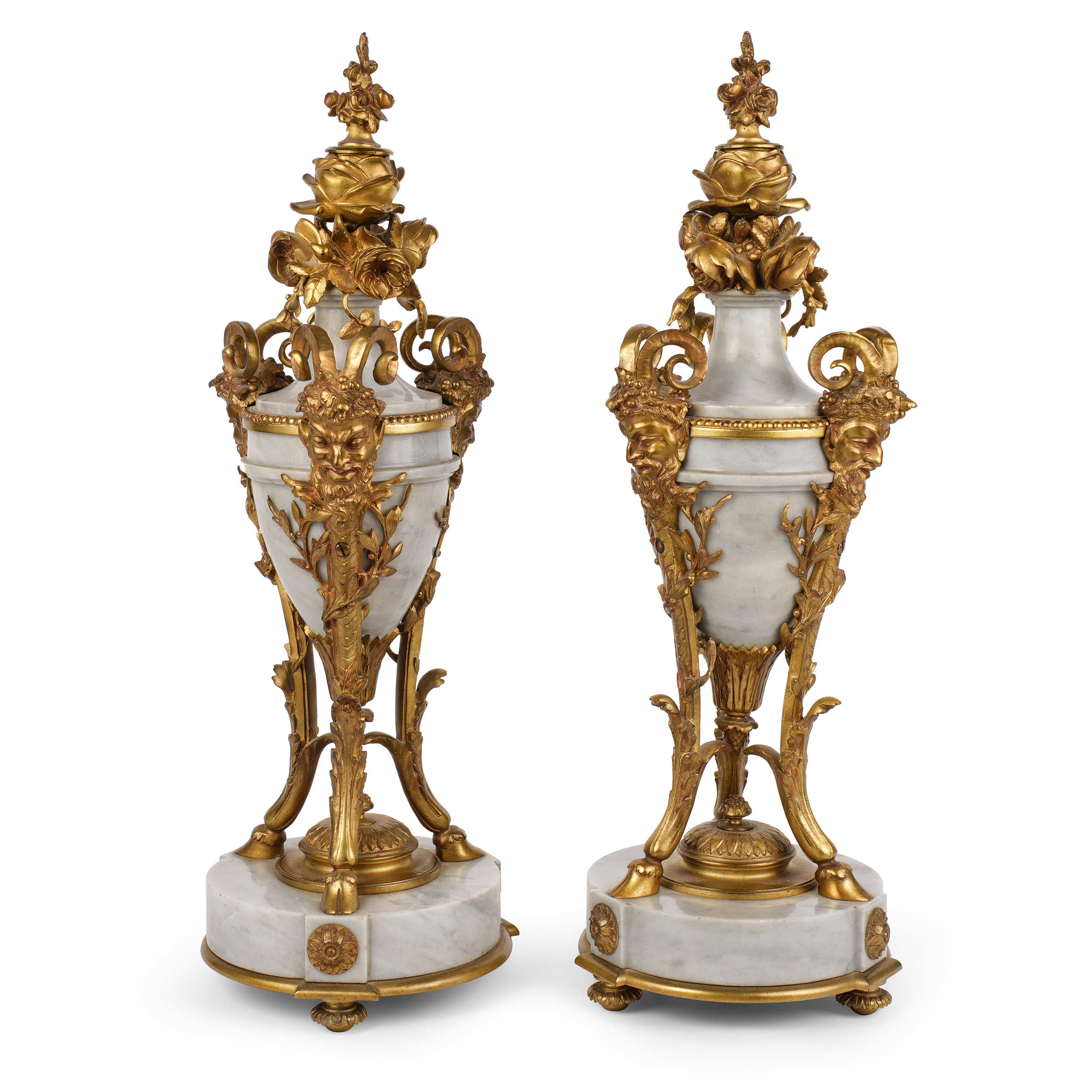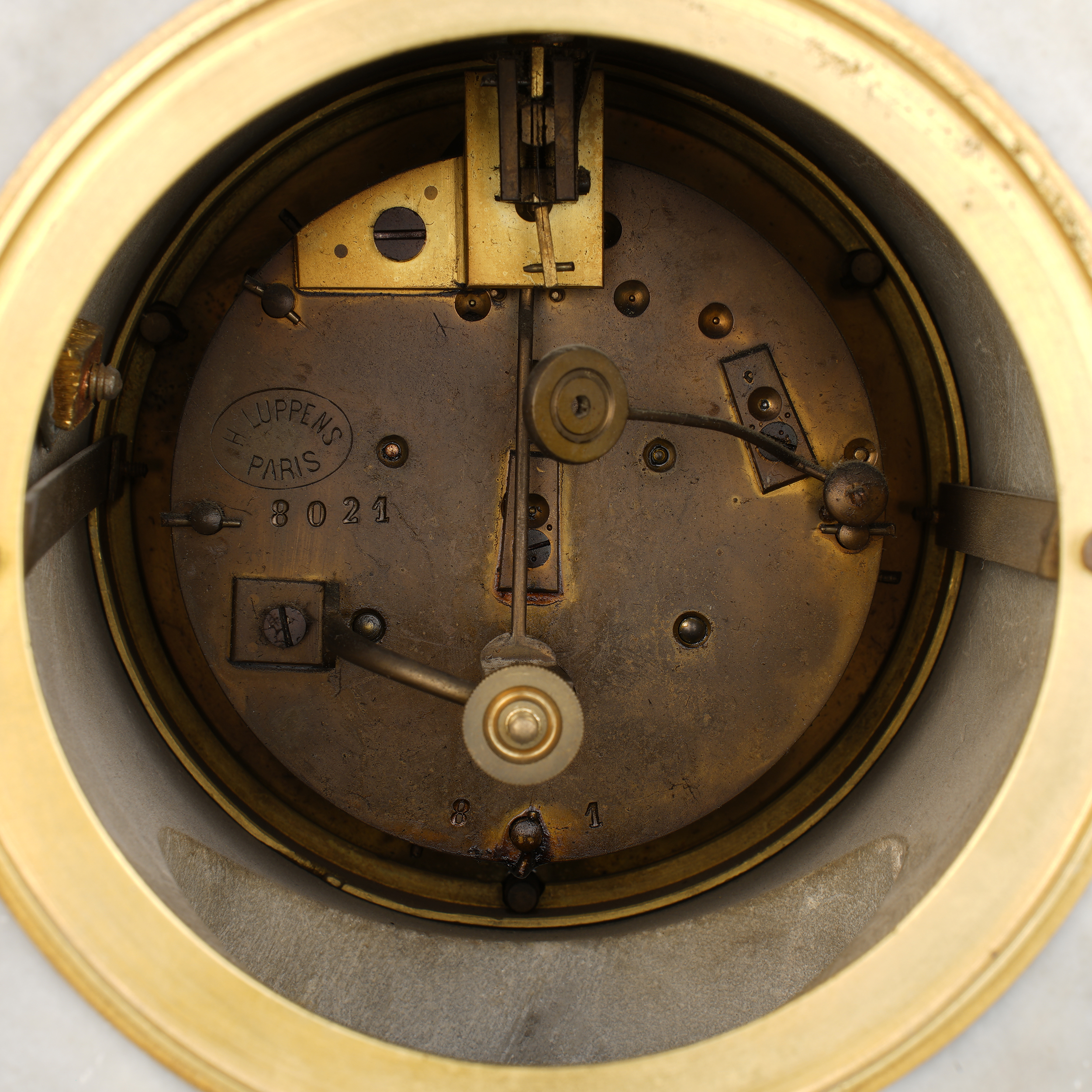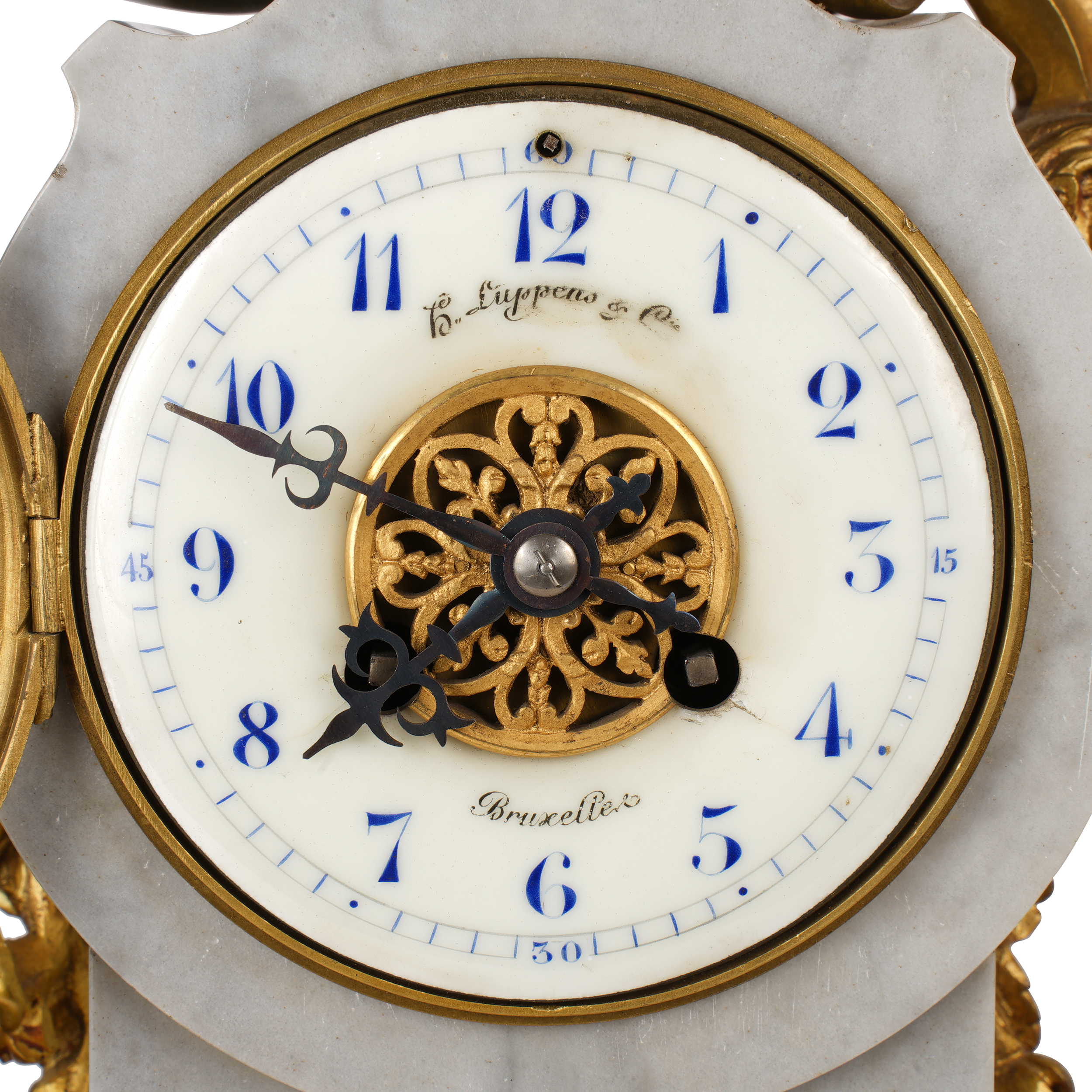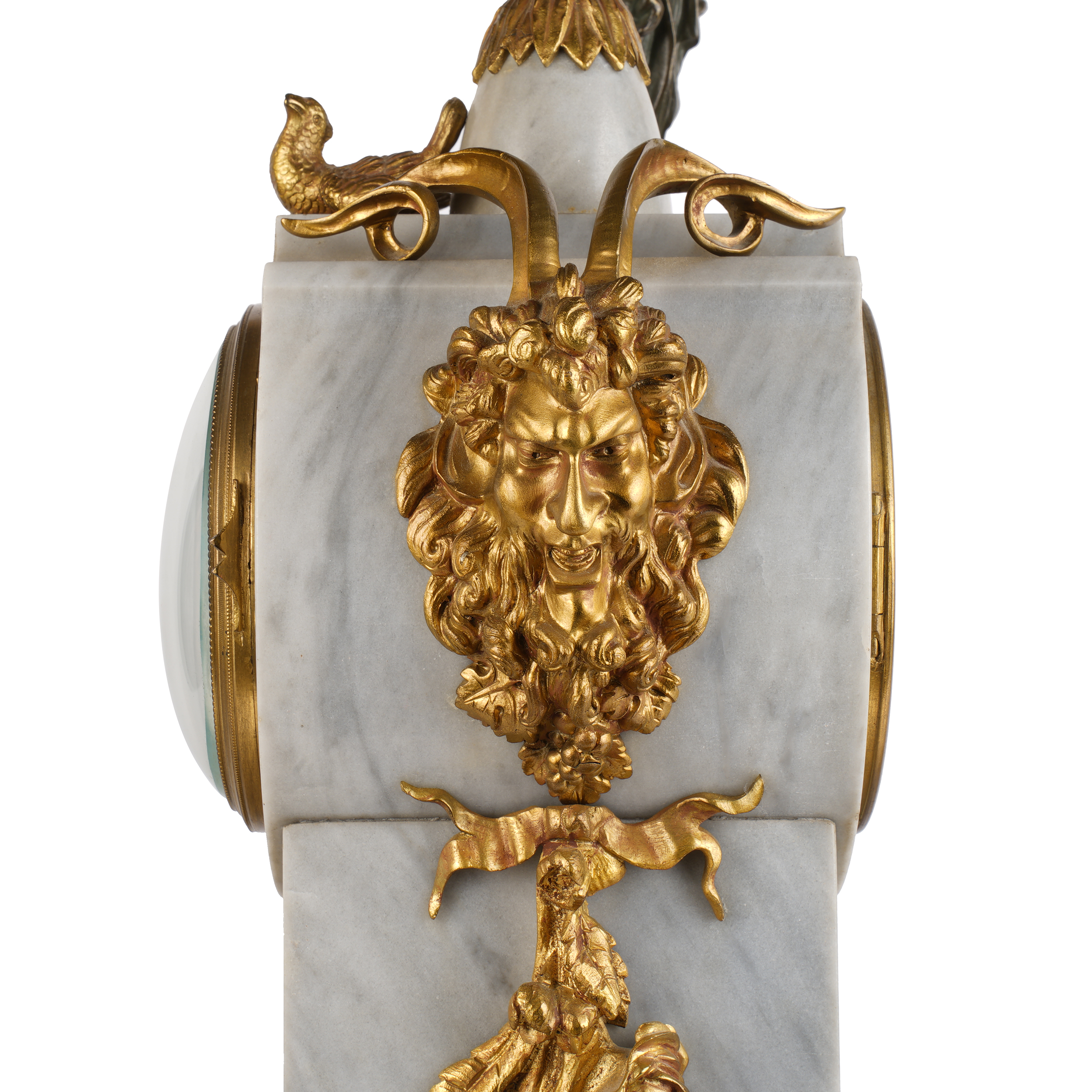 Бронза, литье, патинирование, мрамор, шлифовка; на эмалевом циферблате часов «H. Luppens & Cie // Bruxelles», Европа, начало ХХ века, высота часов – 55 см, парных ваз – 43 см.