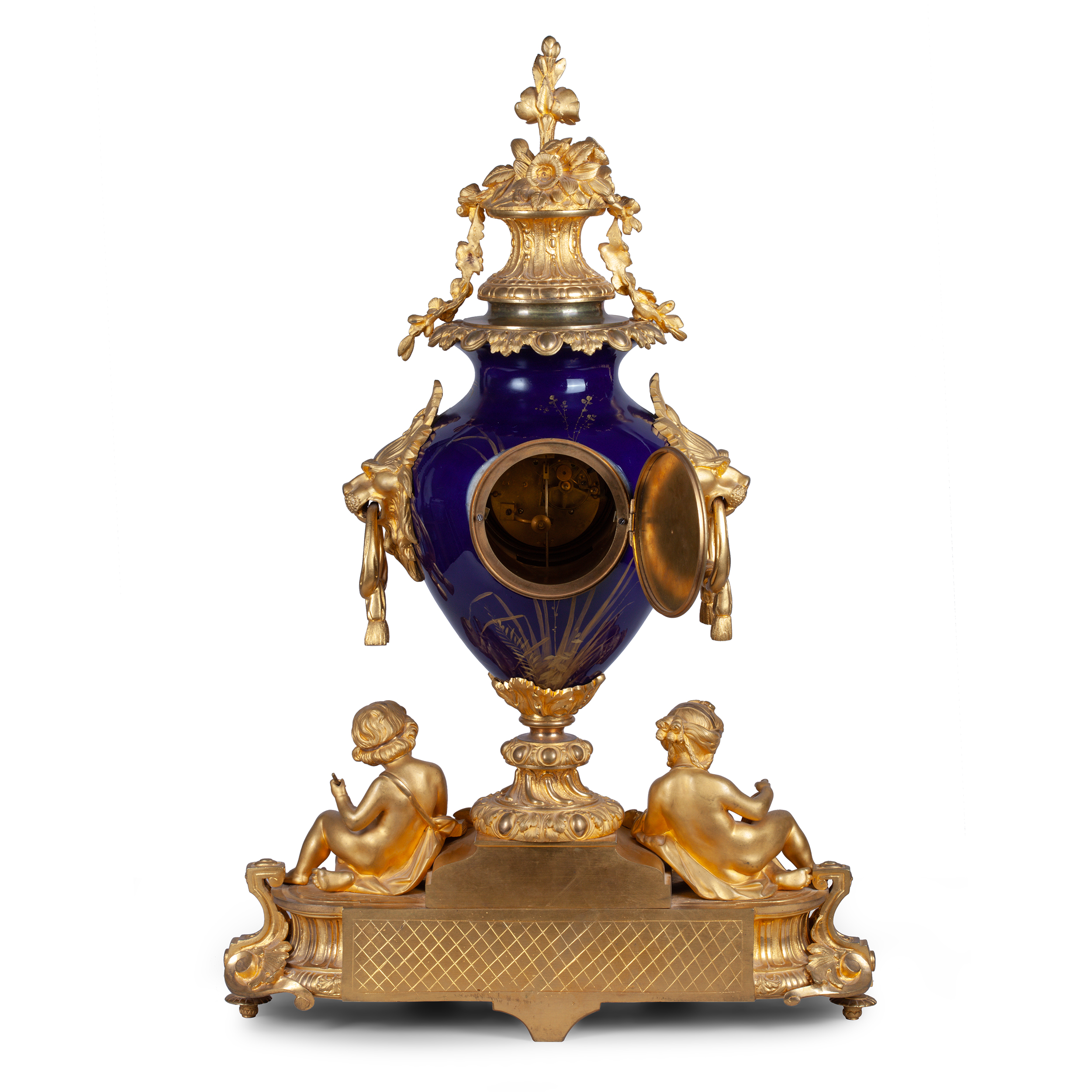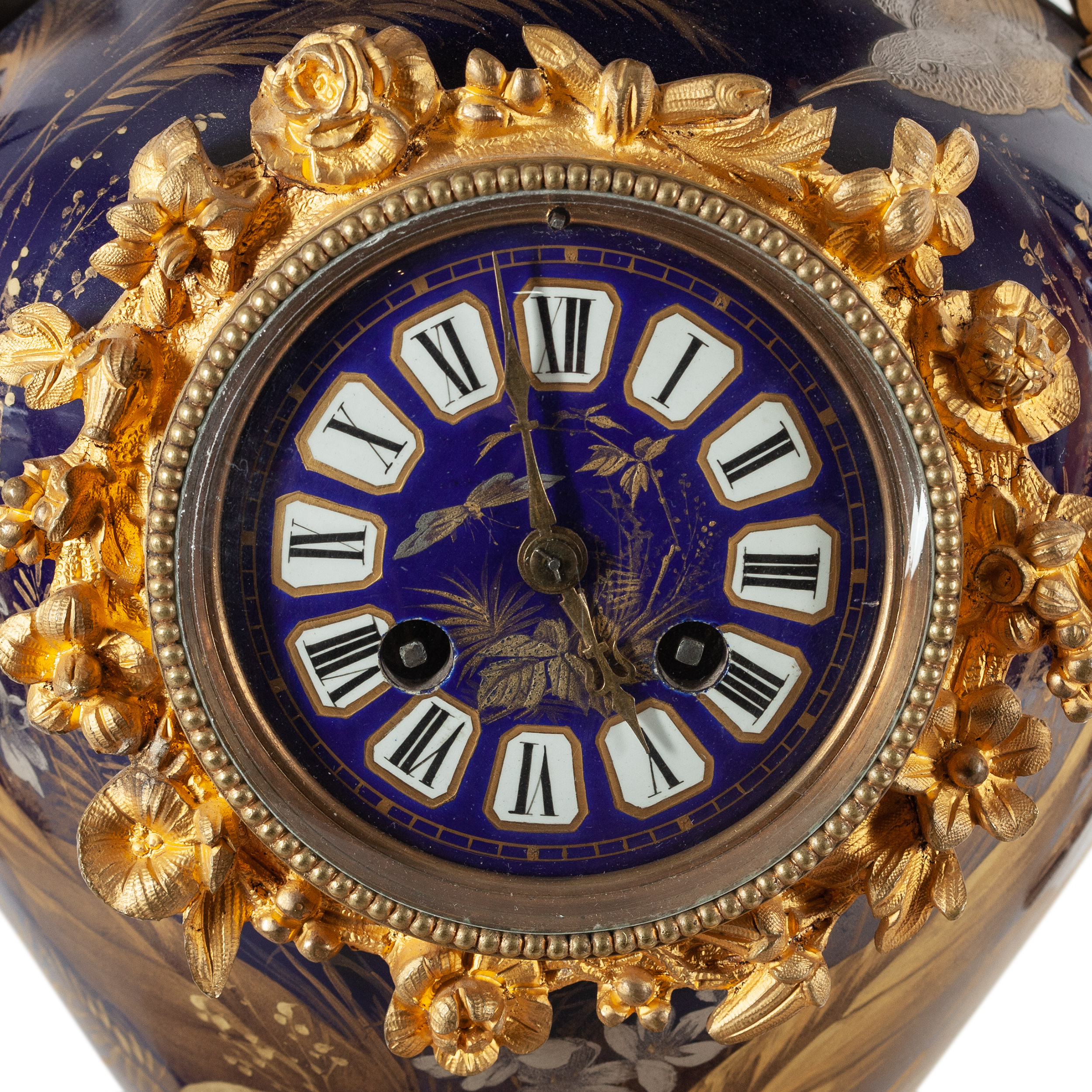 На постаменте золоченой бронзы помещена ваза темно-синего фарфора с росписью, в вазу помещен часовой циферблат. По бокам тулова укреплены накладки в виде львиных маскаронов с зажатыми в пасти кольцами. По краям постаменты расположена пара путти: девочка, держащая в руках книгу с надписью «ART DU DESSIN» (фр. искусство рисунка) и мальчик с дудочкой. Ваза завершена цветочной композицией, выполненной из золоченой бронзы. Фарфор расписан птицами, растениями, насекомыми, характерными для произведений в «японском» стиле.