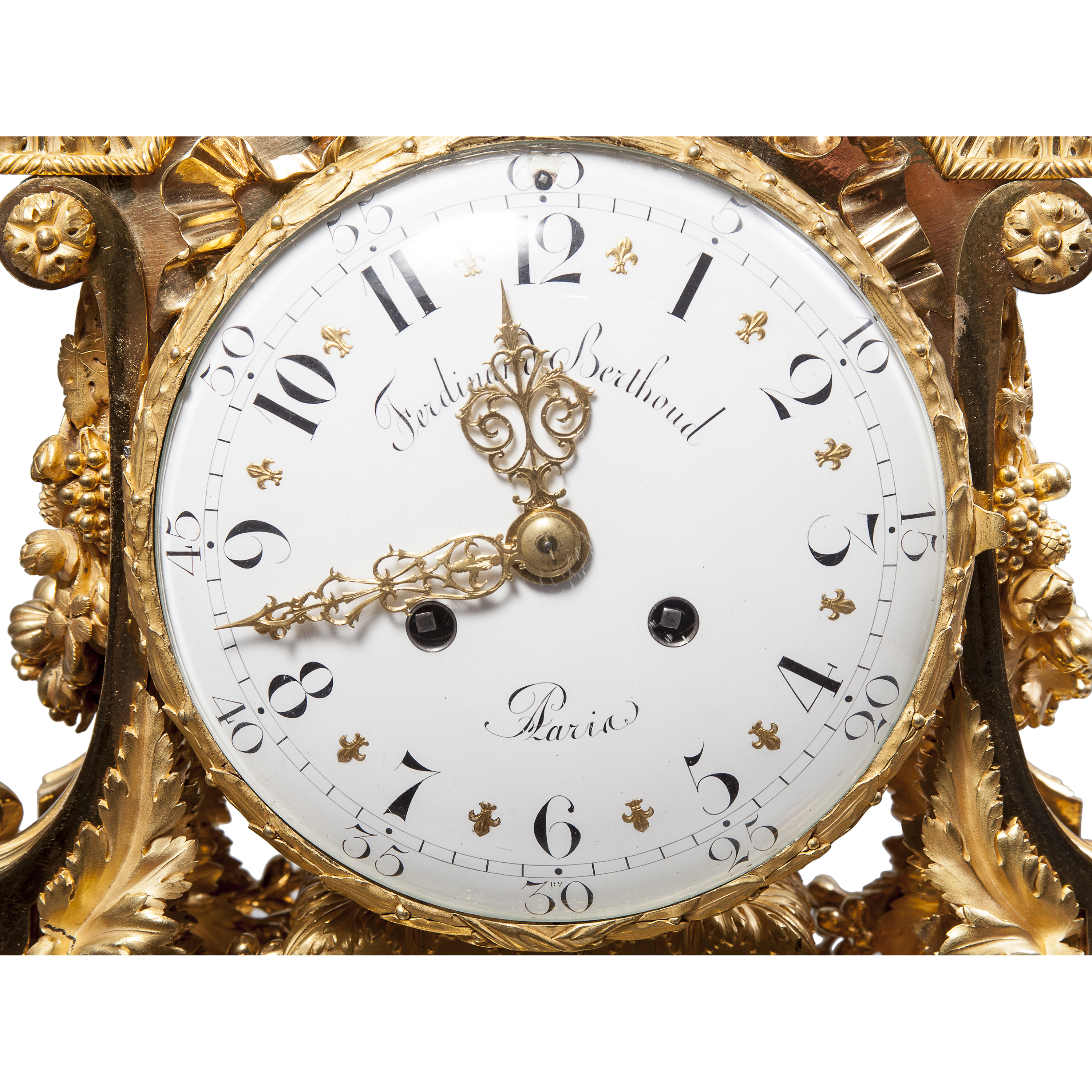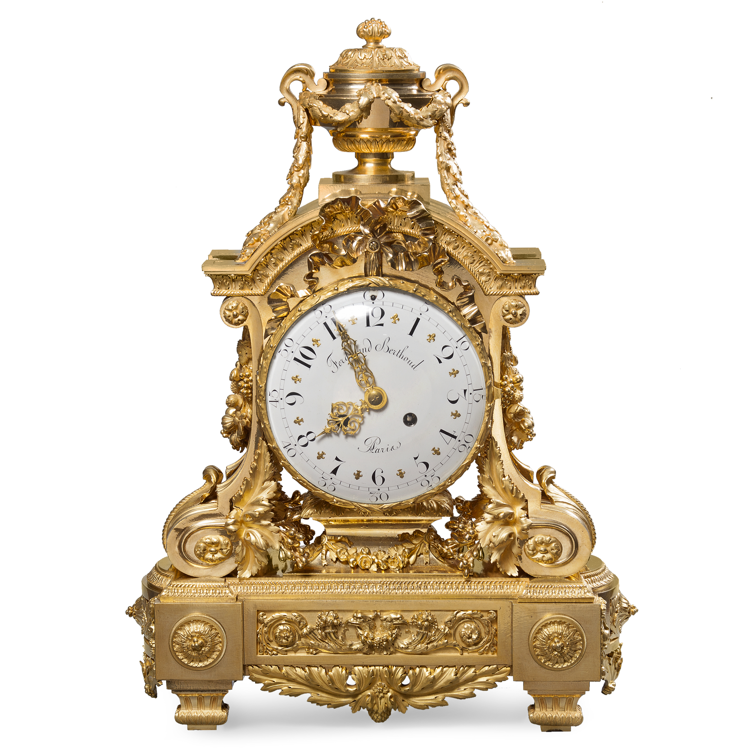 Часы выполнены по модели 1782-1783 годов. Бронза, литье, чеканка, золочение ормулю (d`ormoulu), эмалевый циферблат с арабскими цифрами для обозначения часов и минут, золоченные резные стрелки в стиле «Louis XIV», защитное стекло; на циферблате надпись: «Ferdinand Berthoud a Paris», на плате часового механизма «Ferdinand Berthoud A PARIS BY», Париж, бронзовый корпус выполнен в мастерской по производству художественных предметов из бронзы и красного дерева потомственного антиквара Альфреда Бёрделея (1847-1919); размер (в/ш/г): 54 х 36 х 16 см.