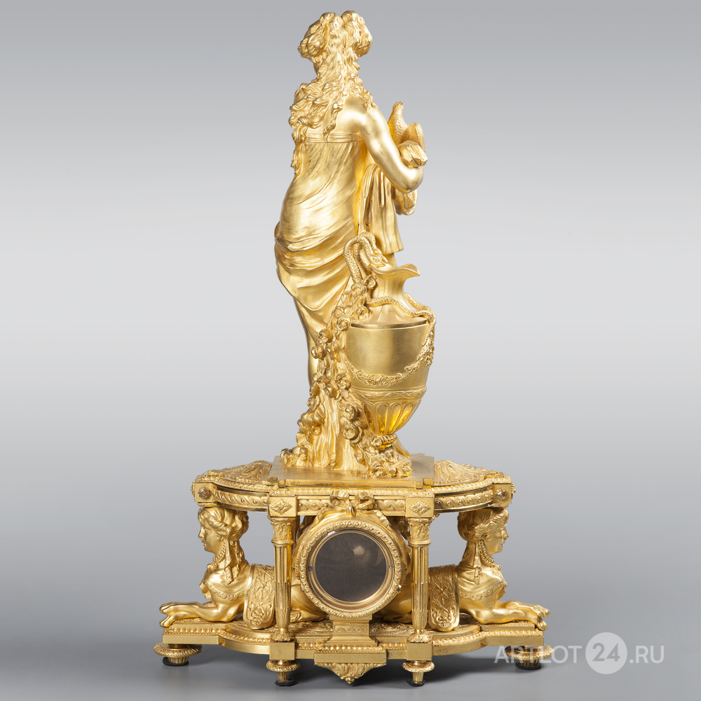 Бронза, литье, чеканка, золочение, эмалевый циферблат с синими римскими цифрами на часовых метках и арабскими цифрами минут черного цвета, на часовом механизме штамп «Lefebvre and Fils. Paris» с номером «6074»; стиль Людовика XVI, Франция, Париж, 1880-е годы, размер (в/ш/г): 67, 5 х 41 х 18 см.