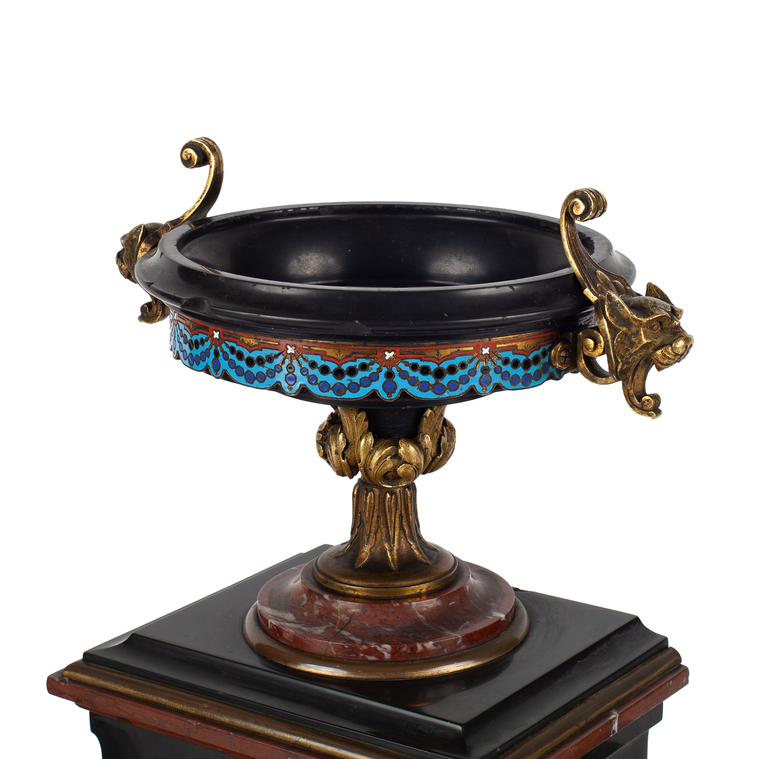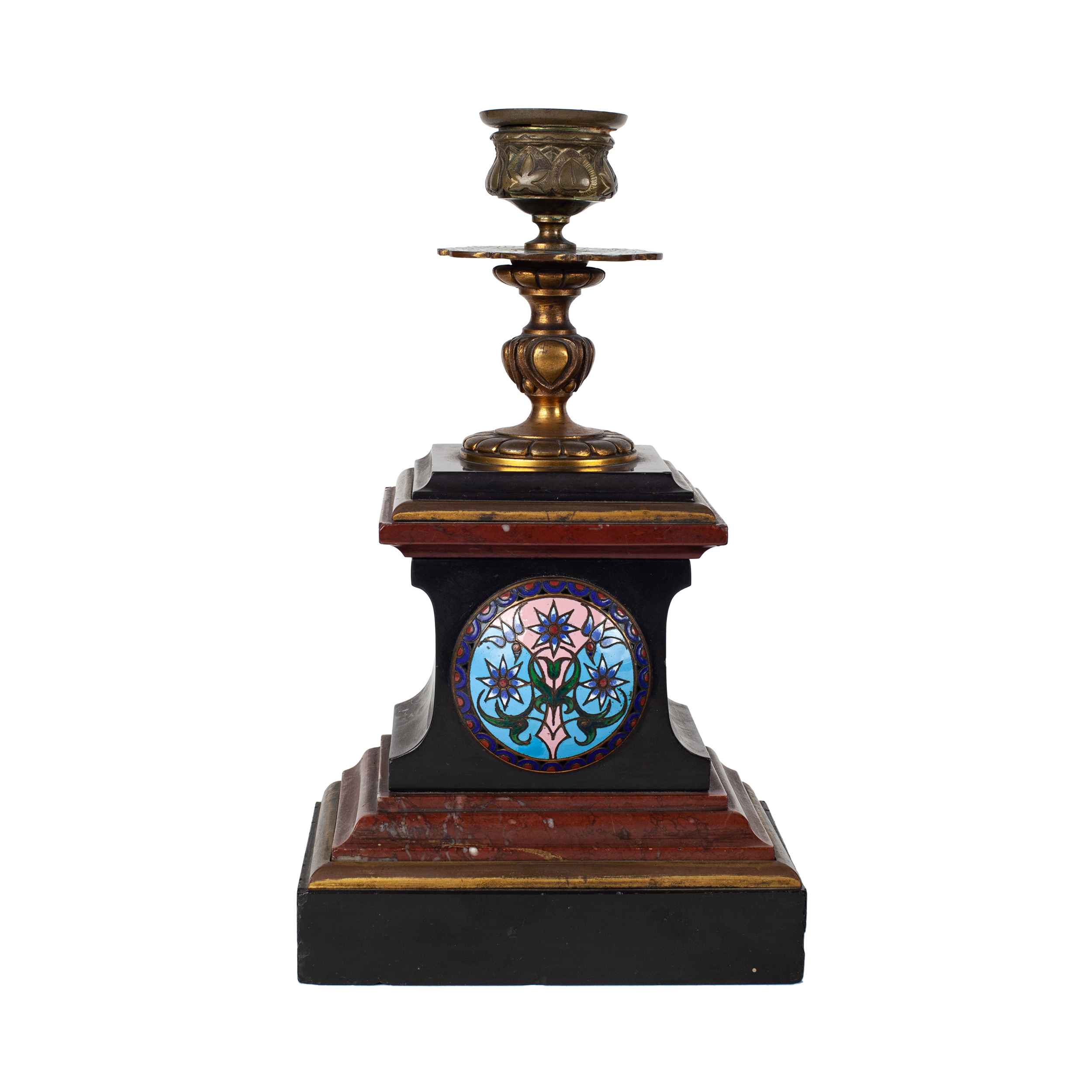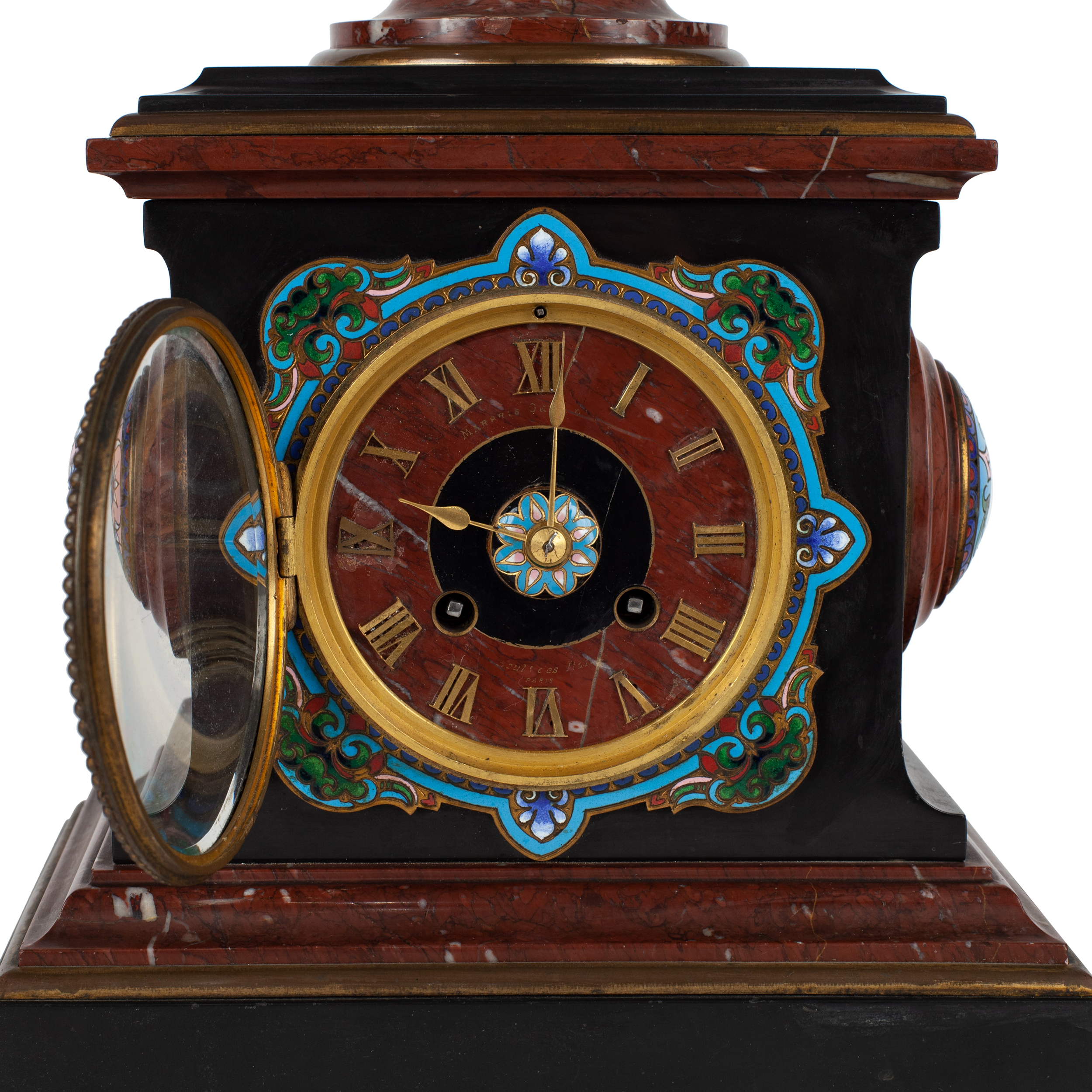 Черный бельгийский мрамор, мрамор-гриотт, бронза, литье, французская горячая эмаль в технике шамплеве (Сhampleve enamel), циферблат с римскими цифрами и надписью «Marbres et Onyx d'Algérie» и «Paris», на плате часового механизма медаль «Japy Freres et Cie Med. D'Honn. 1855» (почётная медаль за выставку 1855 года), часовая мастерская Братьев Жапи, автор корпуса - скульптор Эжен Корню (Eugène Cornu, 1827-1899), фабрика «La Compagnie des Marbres et Onyx d'Algérie», Франция, 1875-1880 годы, размер часов (в/ш): 40 х 15 см. С маятниковым механизмом и боем