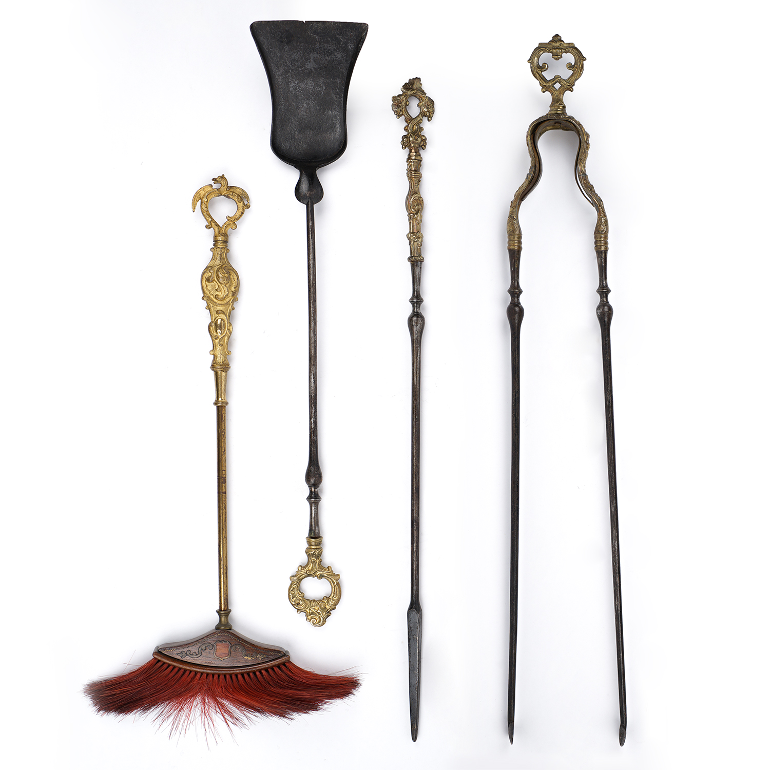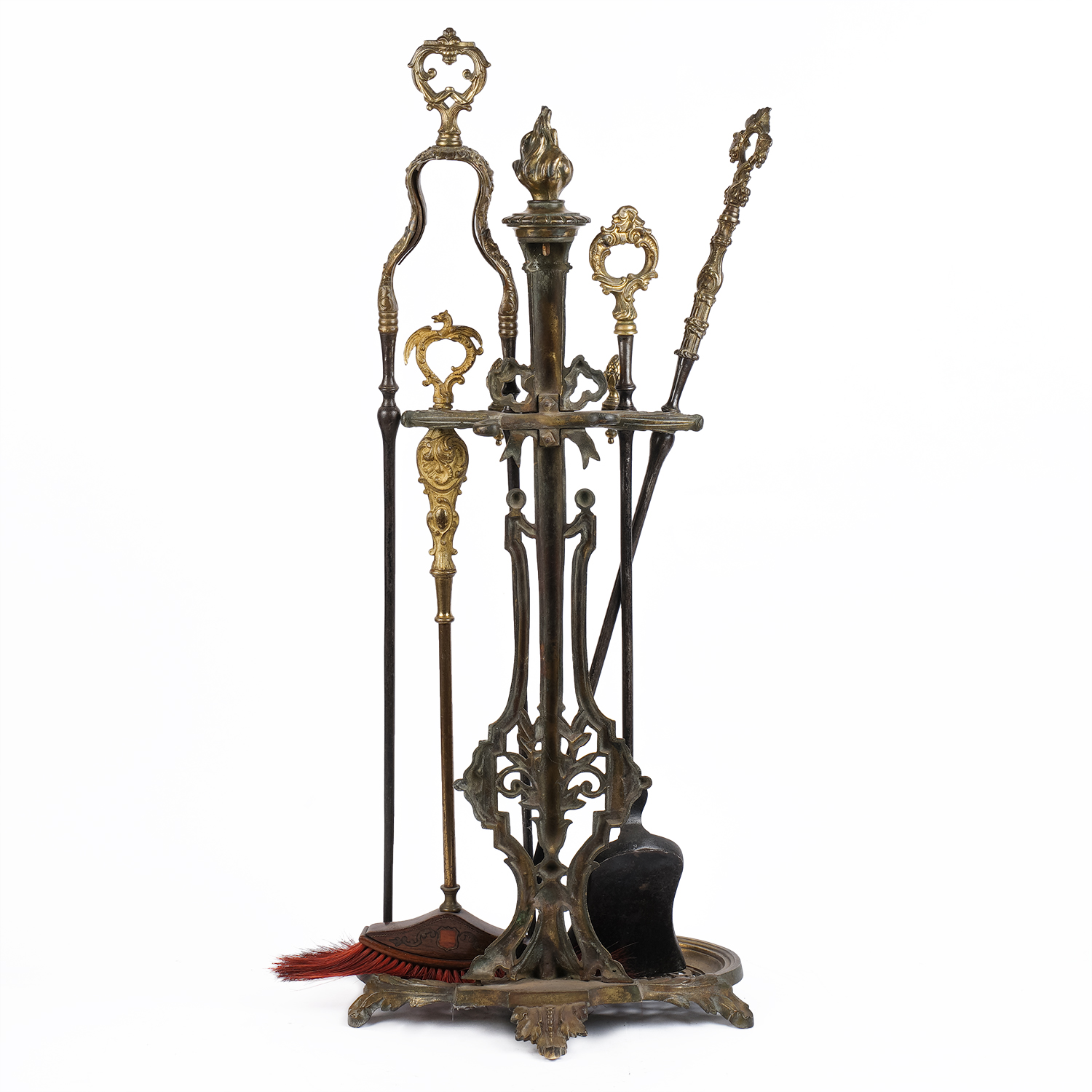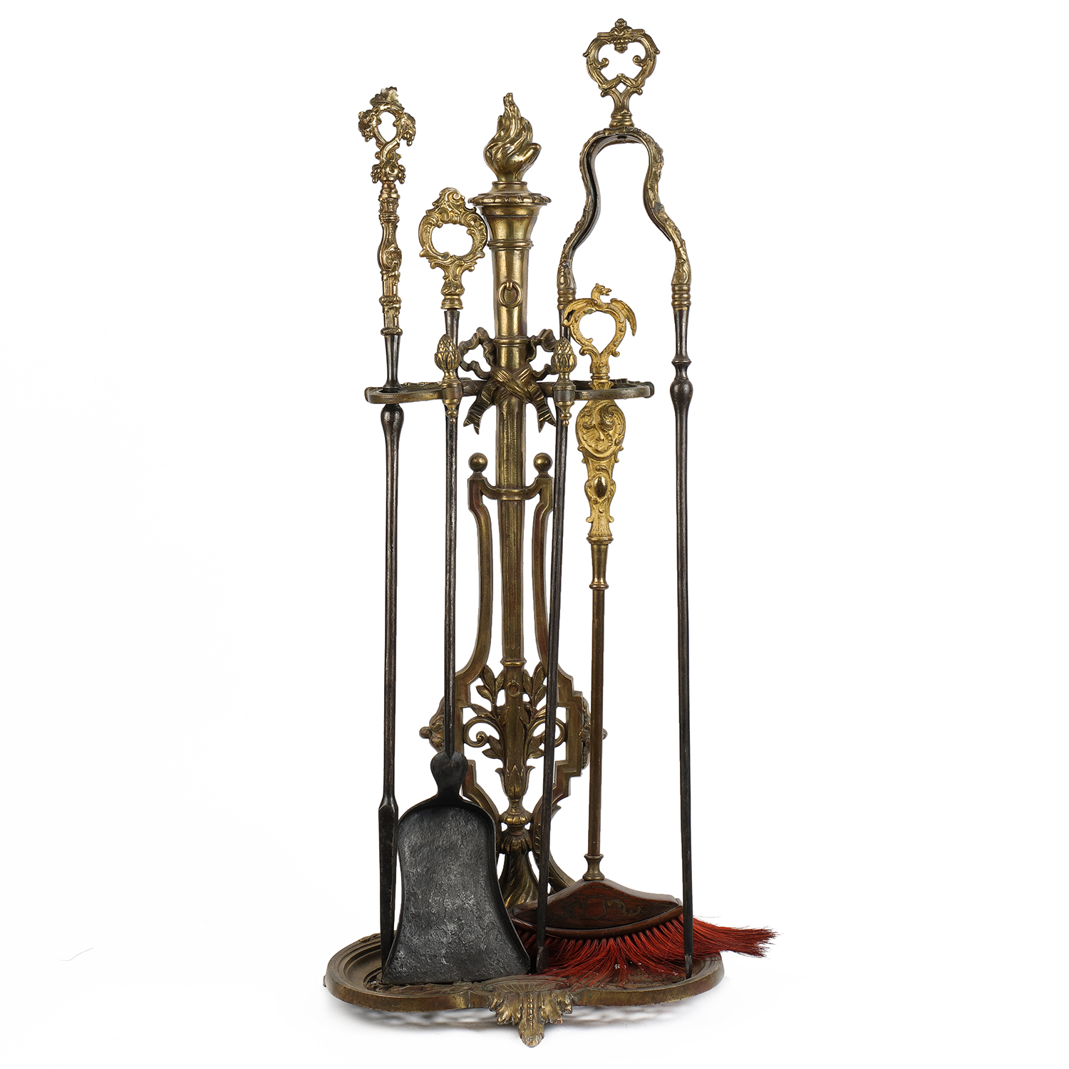 Принадлежности для чистки камина из 5 предметов: подставка рельефная, совок, метелка, кочерга, щипцы. Бронза, литье, кованое железо, Западная Европа, XIX век. Размеры: