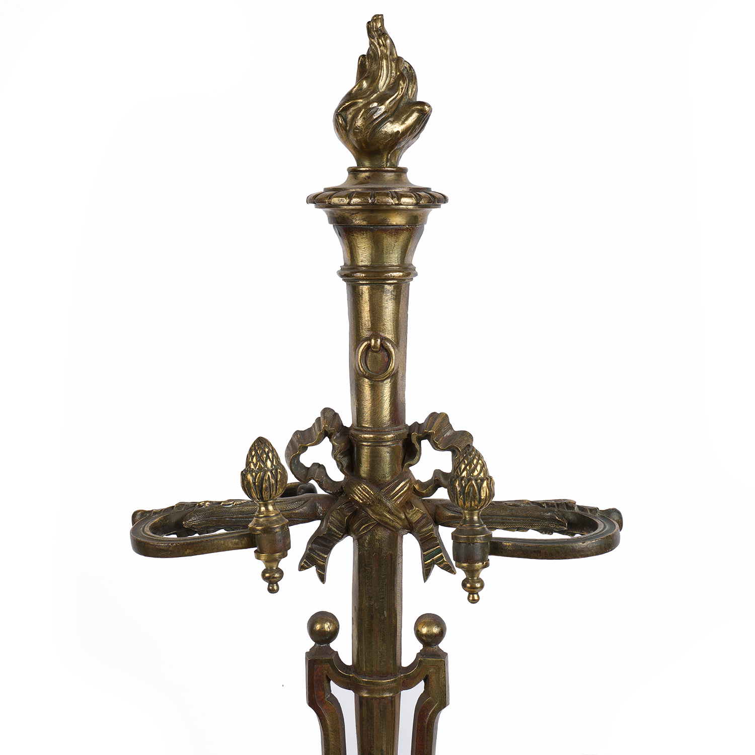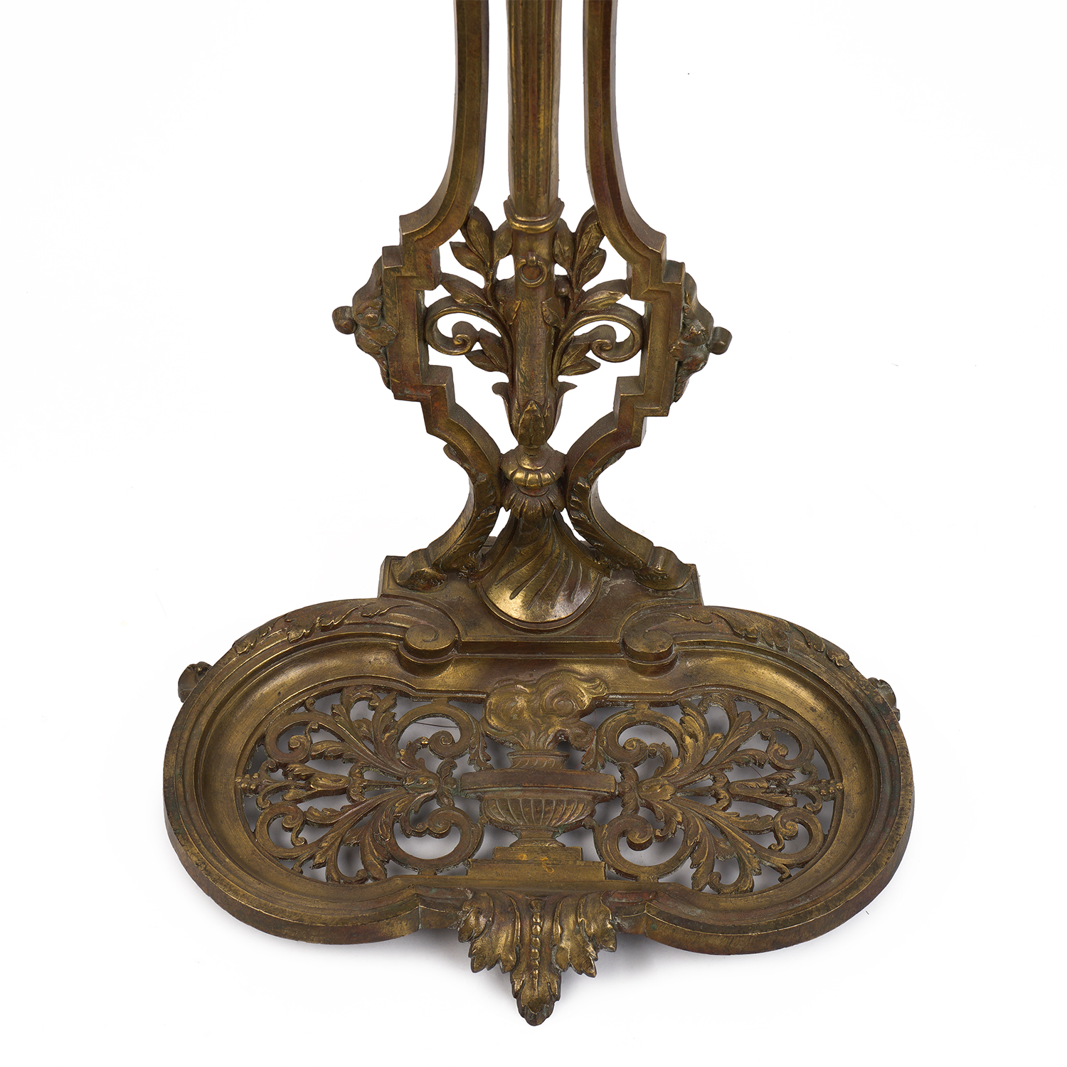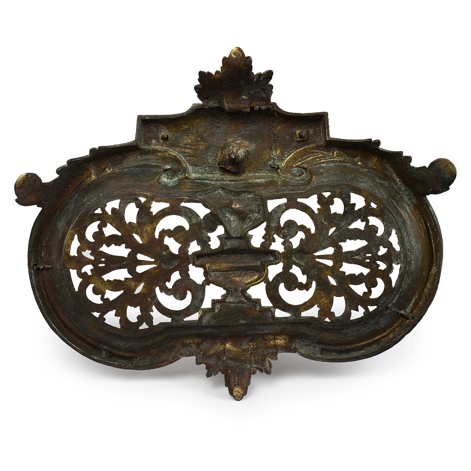 Принадлежности для чистки камина из 5 предметов: подставка рельефная, совок, метелка, кочерга, щипцы. Бронза, литье, кованое железо, Западная Европа, XIX век. Размеры: