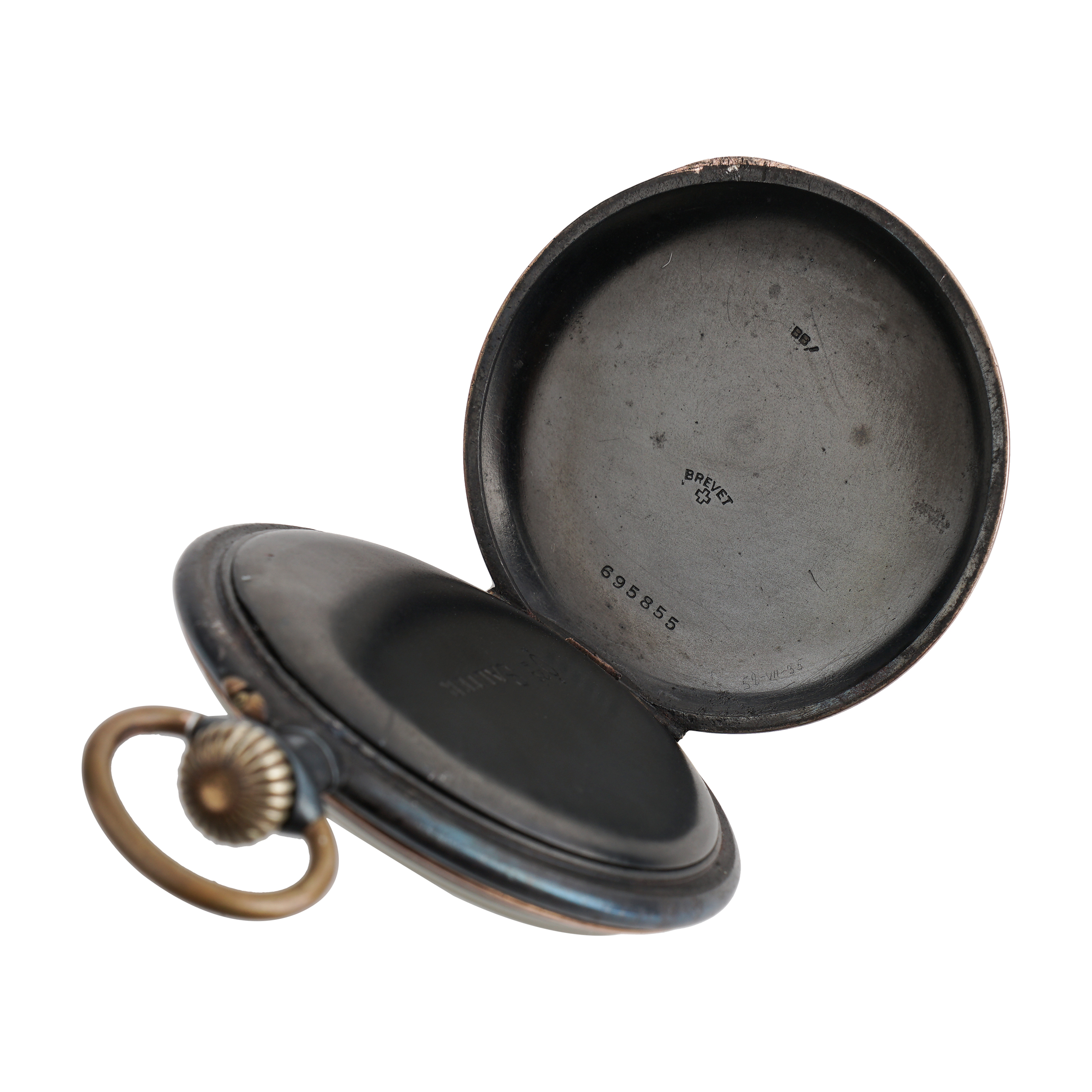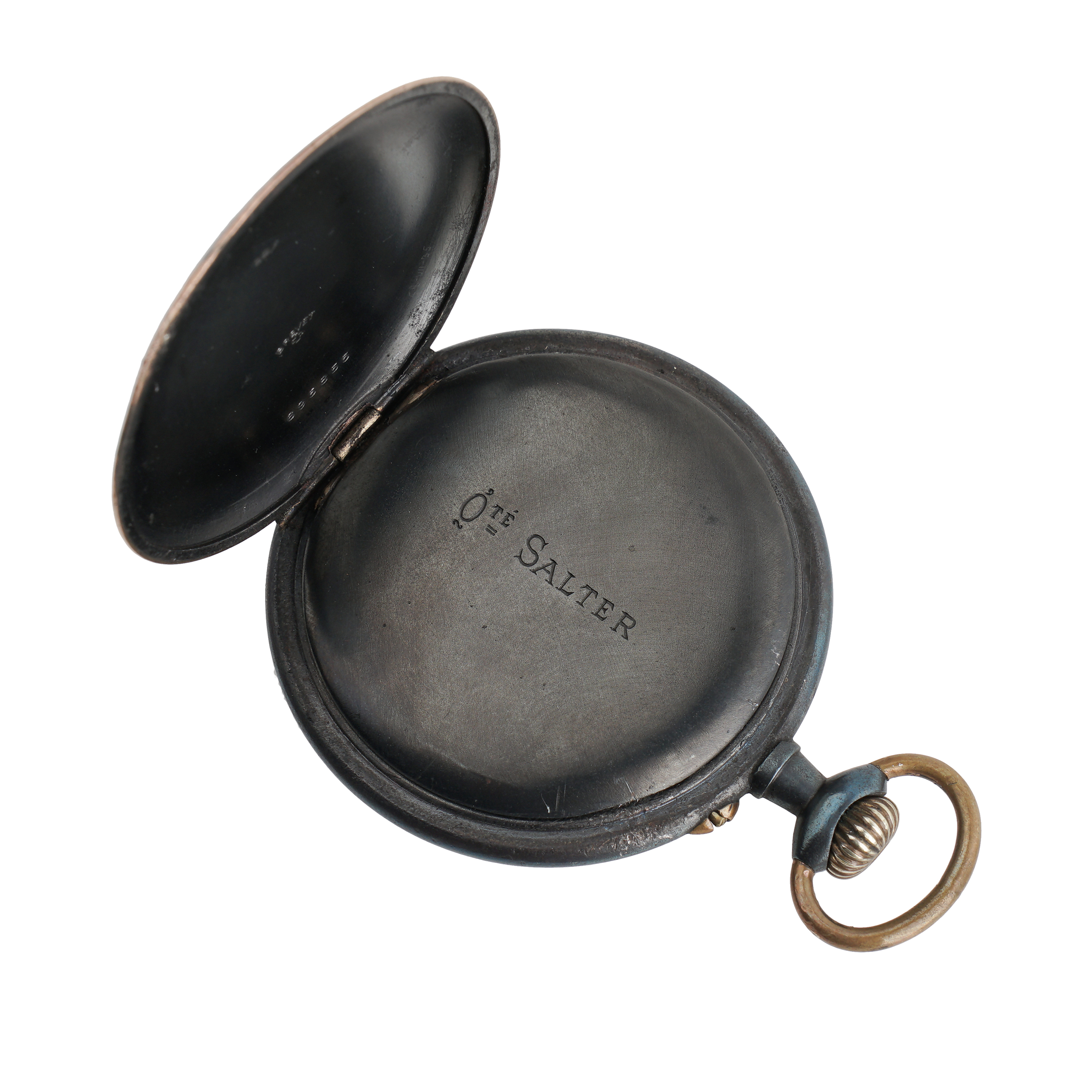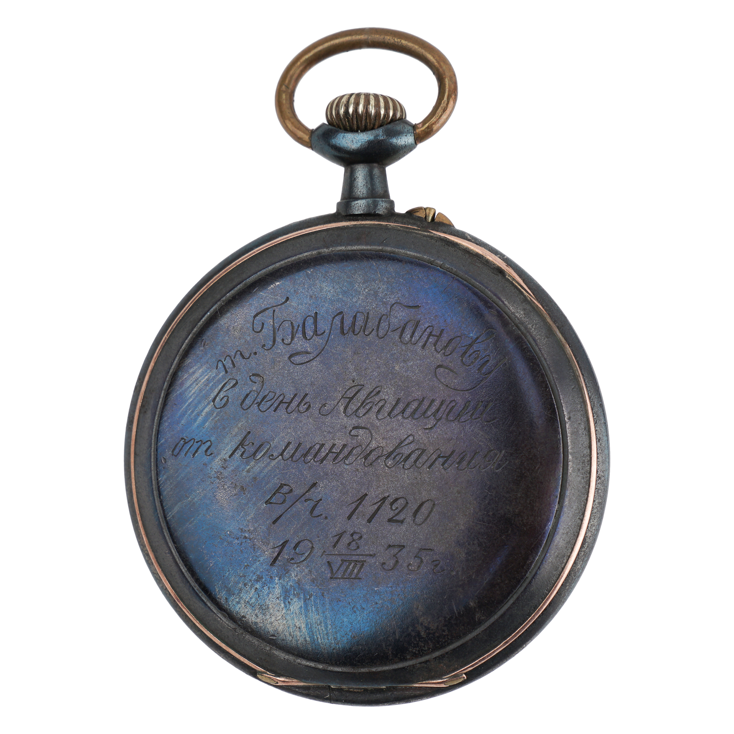 Металл, гравировка, чернение, тип корпуса «мыло», ремонтуар. На задней крышке гравированная надпись «т. Балабанову в день Авиации от командования в/ч 1120 1935 г.» Salter, Германия, начало ХХ века, размер – 54 мм
