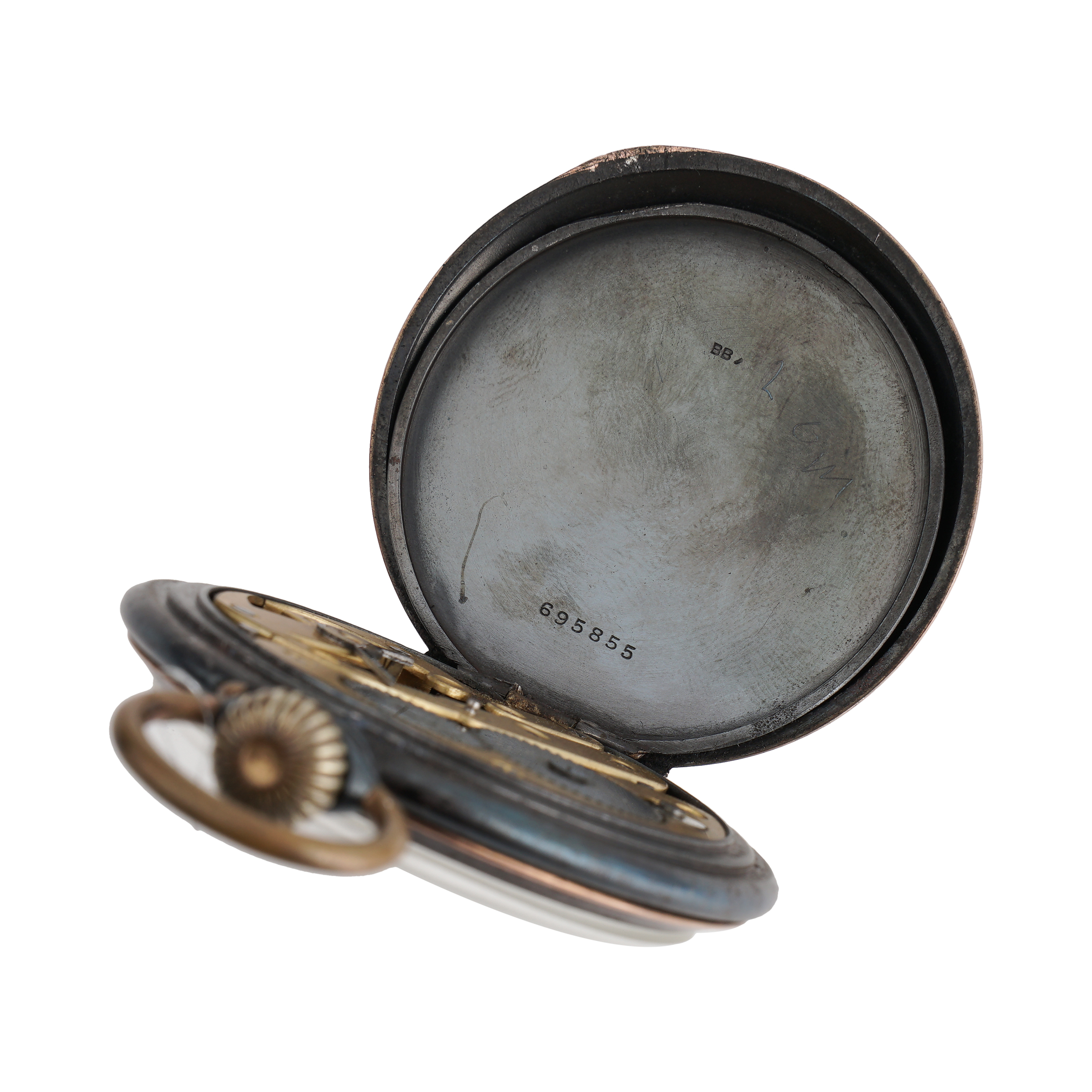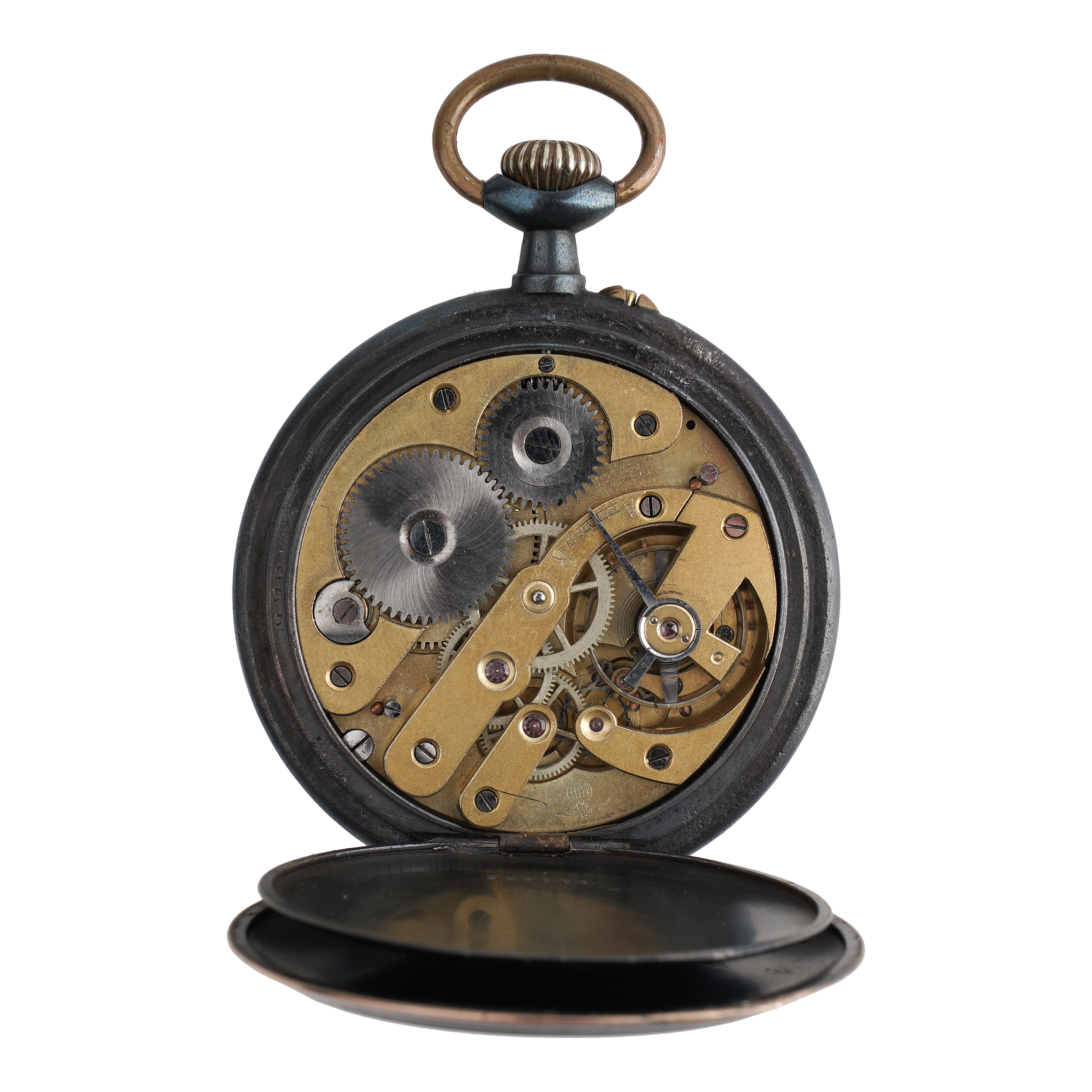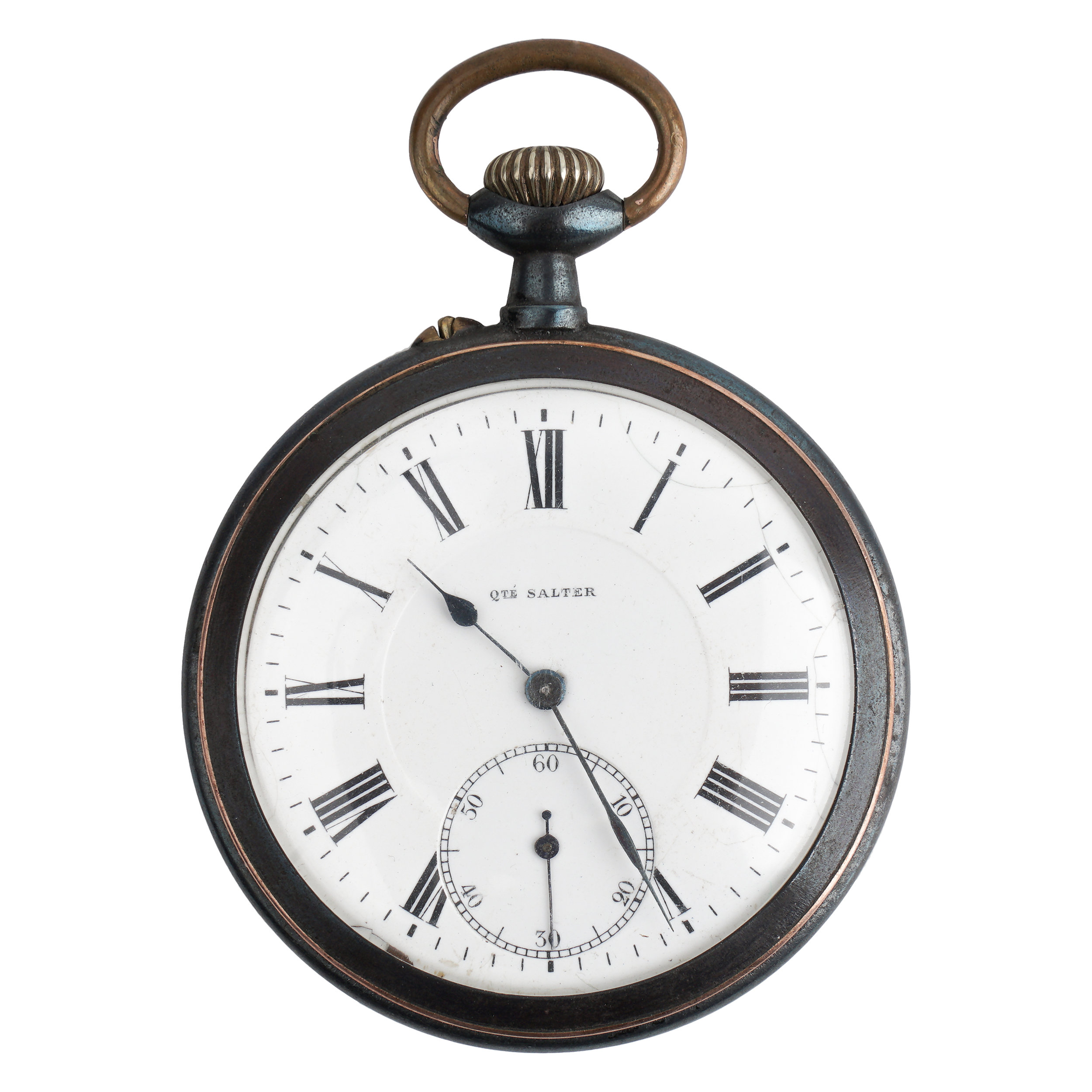 Металл, гравировка, чернение, тип корпуса «мыло», ремонтуар. На задней крышке гравированная надпись «т. Балабанову в день Авиации от командования в/ч 1120 1935 г.» Salter, Германия, начало ХХ века, размер – 54 мм