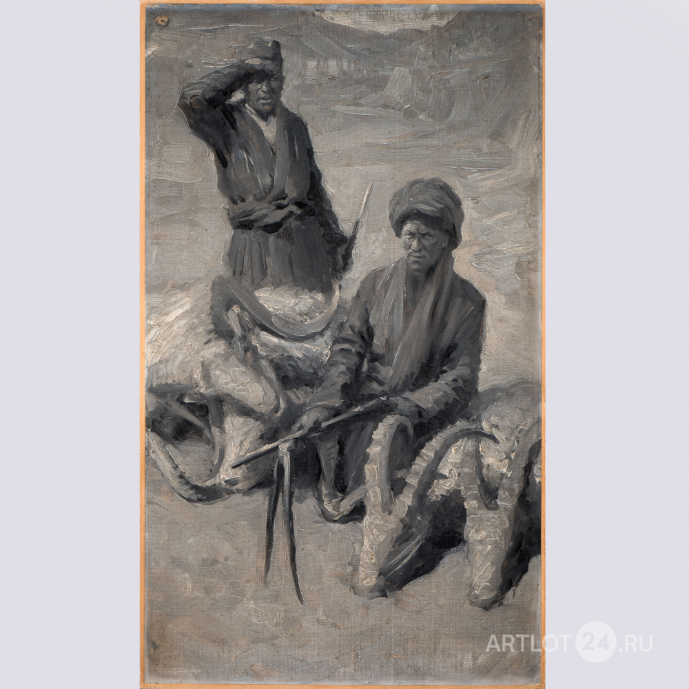 Памирские киргизы после охоты с трофеями. Картон, масло, техника гризайль, на оборотной стороне этикетка магазина И.Т. Варгасова, неизвестный художник, Россия, около 1900 - 1912 гг., размер: 75 х 43 см, в раме: 85 х 54,5 см