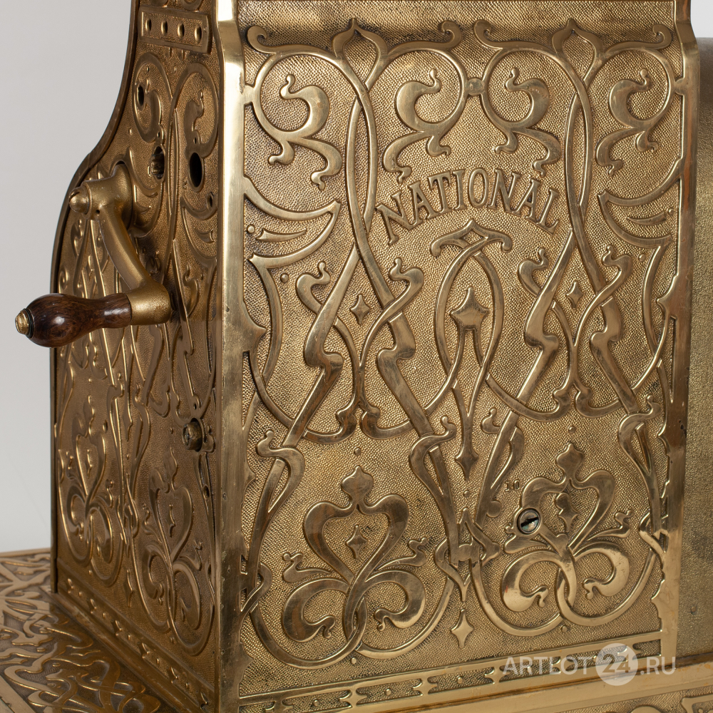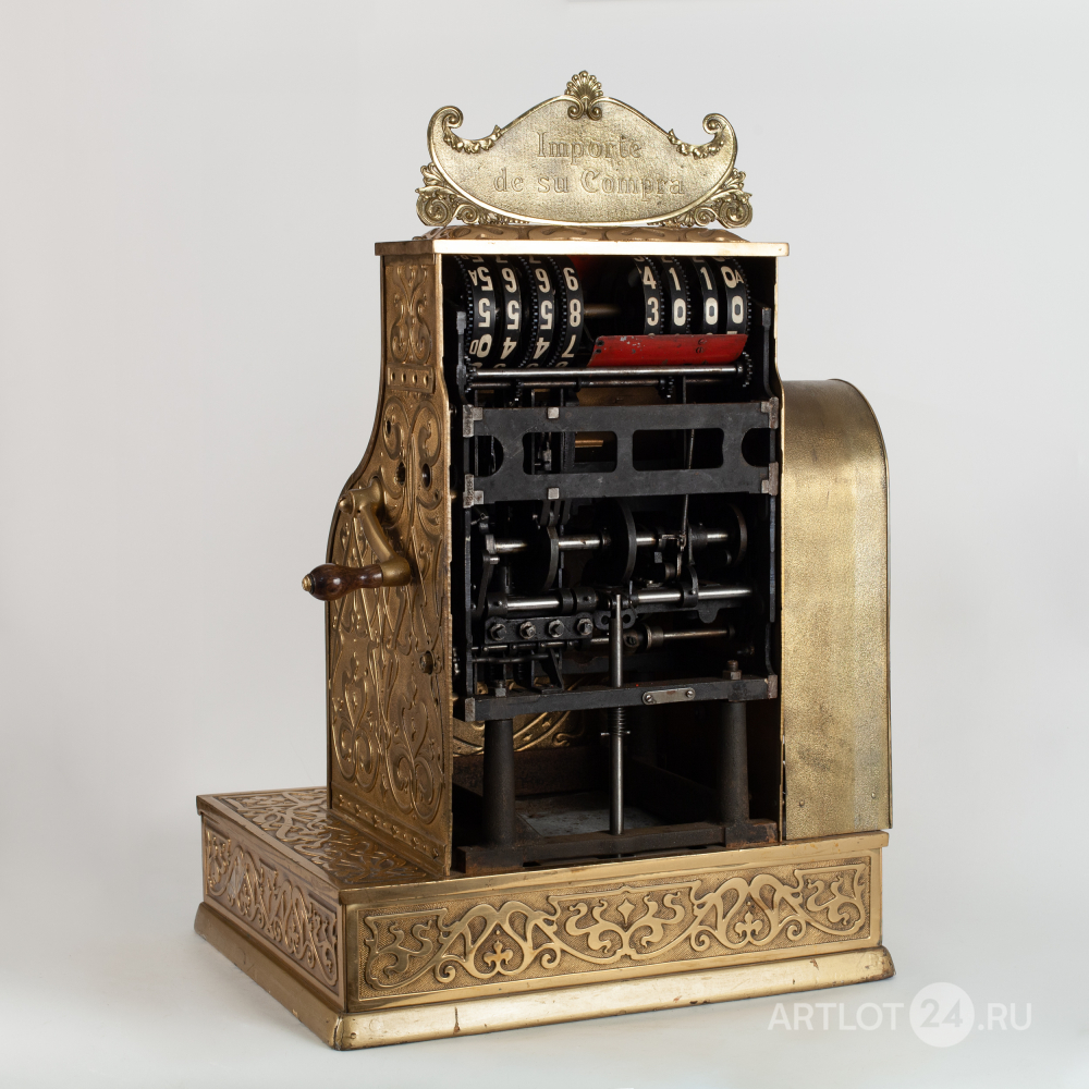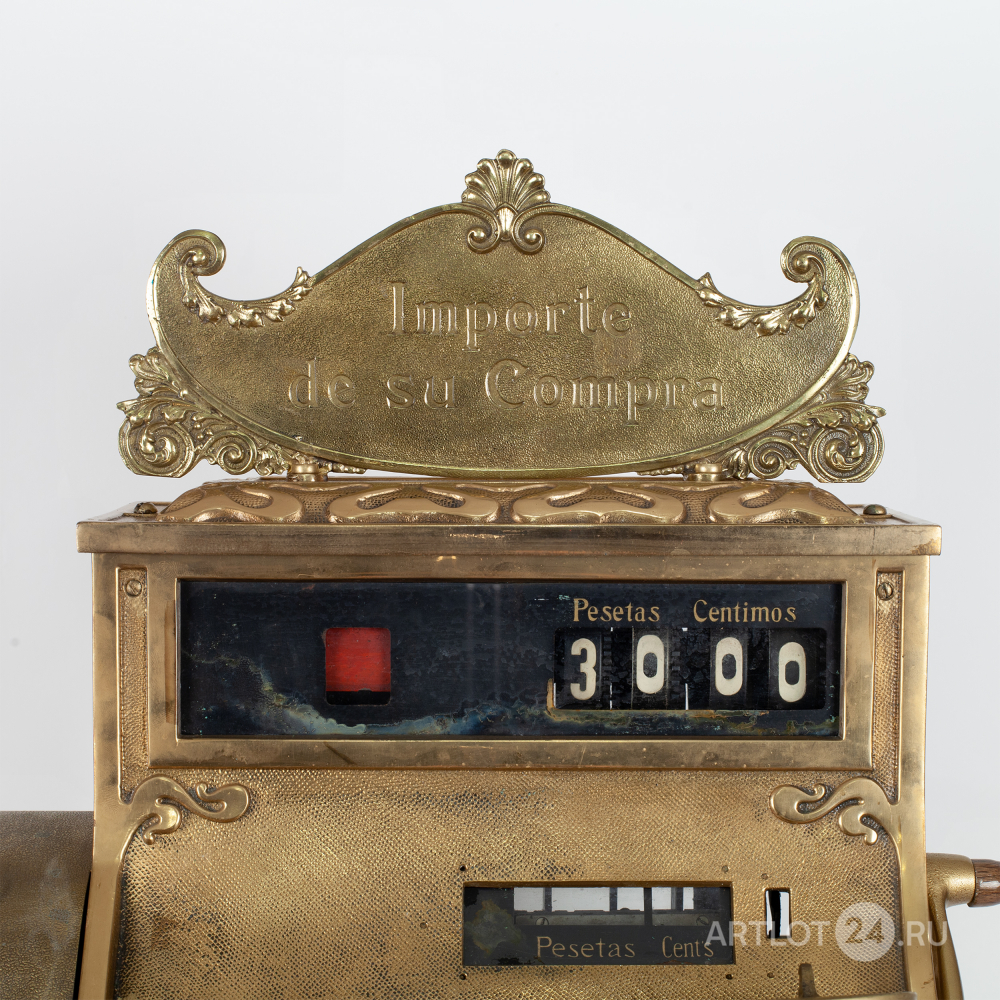 Для испанских песет и сантимов. Бронза, металл, литье, штамп, выколотка, выдвижной деревянный денежный ящик, на верхней части надпись «Importe de su Compra» - «сумма покупки», на шильде № модели «642» и серийный номер «1881229», Национальная кассовая компания Джона Паттерсона («National Cash Register Company»), начало 1910-х годов, экспортный предмет для Испании, сделанный в Соединенных Штатах Америки, размер (в/ш/г): 73 х 46 х 40 см