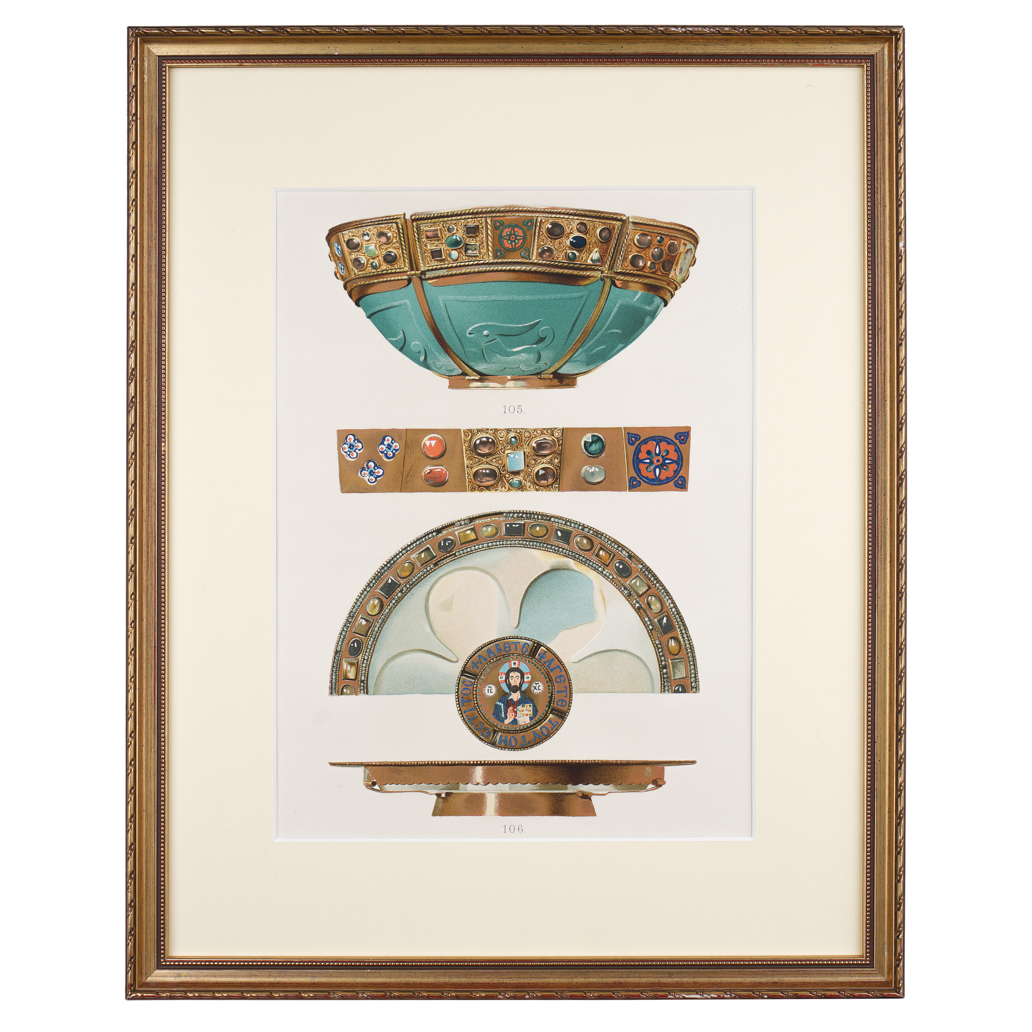 XLVIII - 105. Бирюзовая чаша Хорасан, 106. Алебастровый патен. Хромолитография является частью серии литографий из монументального труда «Il Tesoro Di San Marco in Venezia» редактора и издателя иллюстрированных книг Фердинандо Онганиа. Бумага, типографская печать, цветная литография, под изображением надписи «Giorgio Canella Fece/ Ferd. Organia Edit/ Propriede Artistica /Сromolit A. Osterreich», Италия, Венеция. Размеры: 26 х 19.5 см (оттиск), 36 х 28 см (лист), 40х31 см (в раме)