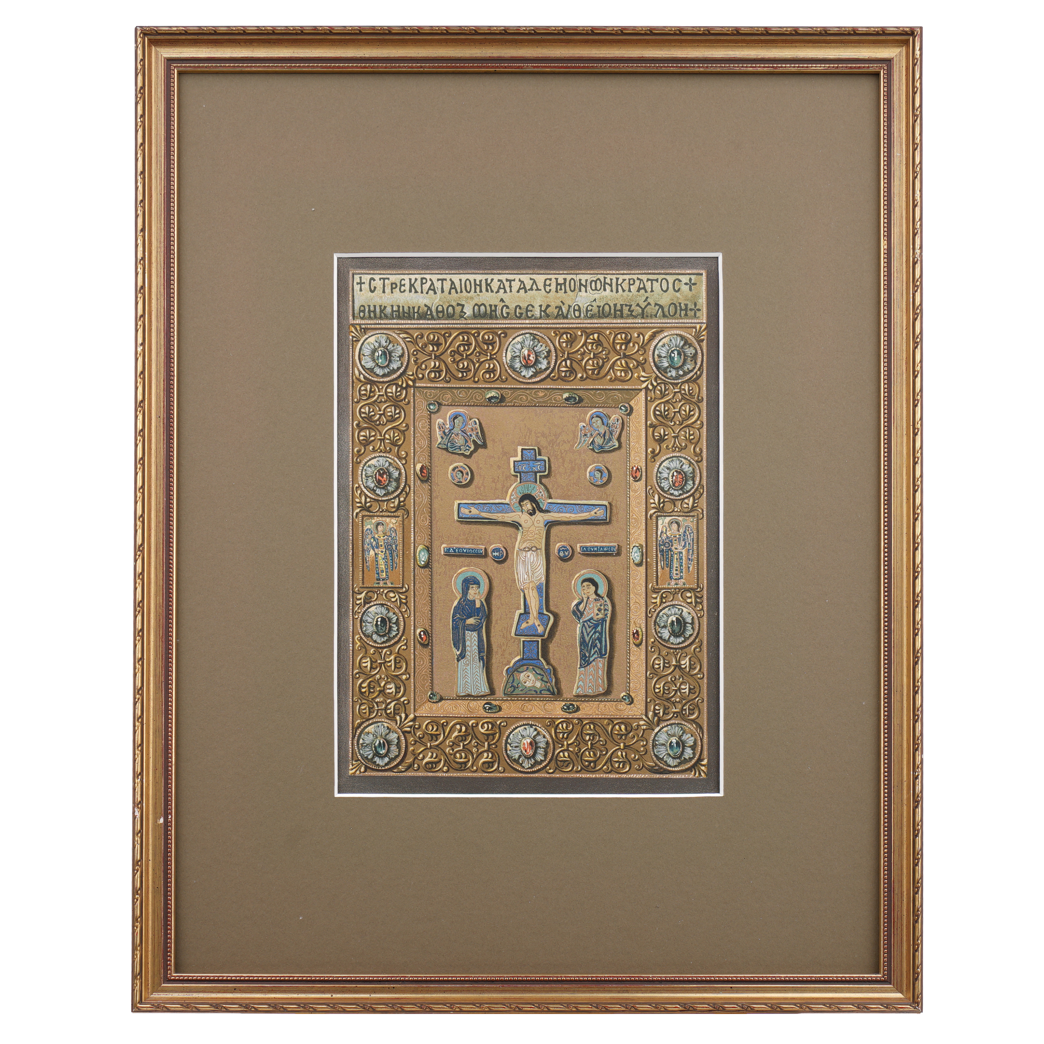 Фрагмент иконы с изображением Распятия с избранными святыми. Хромолитография является частью серии литографий из монументального труда «Il Tesoro Di San Marco in Venezia» редактора и издателя иллюстрированных книг Фердинандо Онганиа. Бумага, типографская печать, цветная литография, под изображением надписи: «N. Girotto dip/ Ferd Ongania Edit/ Сromolit A. Osterreich», Италия. Размеры: 26 х 19.5 см (оттиск), 36 х 28 см (лист), 40х31 см (в раме).