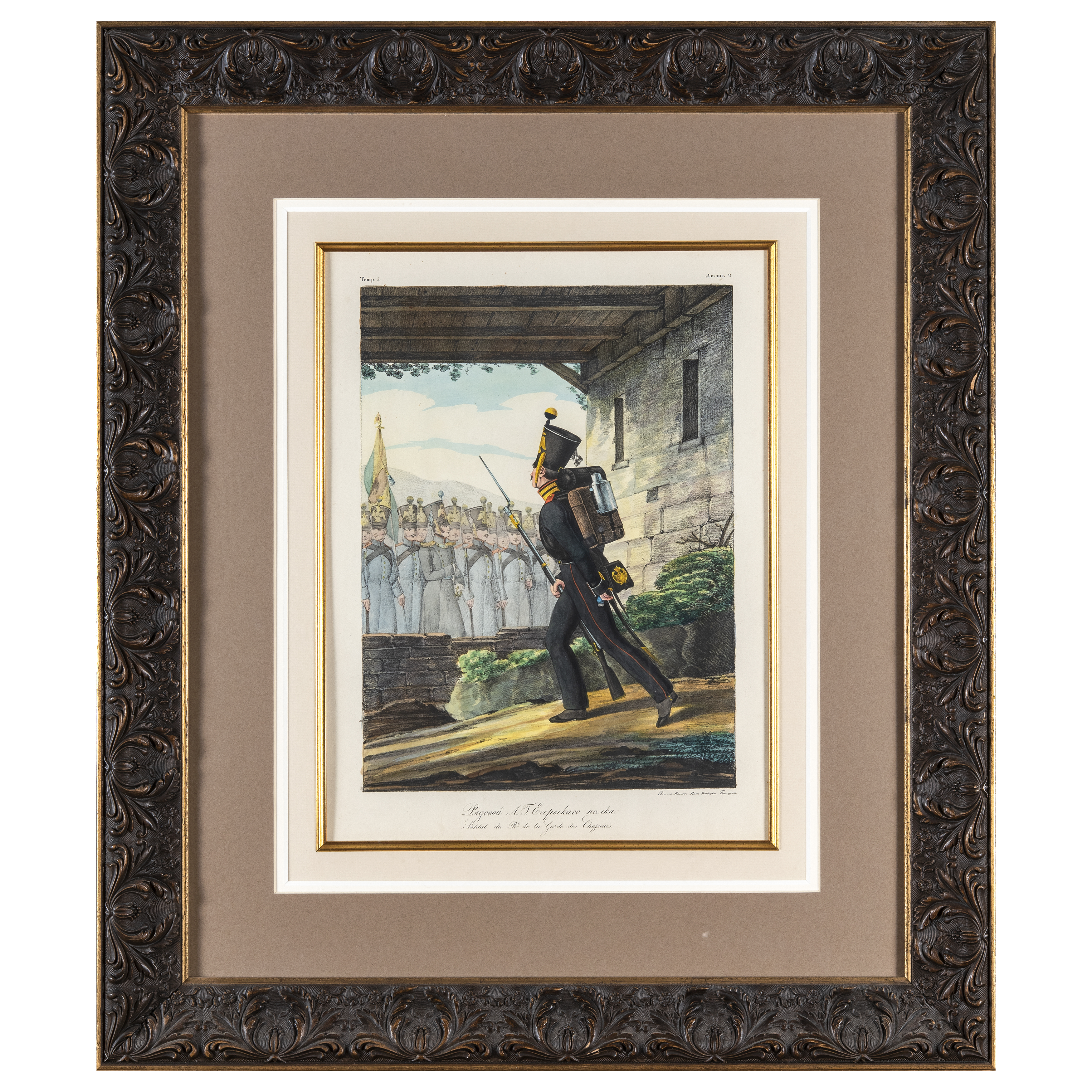 Военная графика. Из серии «Коллекция армейской формы Российской Империи» (Collection Des Uniformes de l'Armée Imperiale Russe). Бумага, литография, акварель, под изображением справа внизу подпись: «Рис на Камнъ Инж. Кондукт. Белоусовъ» под изображением внизу надпись на русском и французском языке «Soldat du re la des Chasseurs», Россия, первая половина XIX века. Размеры: изображение 34х25 см, листа 40 х30 см, в рамке 70 x 61 см.