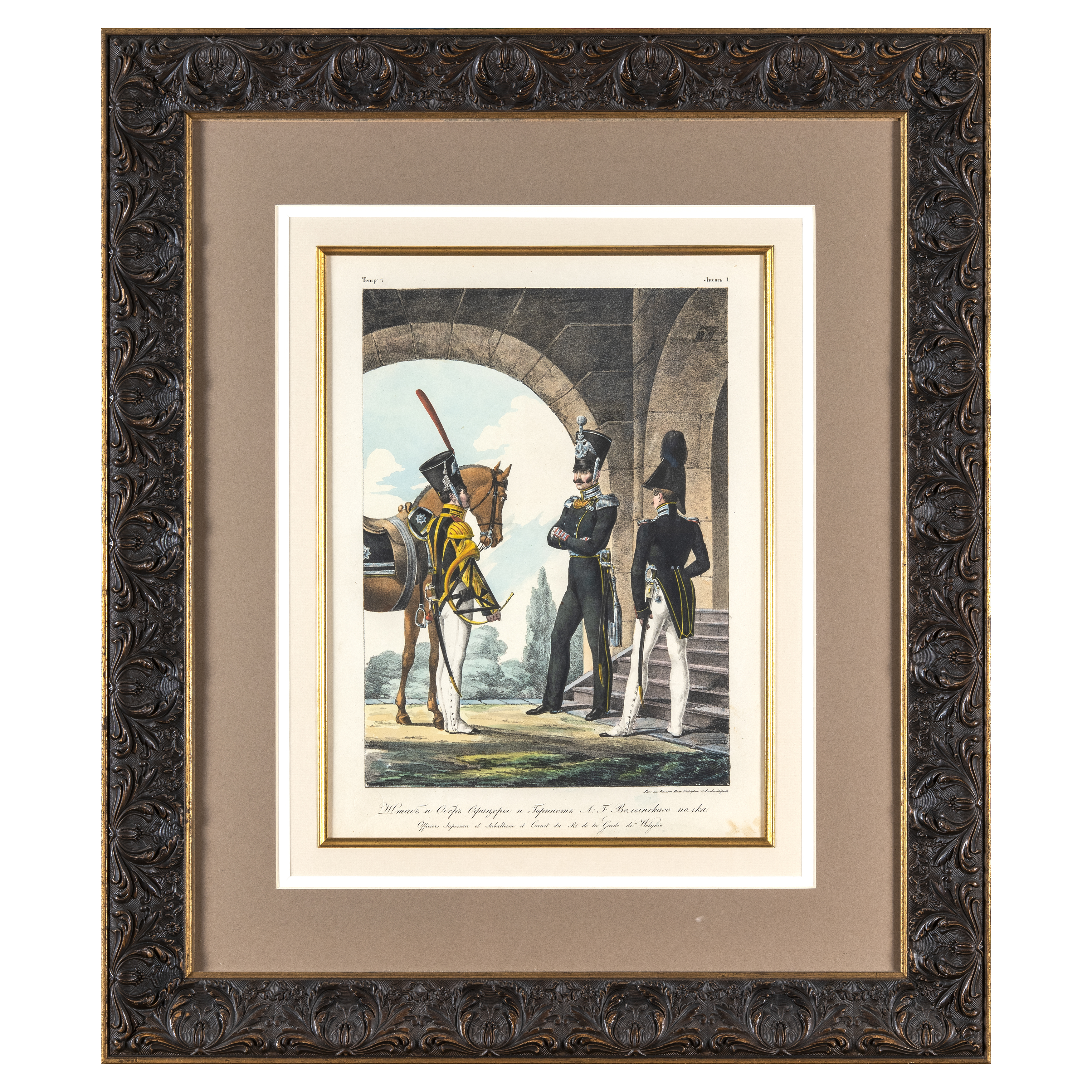 Военная графика. Из серии «Коллекция армейской формы Российской Империи» (Collection Des Uniformes de l'Armée Imperiale Russe). Бумага, типографская печать, литография раскрашенная, под изображением справа внизу подпись: «Рис на Камнъ Инж. Кондукт. Александров», под изображением внизу надпись на русском и французском языке «Officiers Suferieur et Subalterne et Cornet du Rt.de la Garde de Wolynie», лист 1 тетр. 5. Россия, первая половина XIX века. Размеры: изображение 34х25 см, листа 40 х30 см, в рамке 70 x 61 см.