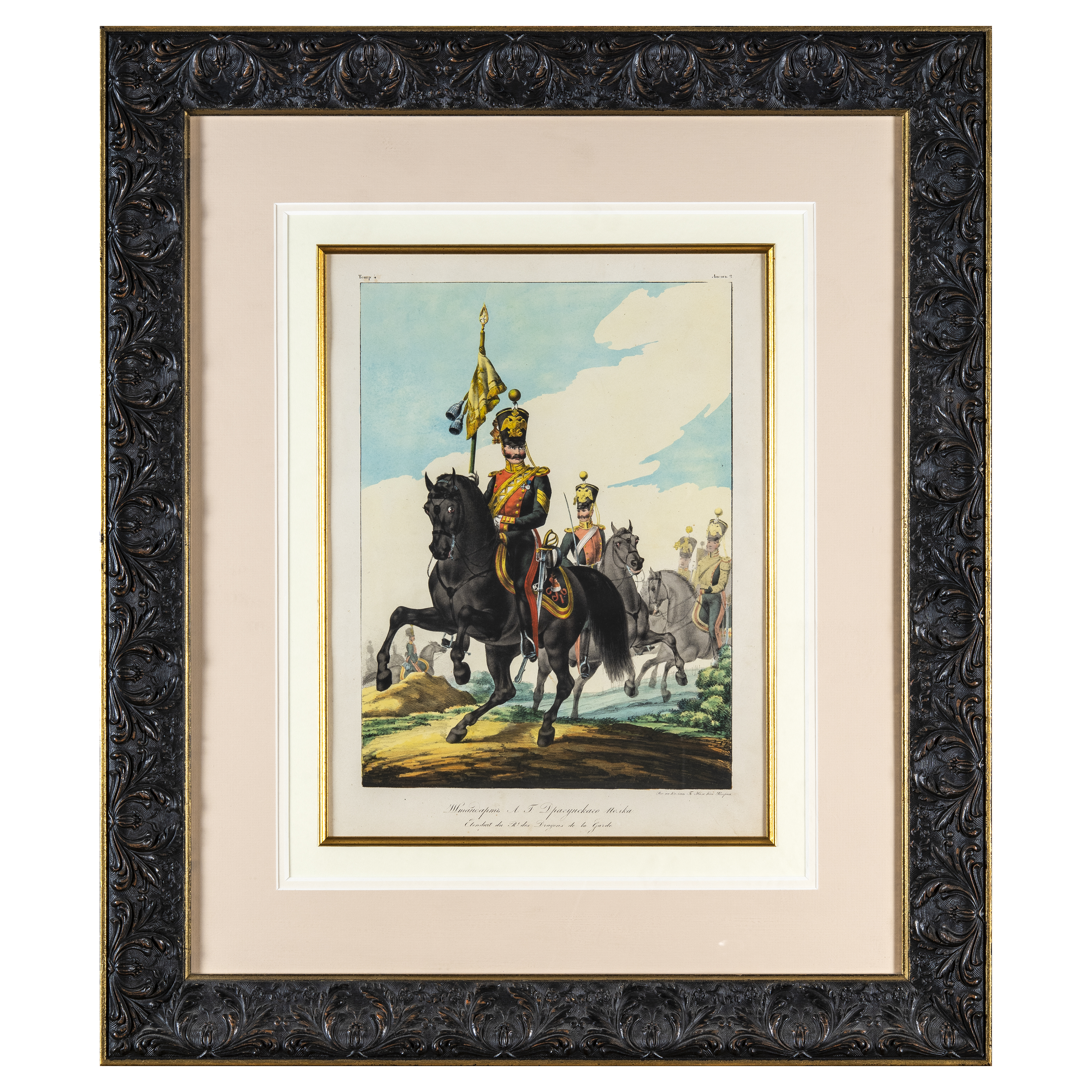 Военная графика. Из серии «Коллекция армейской формы Российской Империи» (Collection Des Uniformes de l'Armée Imperiale Russe).Бумага, типографская печать, литография раскрашенная, акварель, под изображением гравированные надписи на русском и французском языке, справа внизу подпись: «Рис. На Камне Гв. Инж. Шт. Кап: Федоровъ», Россия, первая половина XIX века. Размеры: изображение 34х25 см, листа 40 х30 см, в рамке 70 x 61 см.
