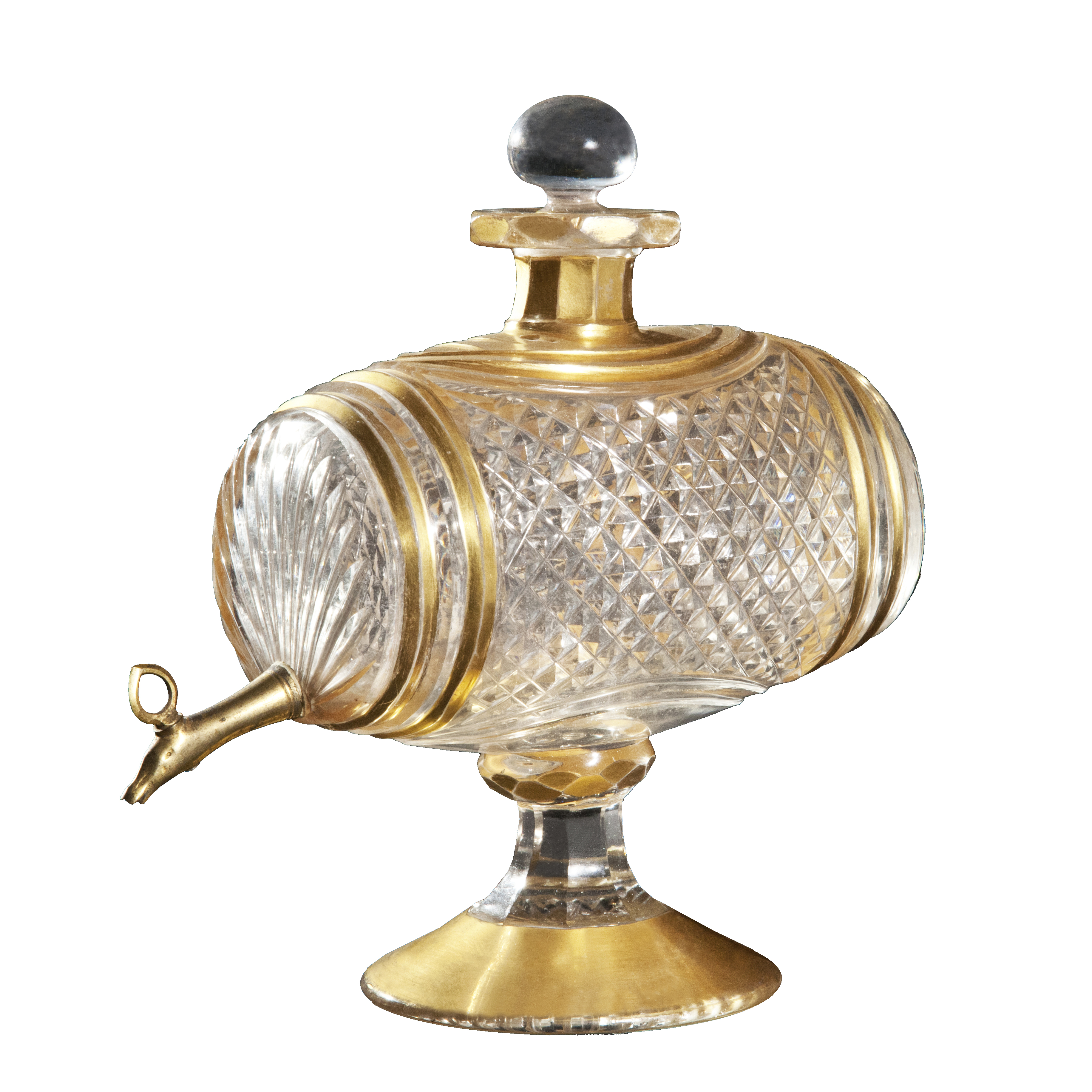 Прозрачный бесцветный хрусталь, выдувание, литье, алмазное гранение, шлифовка, полировка, золочение; латунь; высота - 17,5 см.