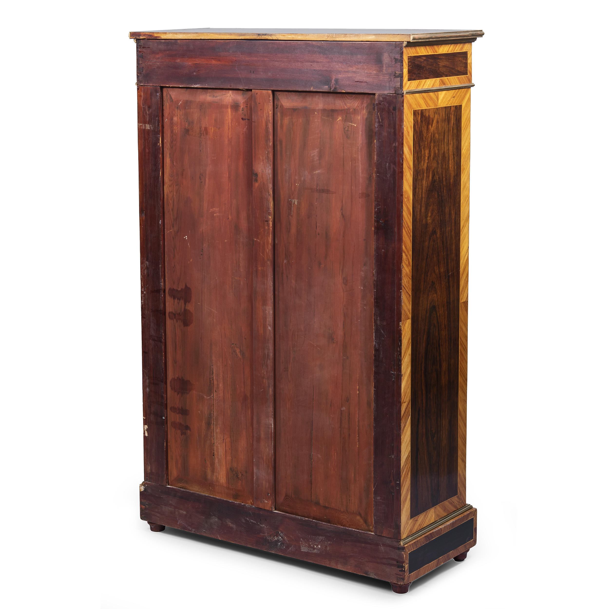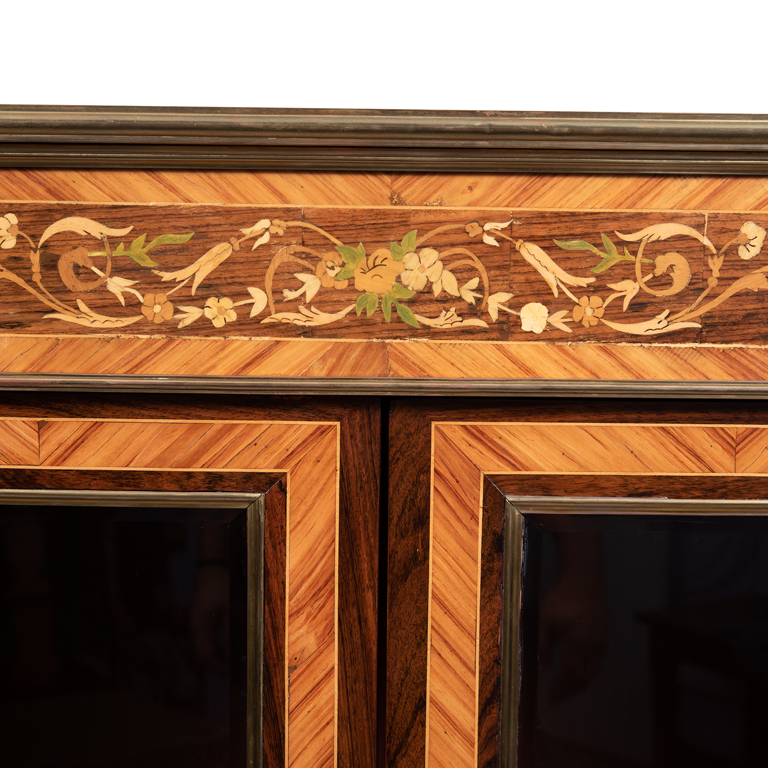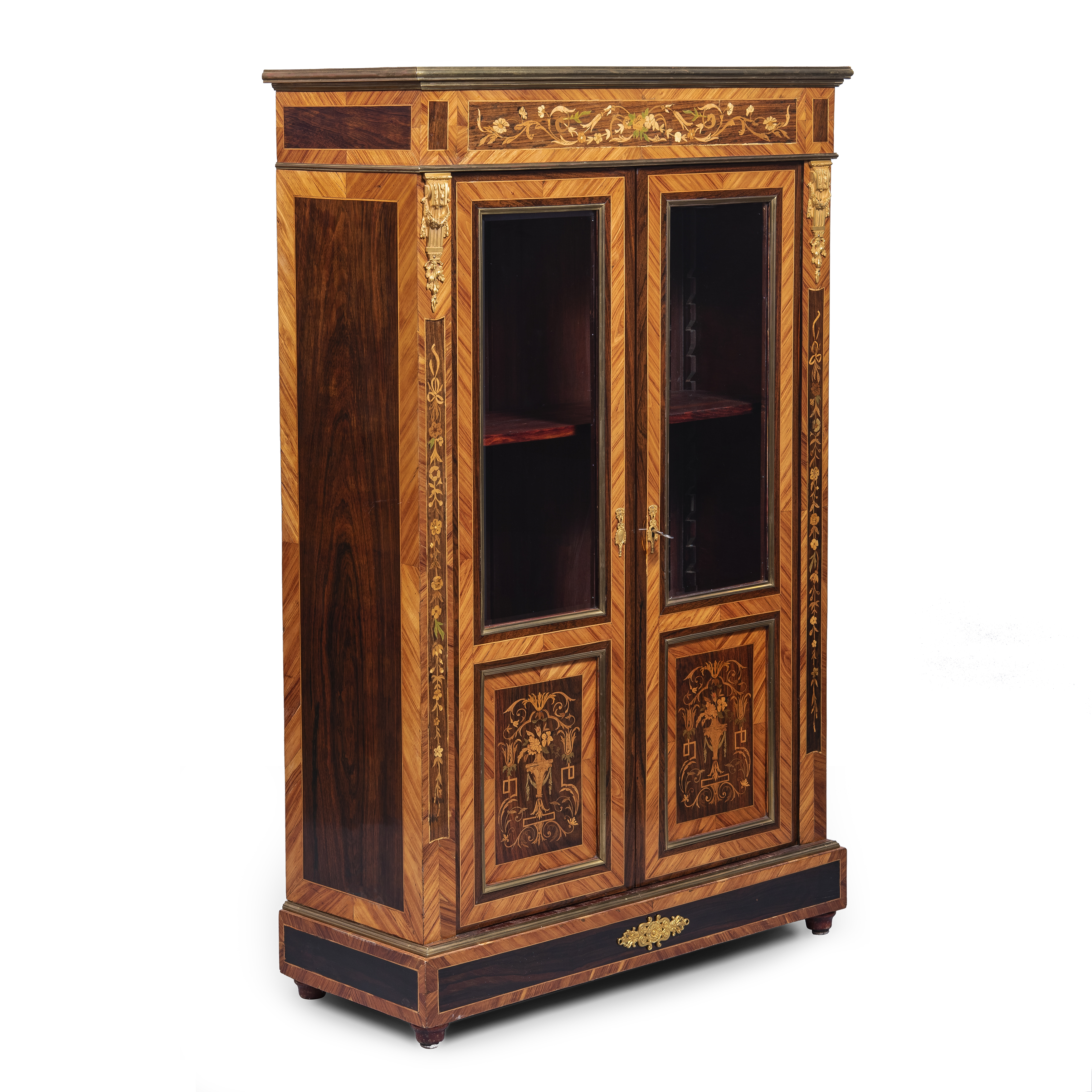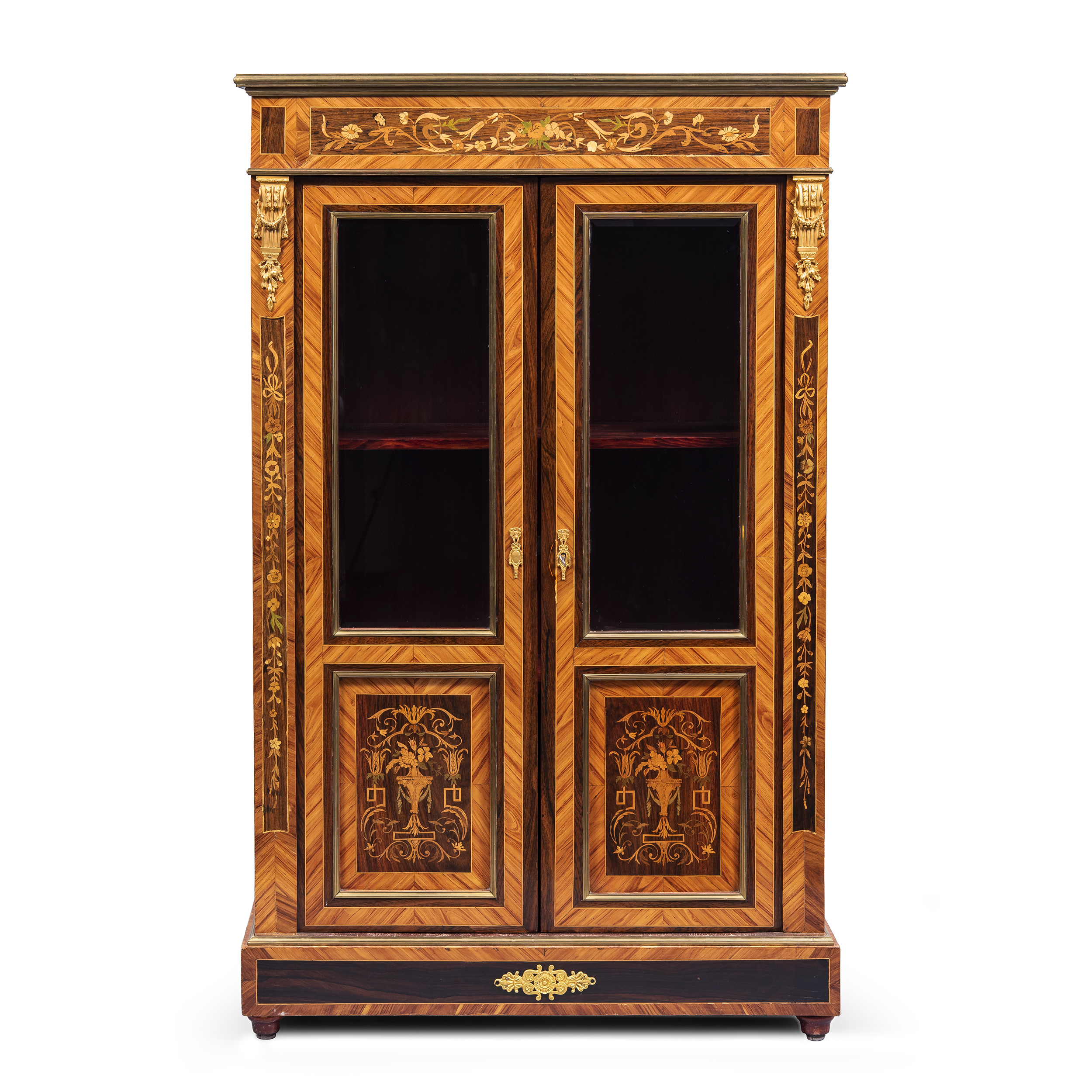 Орех, палисандр, маркетри с использованием фруктовых пород деревьев, стекло, бронза, литье, золочение, размеры: 151 х 90 х 35 см.