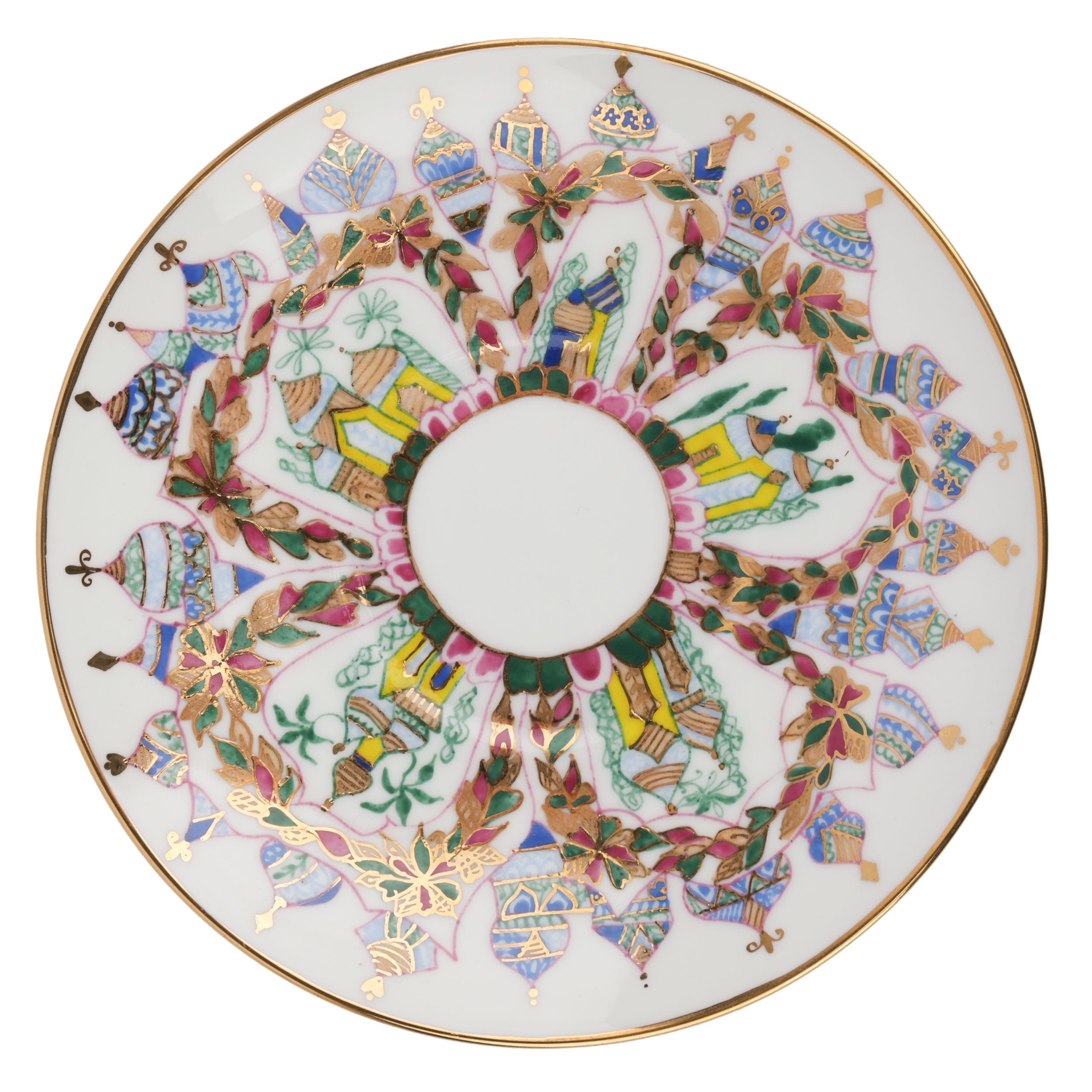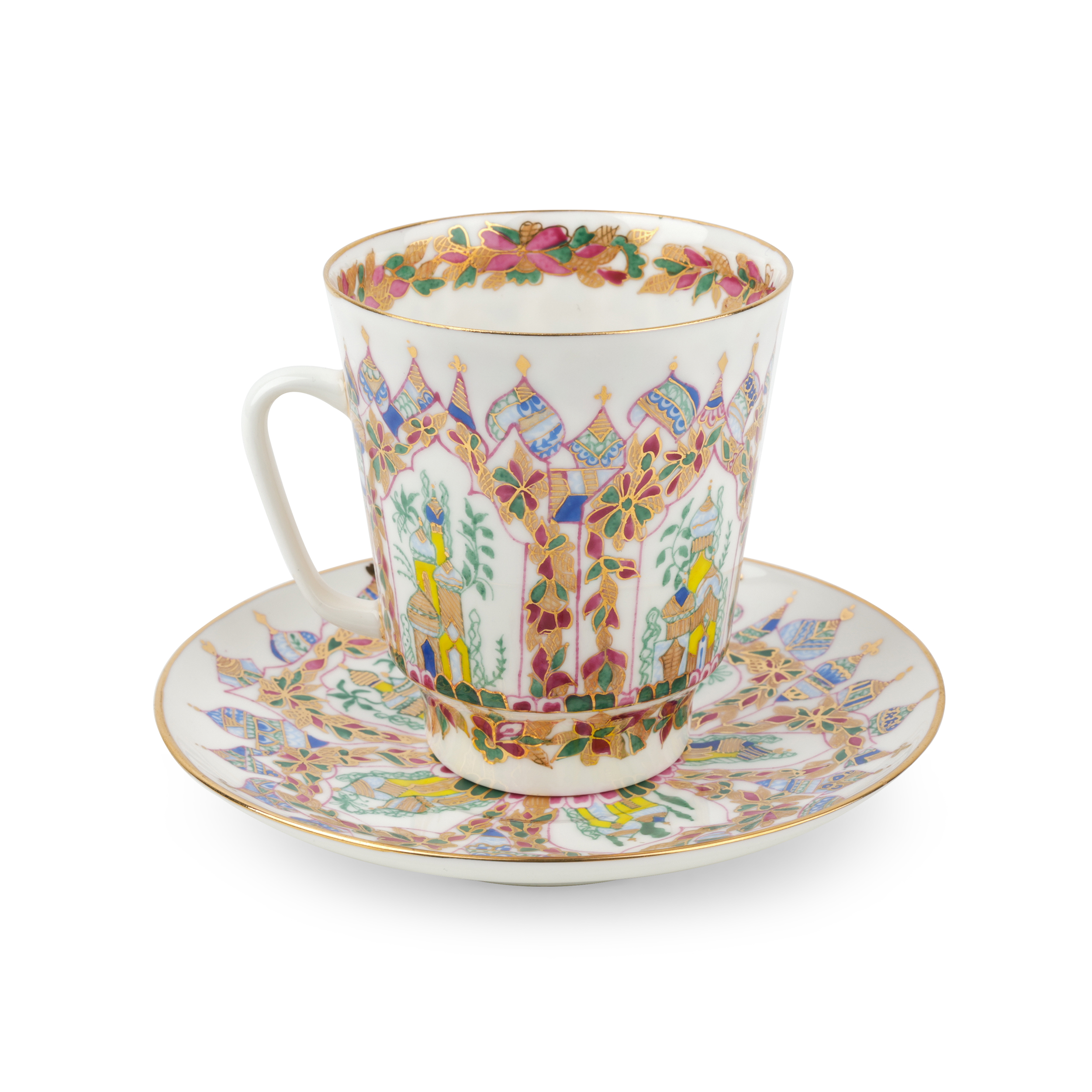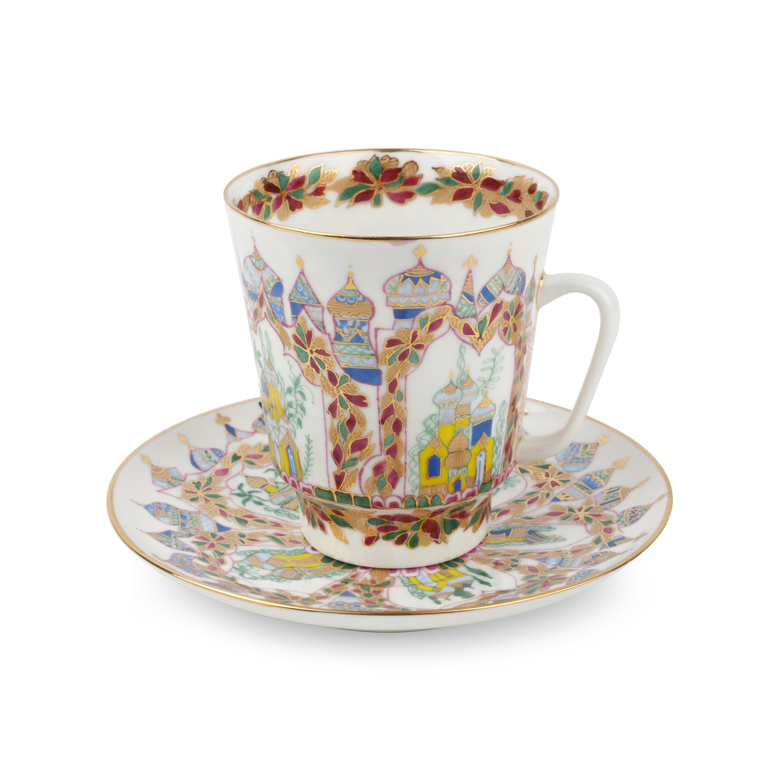 Костяной фарфор, ручная роспись, золочение. Марка: красная «ЛФЗ / MADE IN RUSSIA», подпись.