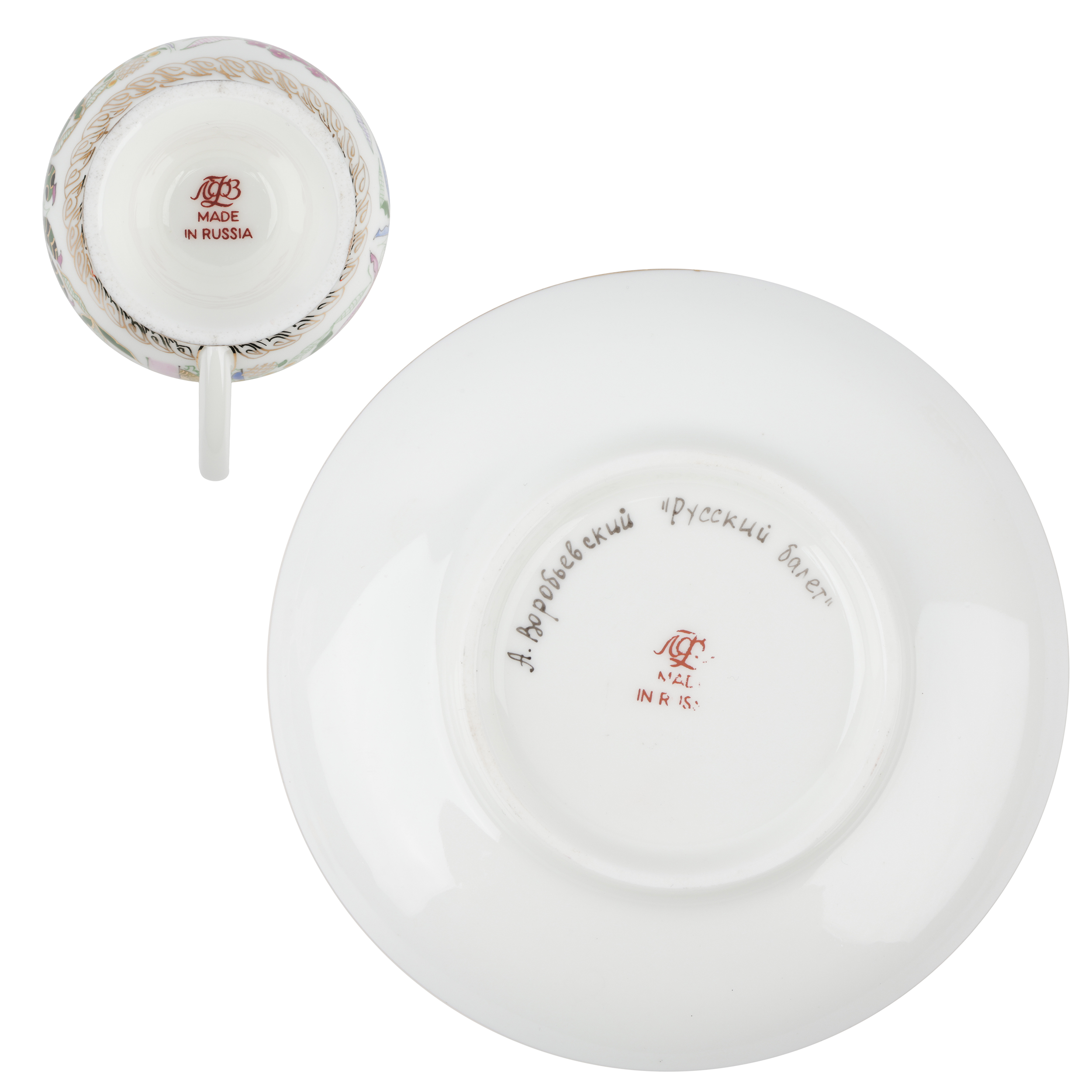 Костяной фарфор, ручная надглазурная роспись, золочение. Марка: красная «ЛФЗ / MADE IN RUSSIA», 1-ый сорт, подпись.