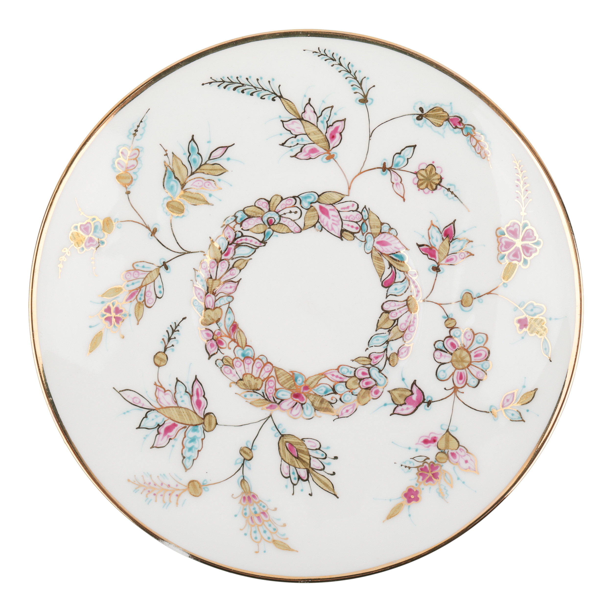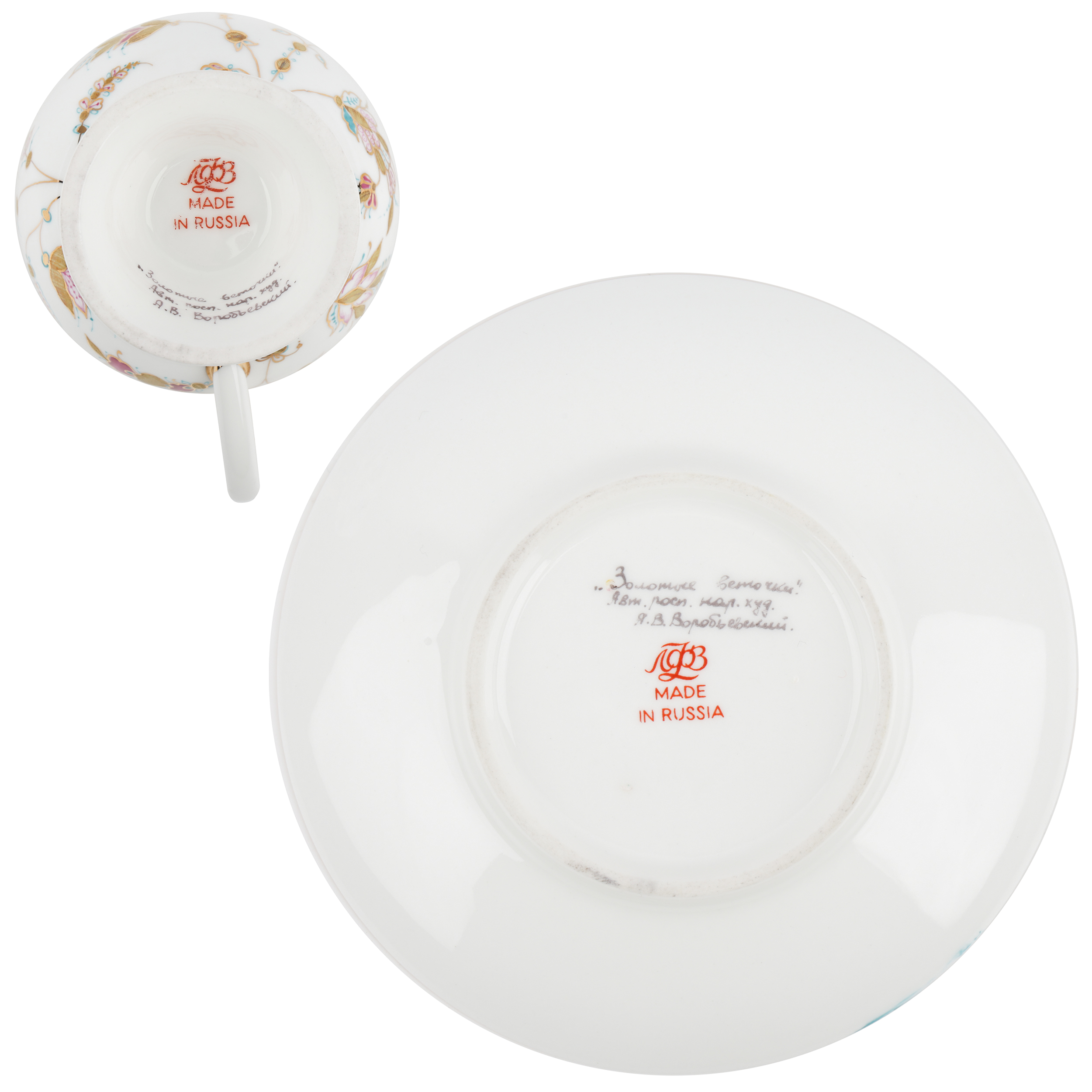 Костяной фарфор, ручная роспись, золочение. Марка: красная «ЛФЗ / MADE IN RUSSIA», подпись.