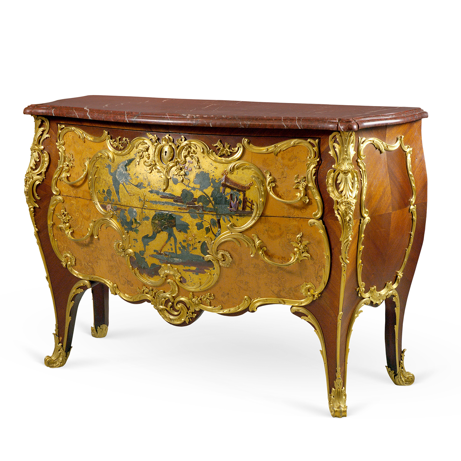 Красное дерево, фанеровка, цветочное маркетри из светлых пород дерева, китайские лаки по золоту, бронза, литьё, золочение, мрамор. Франция, вторая половина XIX века. Размер (в/ш/г): 97х 140 х 59 см. Сопровождается экспертным заключением