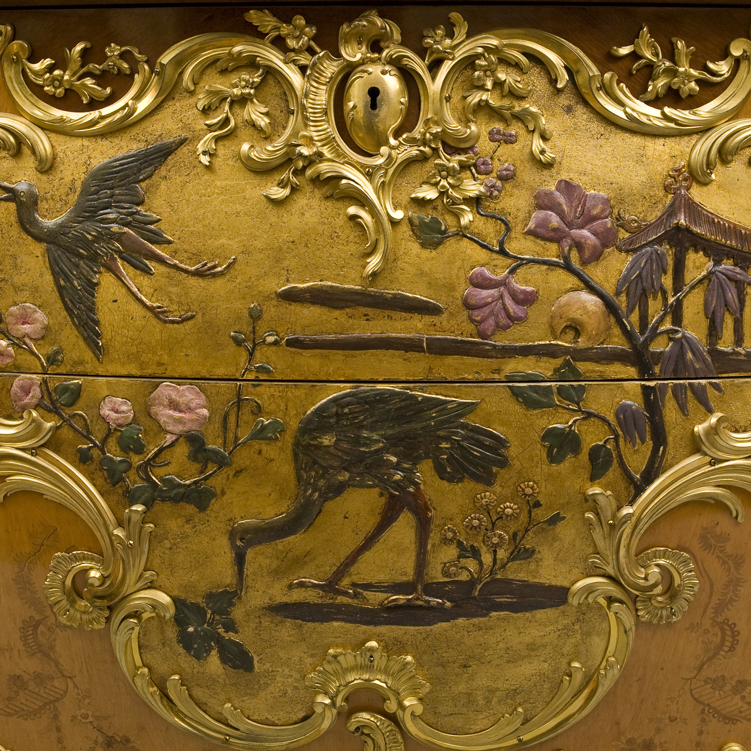 Комод представляет собой редкий по техническим приёмам предмет французской мебели, изготовленной в третьей четверти XIX века. Комод из двух ящиков, на высоких ножках с мраморной столешницей. Фасад декорирован панно изображающий цветы, журавлей и китайский домик, выполненные из раскрашенного стюка на золоченом фоне.