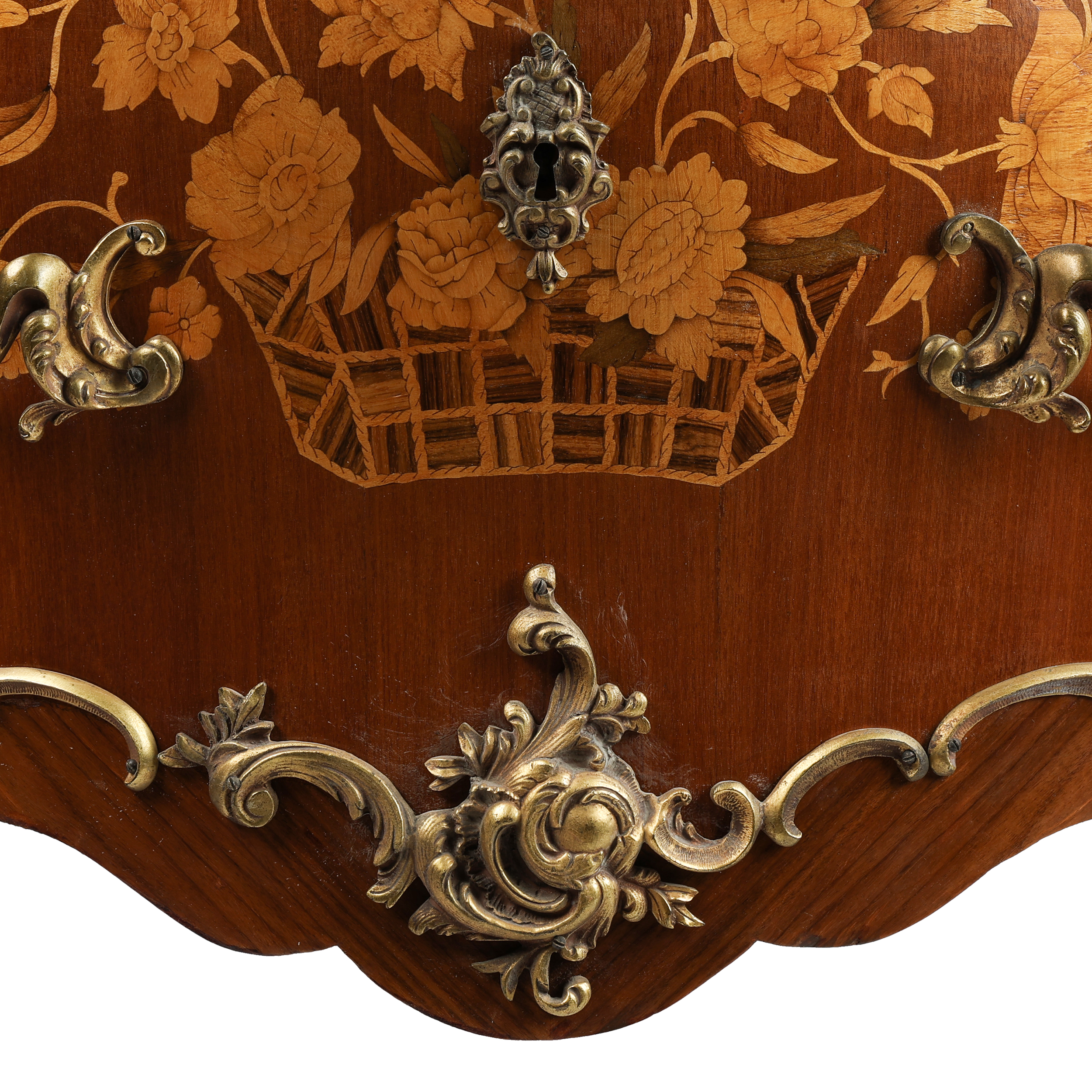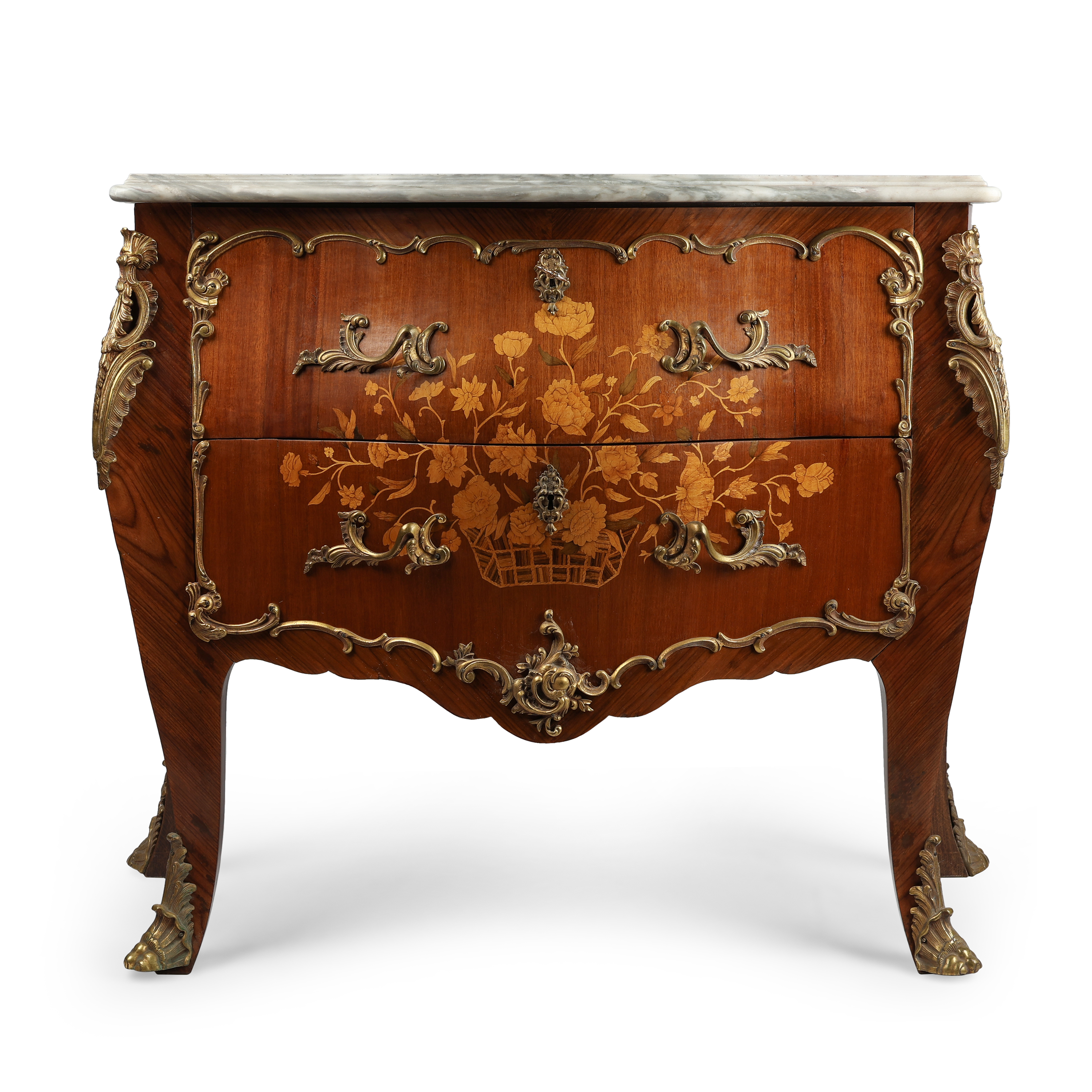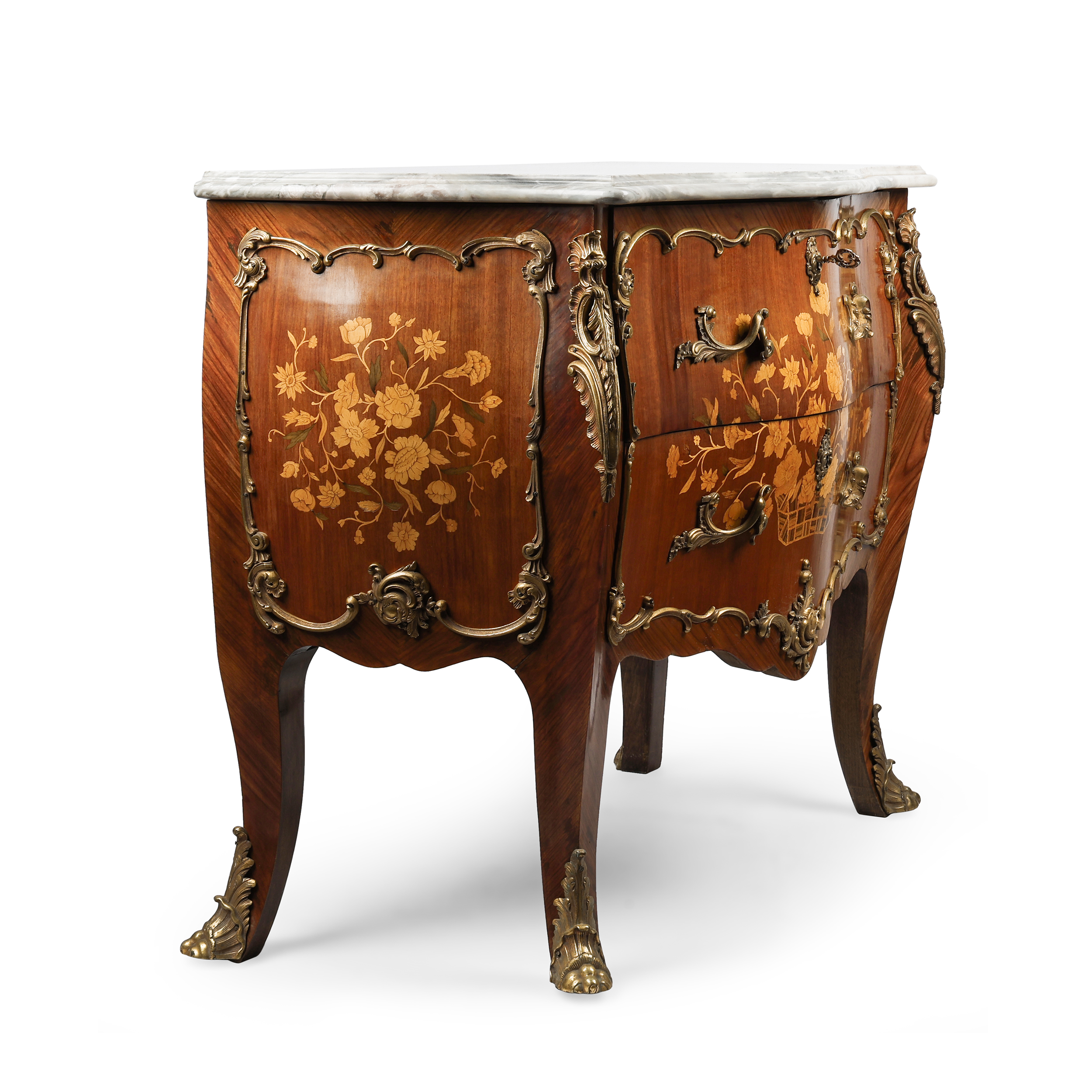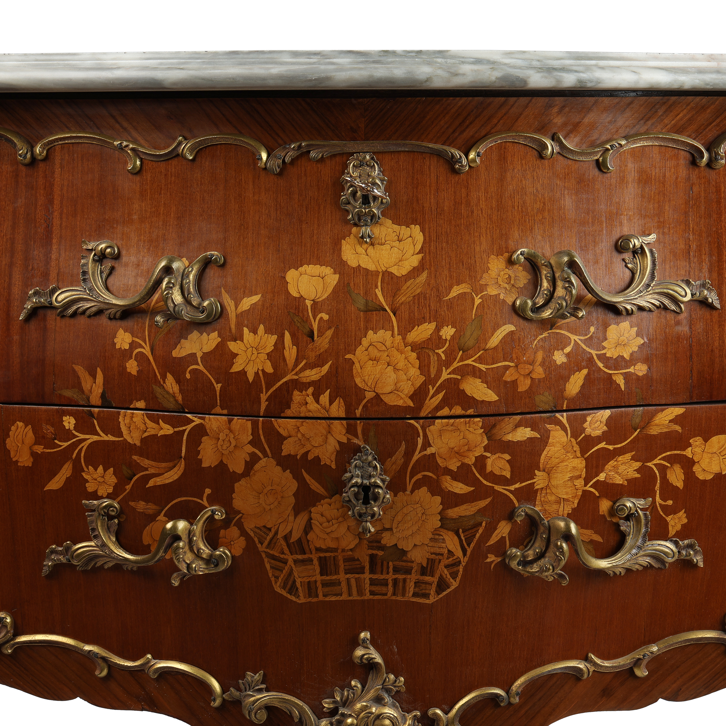 Фанерование различными породами дерева, маркетри, накладки золоченой бронзы, мраморная столешница.