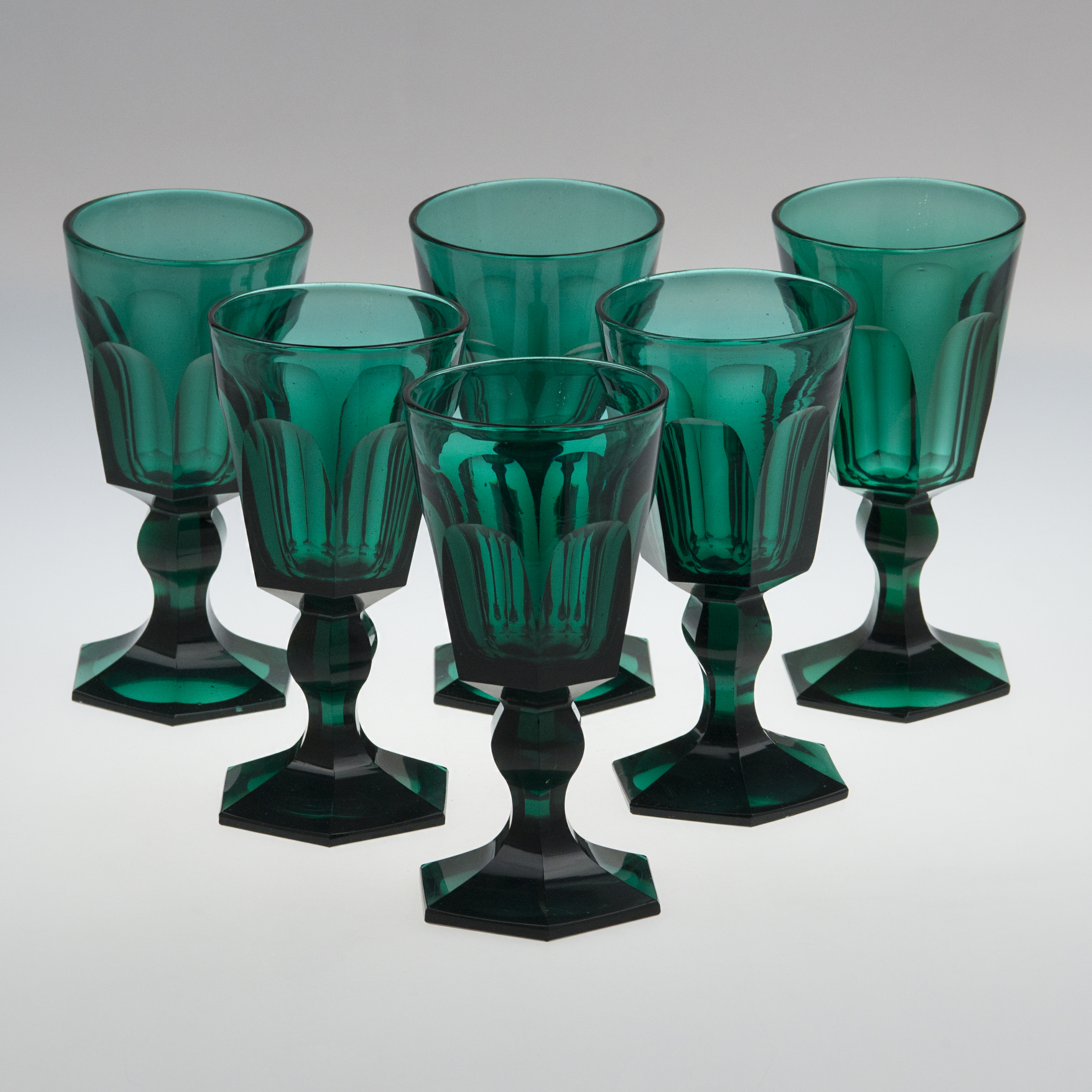 Шесть рюмок изумрудно-зеленого стекла для белого вина. Стекло, выдувание, гранение широкой гранью, шлифовка; Россия, высота – 12,7 см, диаметр – 6,3 см.