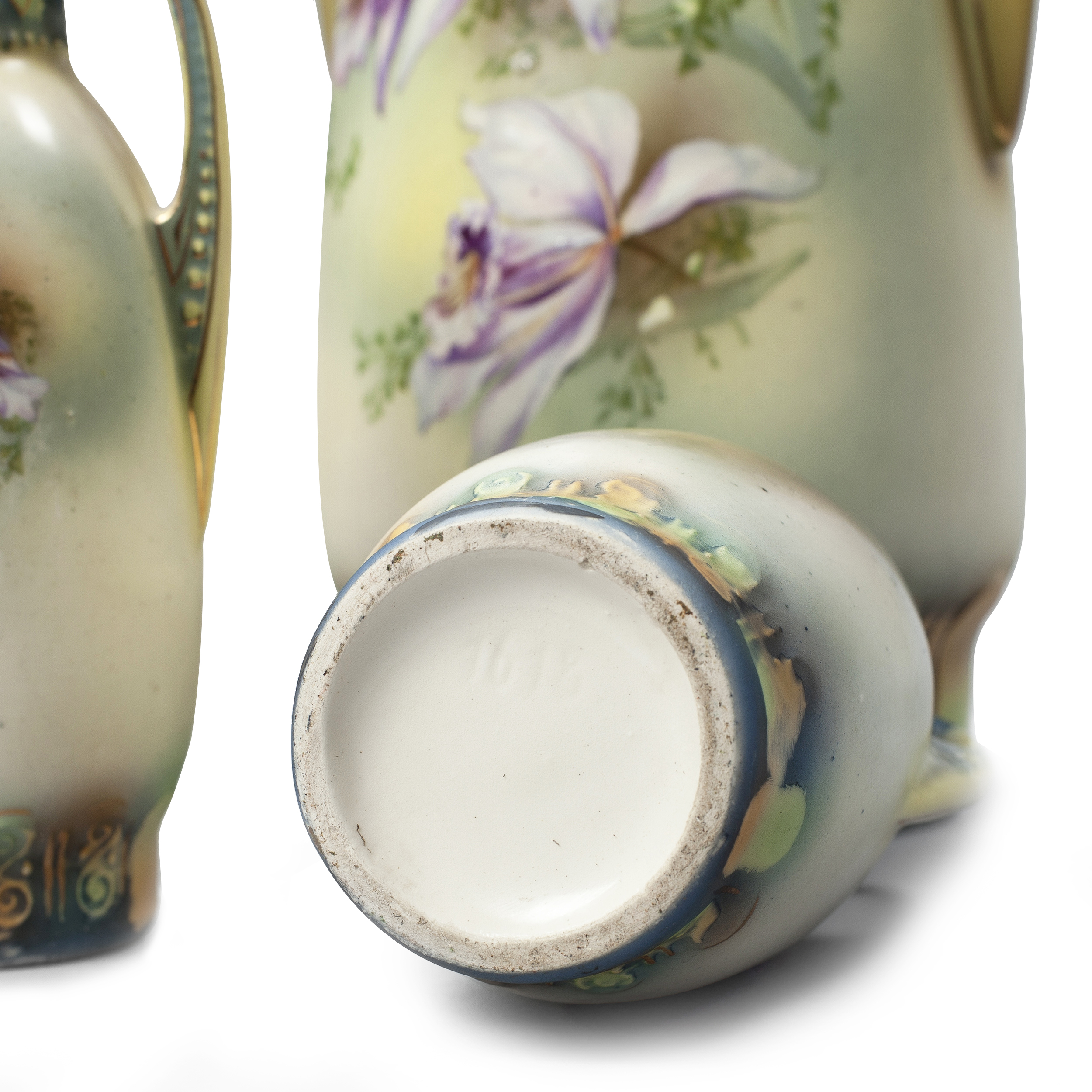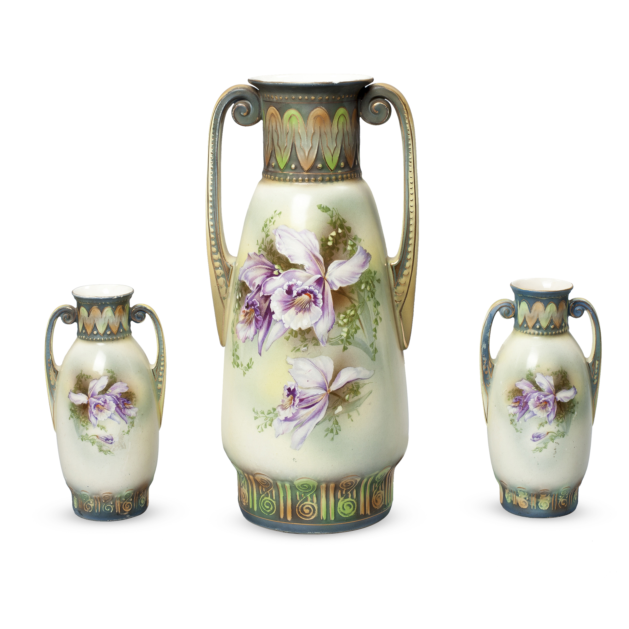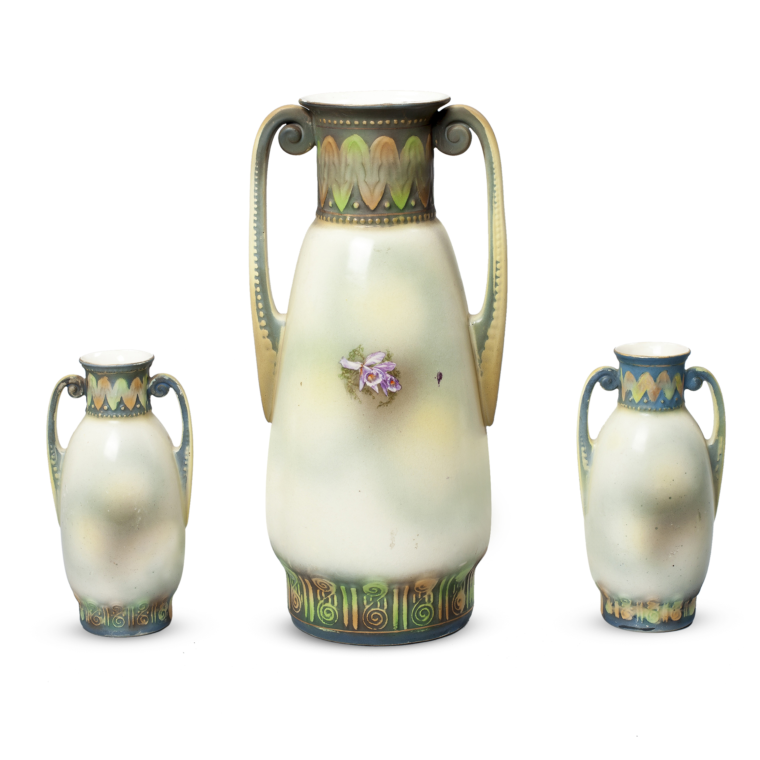 Три вазы выполнены в форме амфор. Керамика, рельеф, аэрография, полихромная деколь, клеймо отсутствует, цифры в тесте, Европа, около 1900 года, высота - 34 и по 18 см
