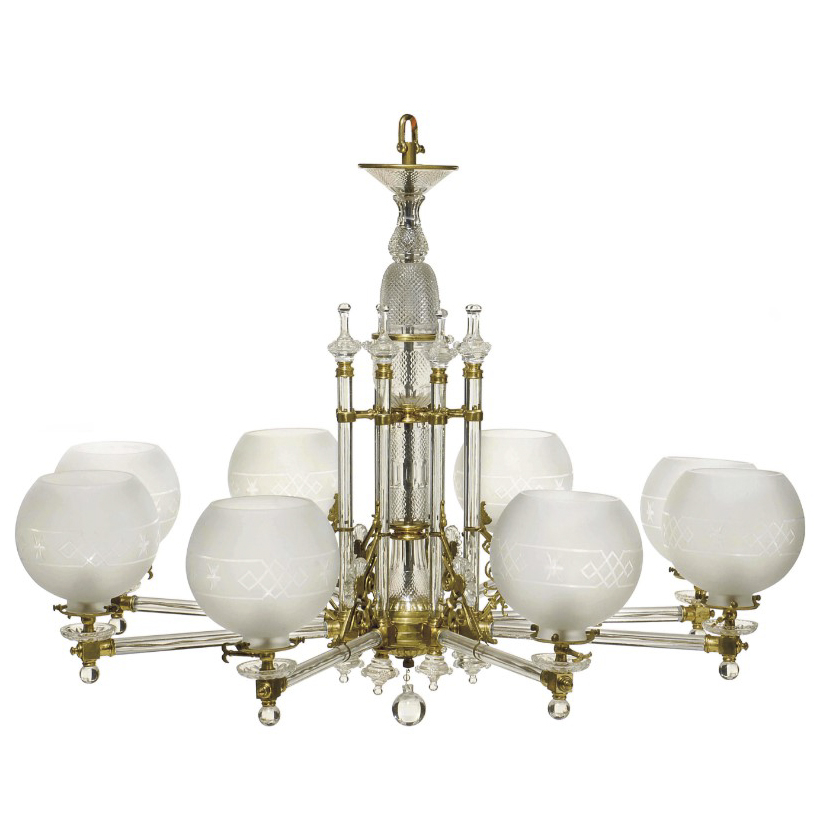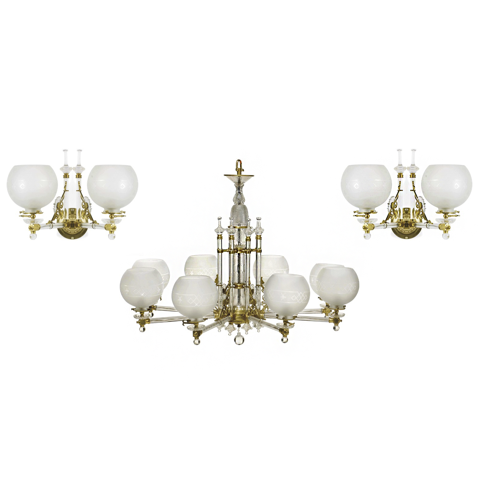 Стекло, литье, матирование, гравировка; латунь; английская фабрика Ф. и С. Ослер («F. & C. Osler & Co»), Бирмингем, Англия, высота люстры – 74 см, диаметр – 94 см; высота бра – 35,5 см.