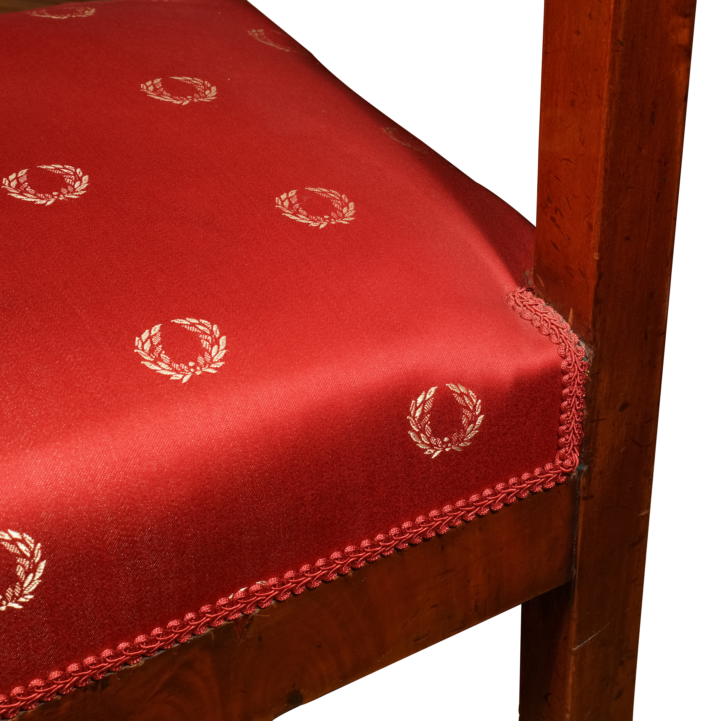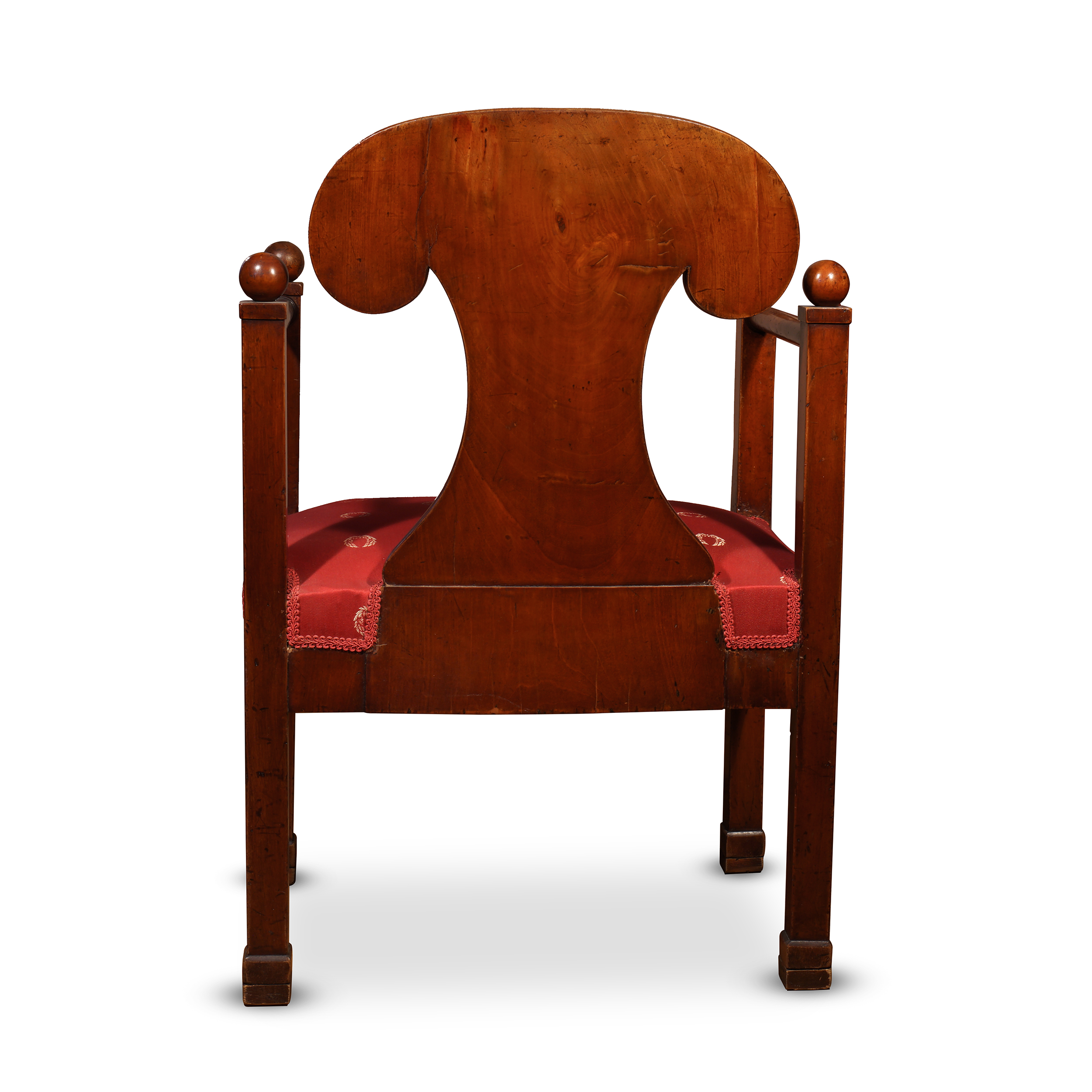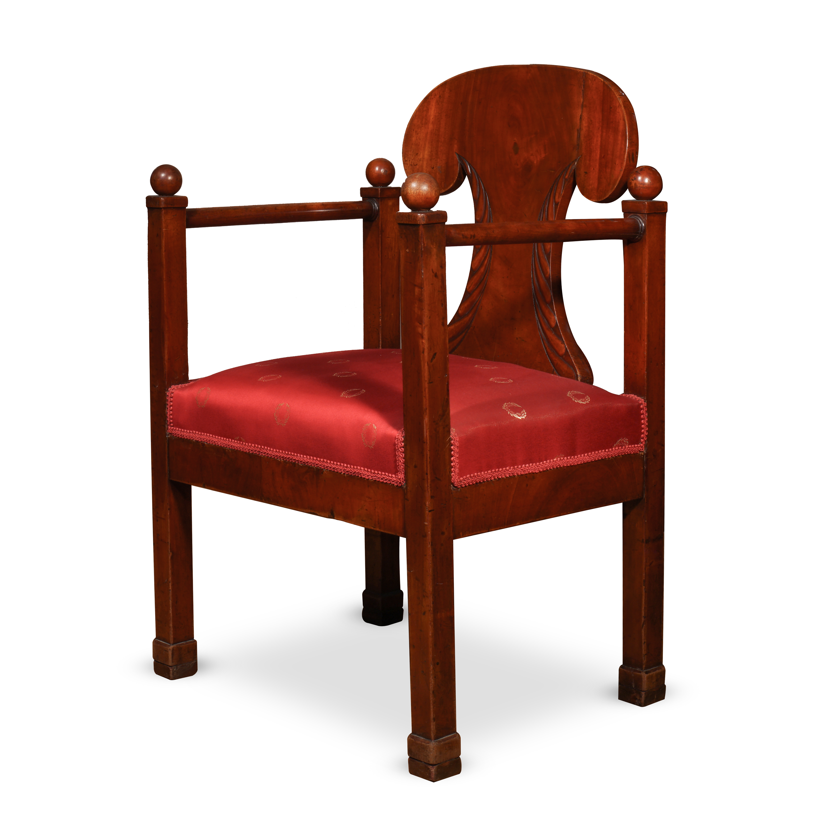 Спинка в форме щита, подлокотники геометрической формы. Красное дерево, фанеровка, полировка, токарная работа, столярные работы, штоф красный (ткань) — штоф (нем. Stoff), декоративная гладкокрашеная ткань со сложным крупным тканым рисунком.Россия, начало XIX века, размеры (в/ш/г): 88 х 58,5 х 44 см