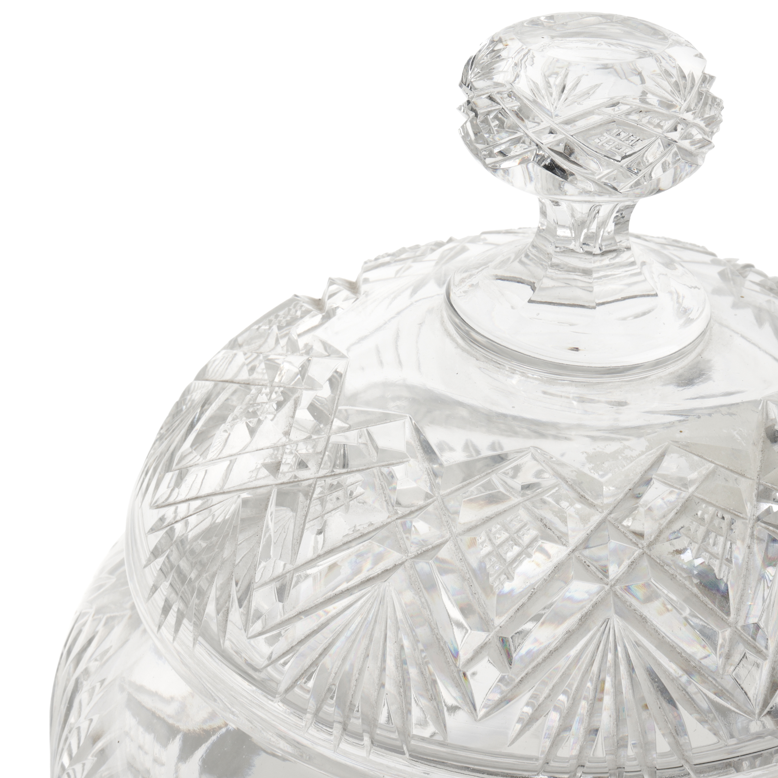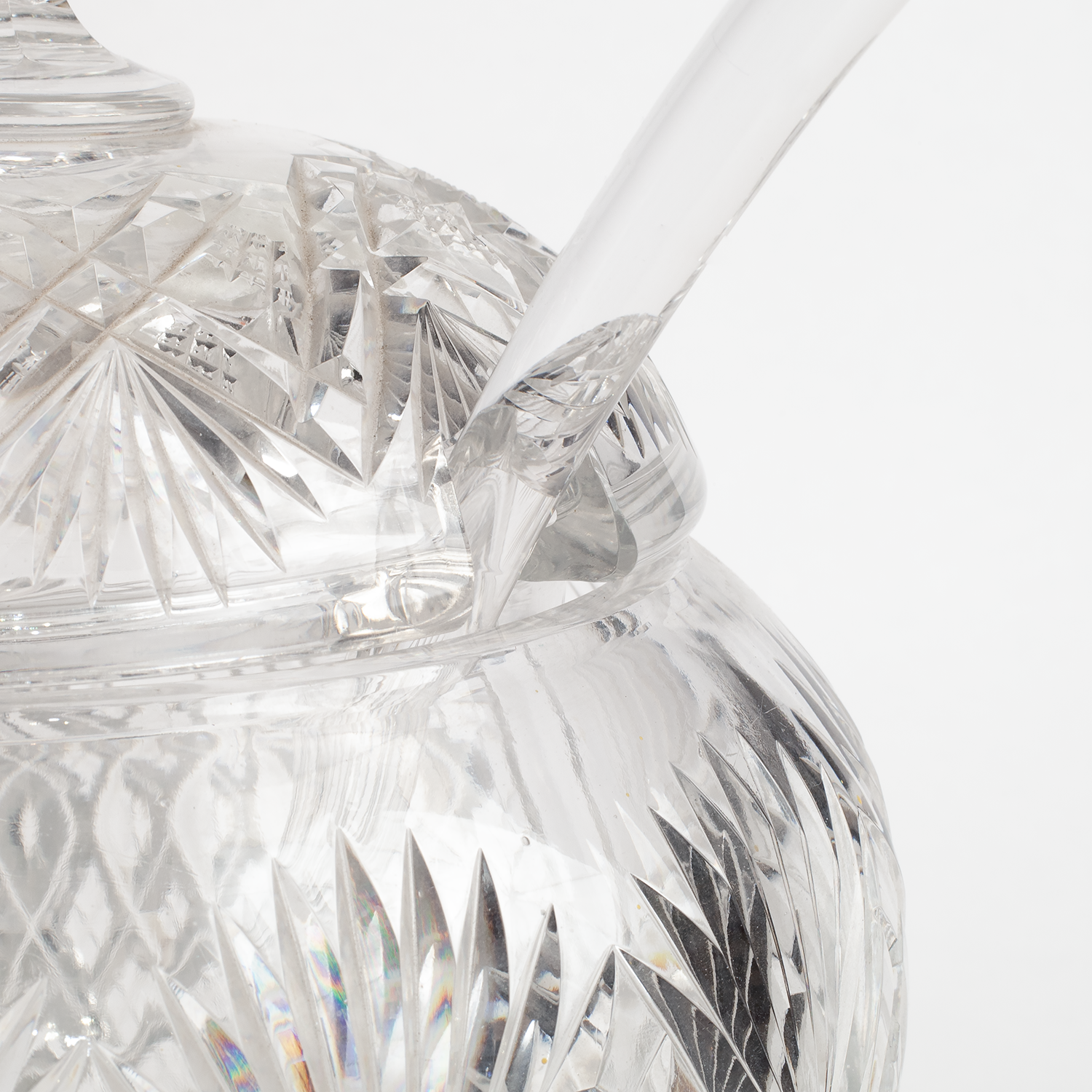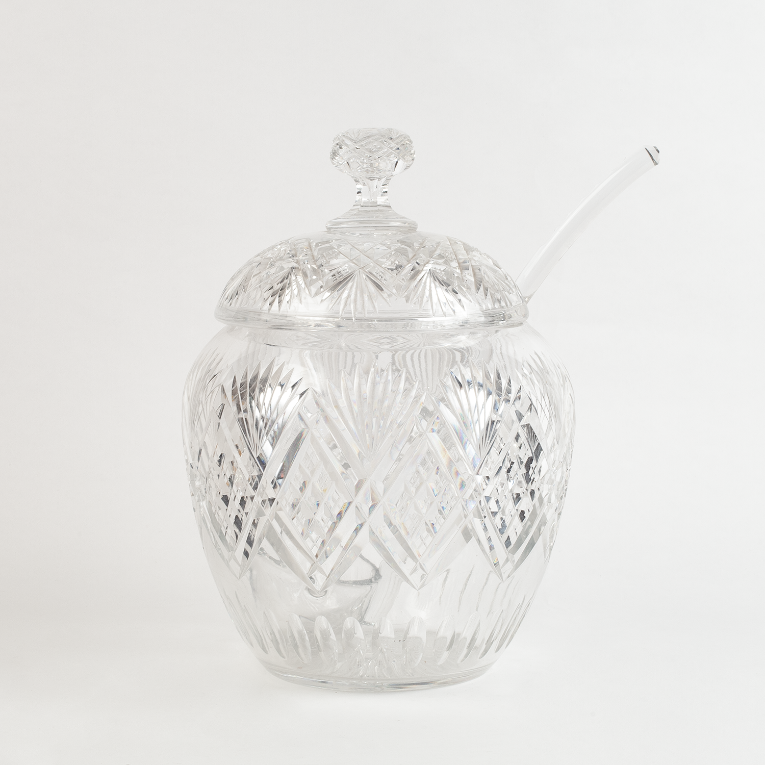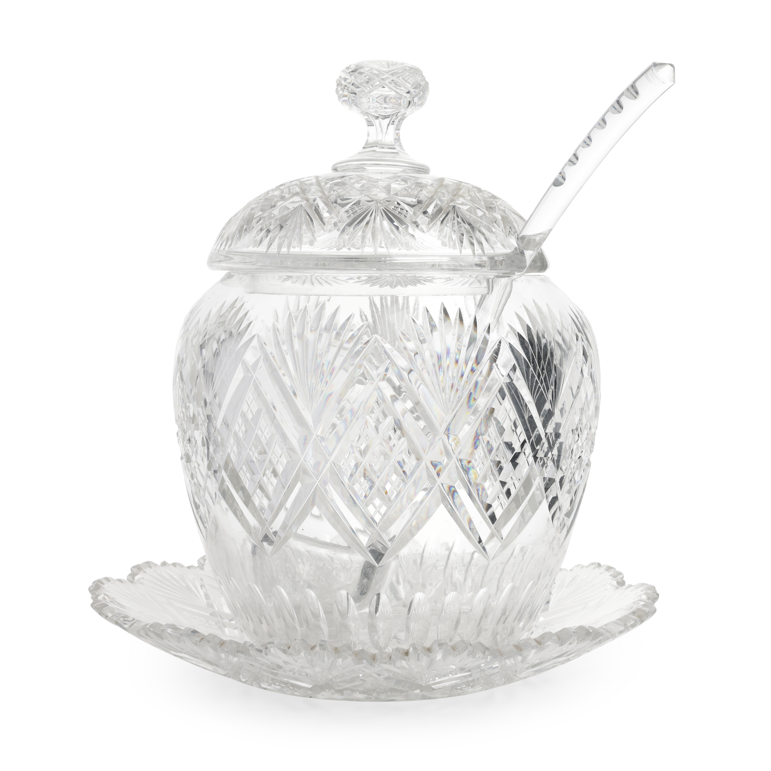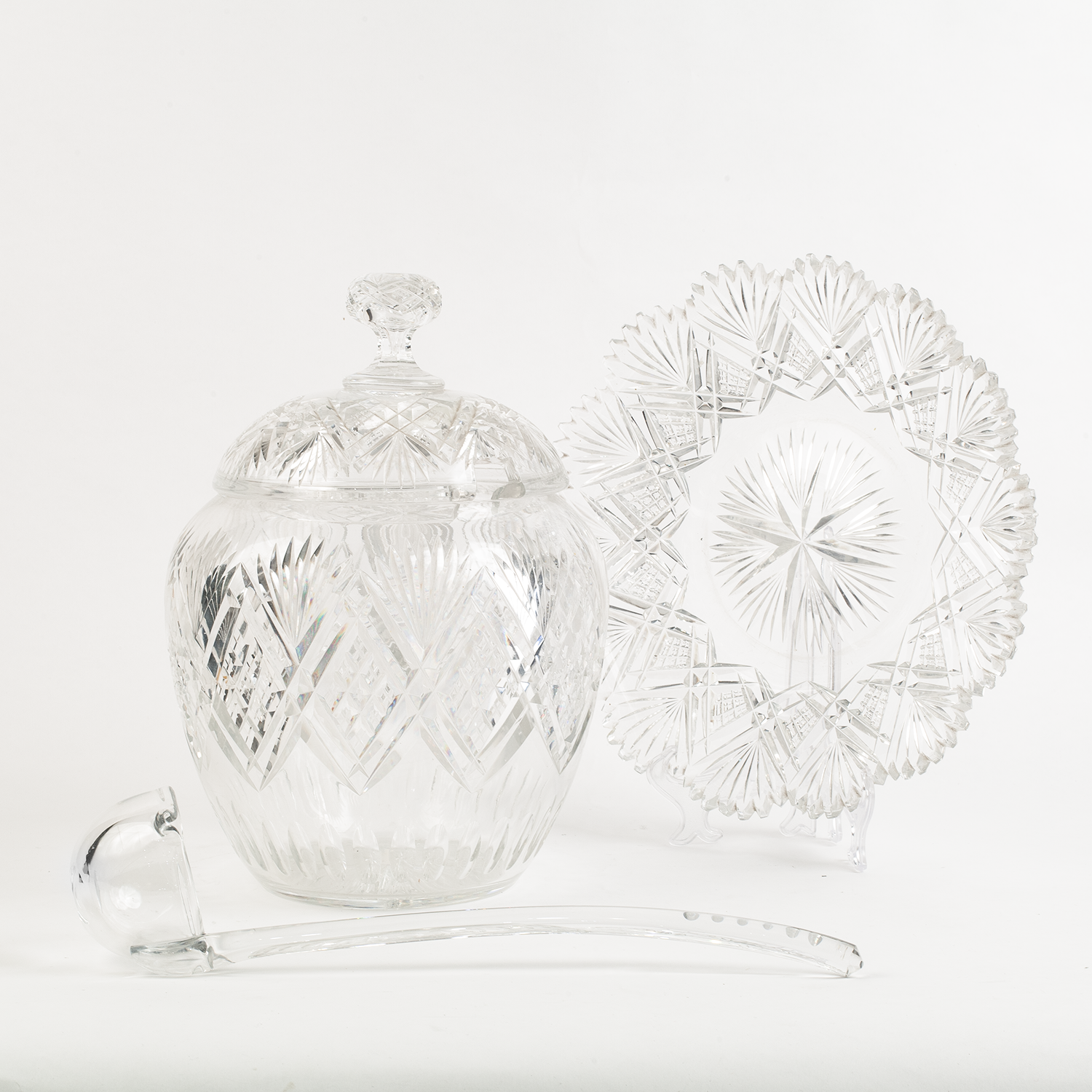 Набор для крюшона: крюшонница с крышкой, половник и блюдо. Бесцветный хрусталь, резьба, алмазная грань, Богемия, начало ХХ века, размеры: высота - 35 см, диаметр подноса - 31 см