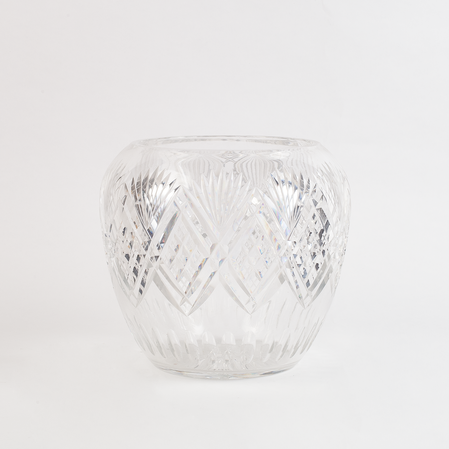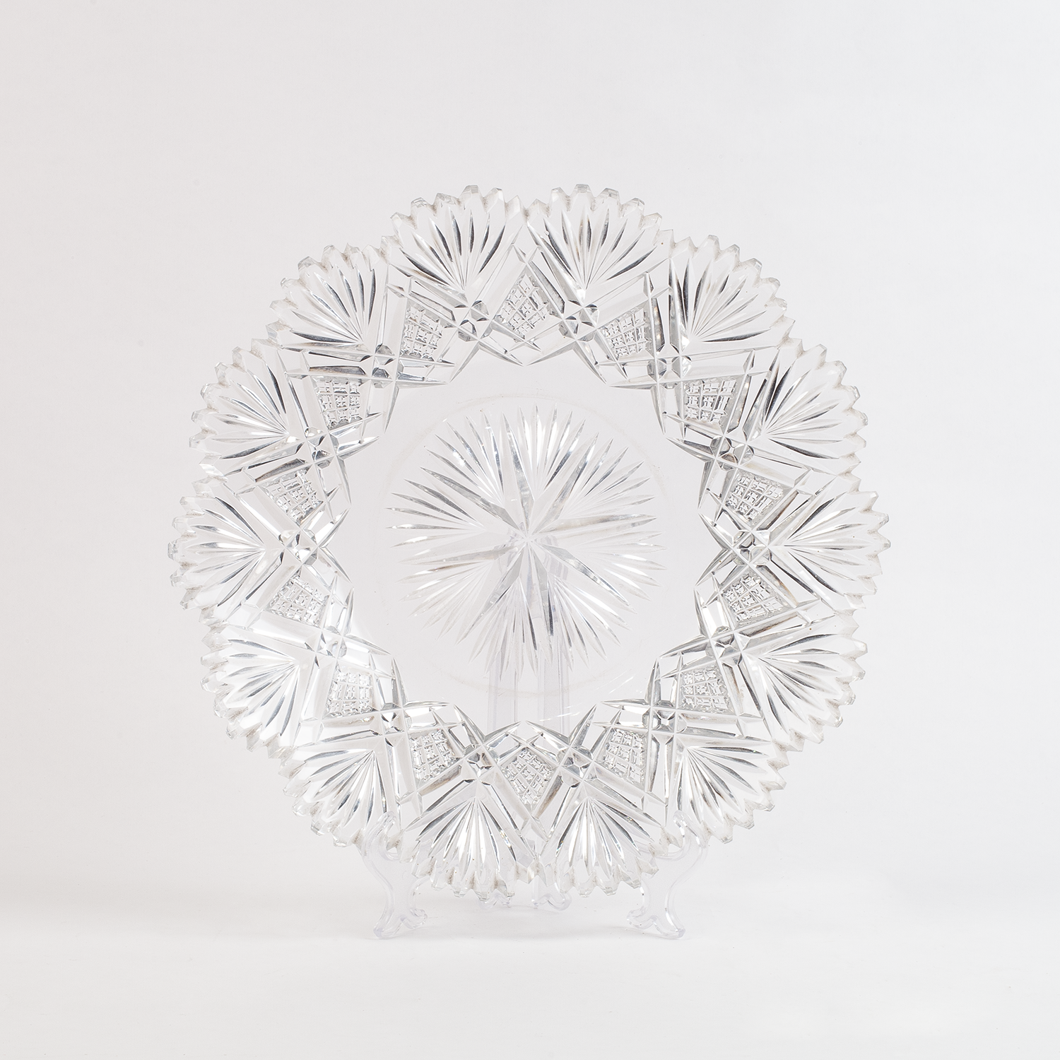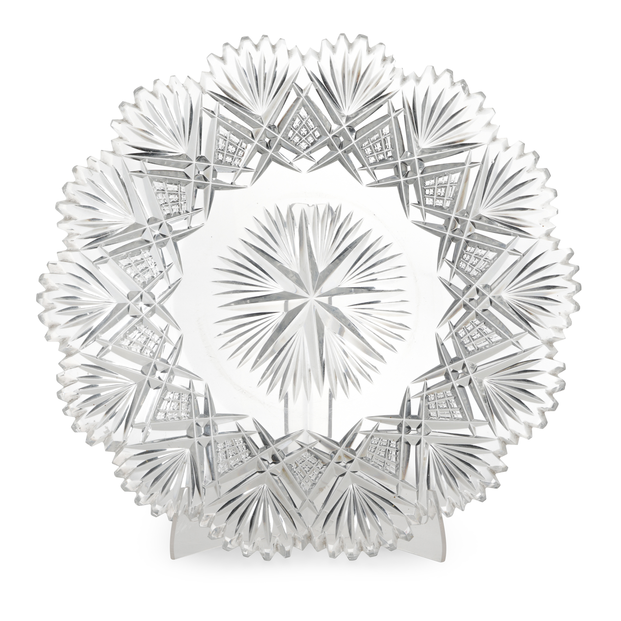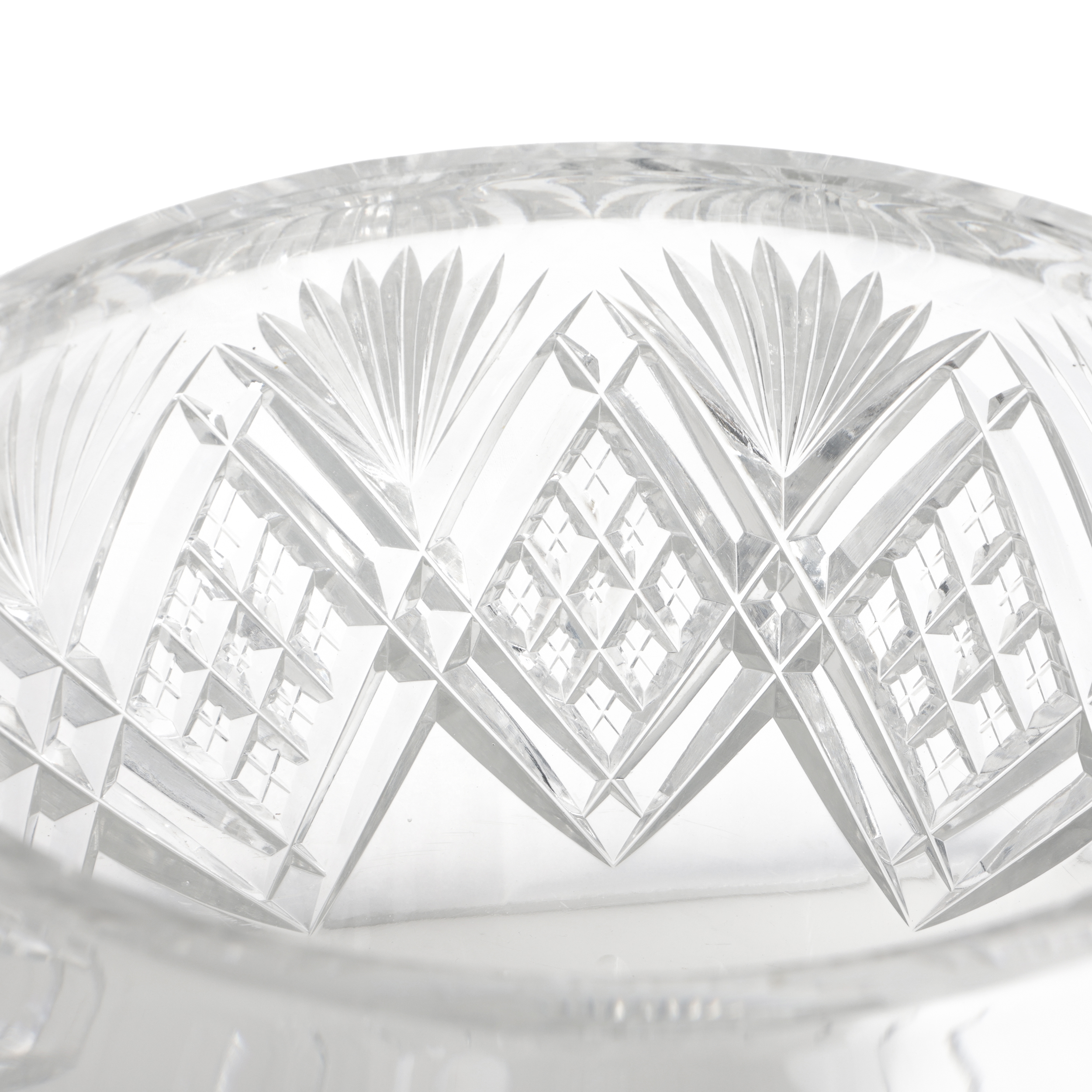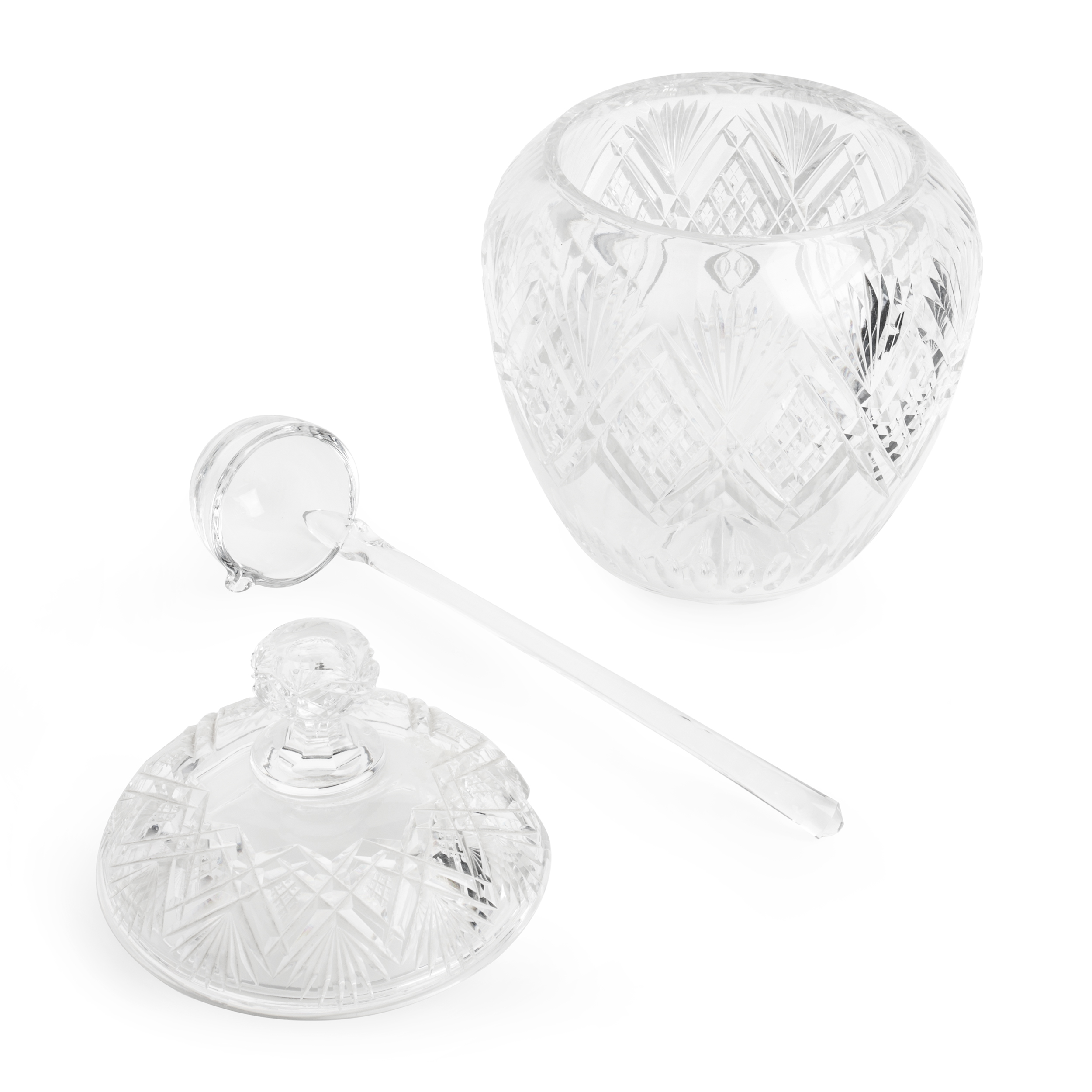 Набор для крюшона: крюшонница с крышкой, половник и блюдо. Бесцветный хрусталь, резьба, алмазная грань, Богемия, начало ХХ века, размеры: высота - 35 см, диаметр подноса - 31 см