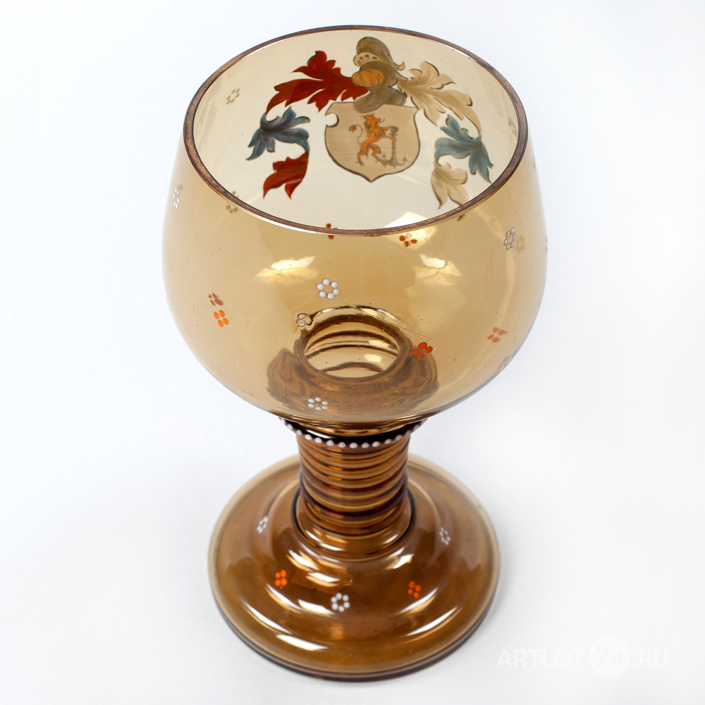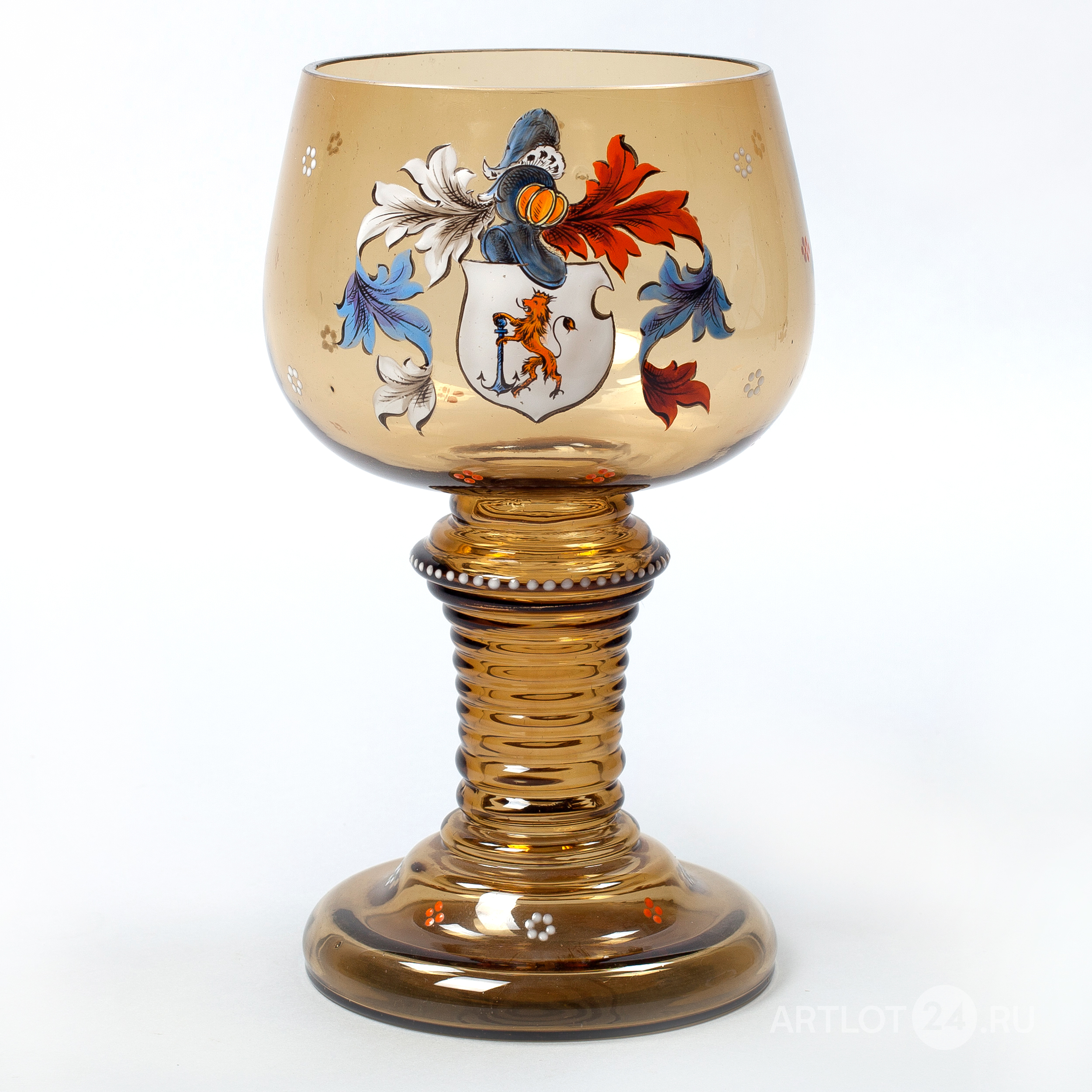 Кубок цветного янтарного стекла на профилированной ножке, выдувание, роспись полихромными эмалями с изображением герба Дюссельдорфа и бергского льва, Германия, Королевская баварская привилегированная стекольная фабрика «Терезиенталь» (?), конец XIX - начало ХХ века, высота - 25,5 см, диаметр - 15 см