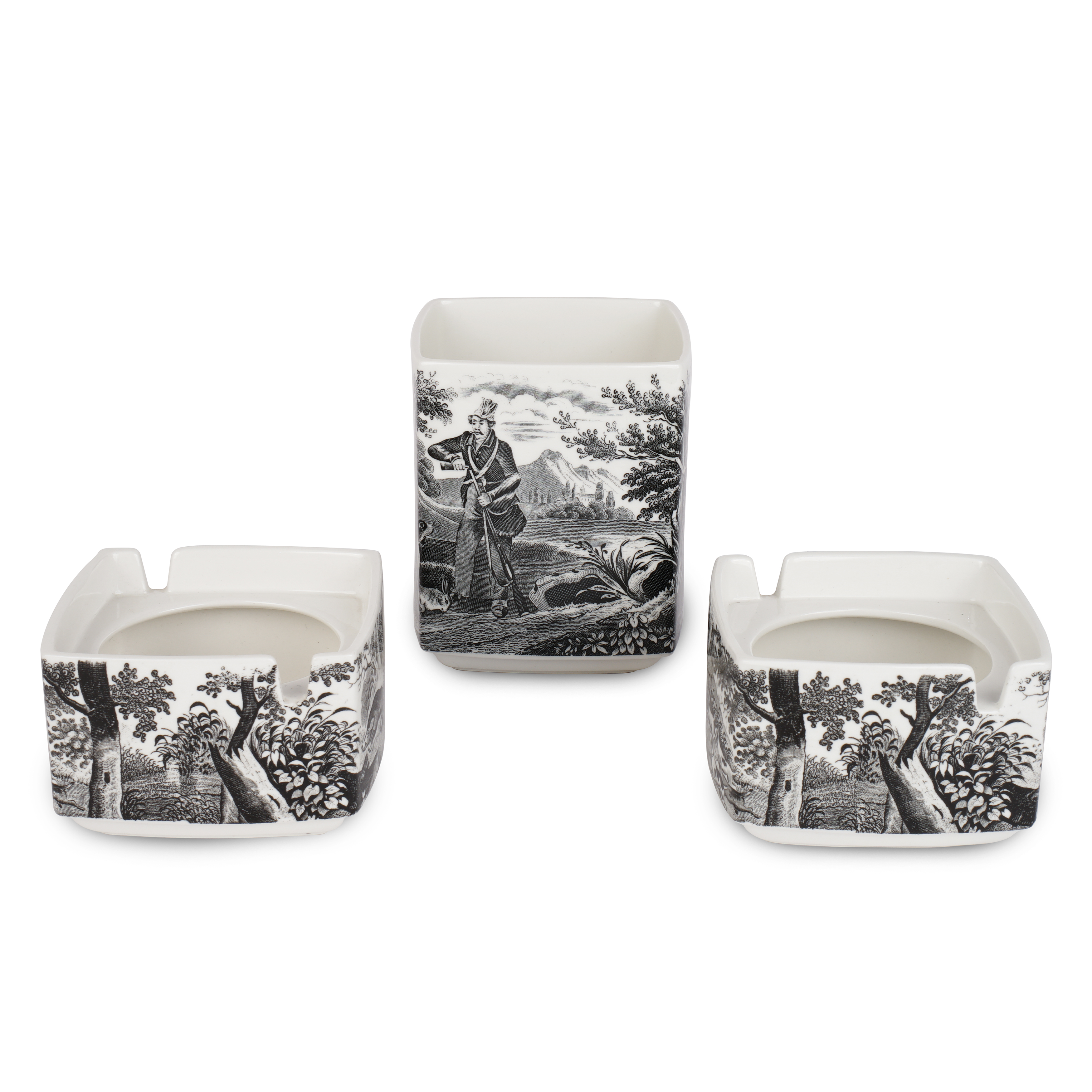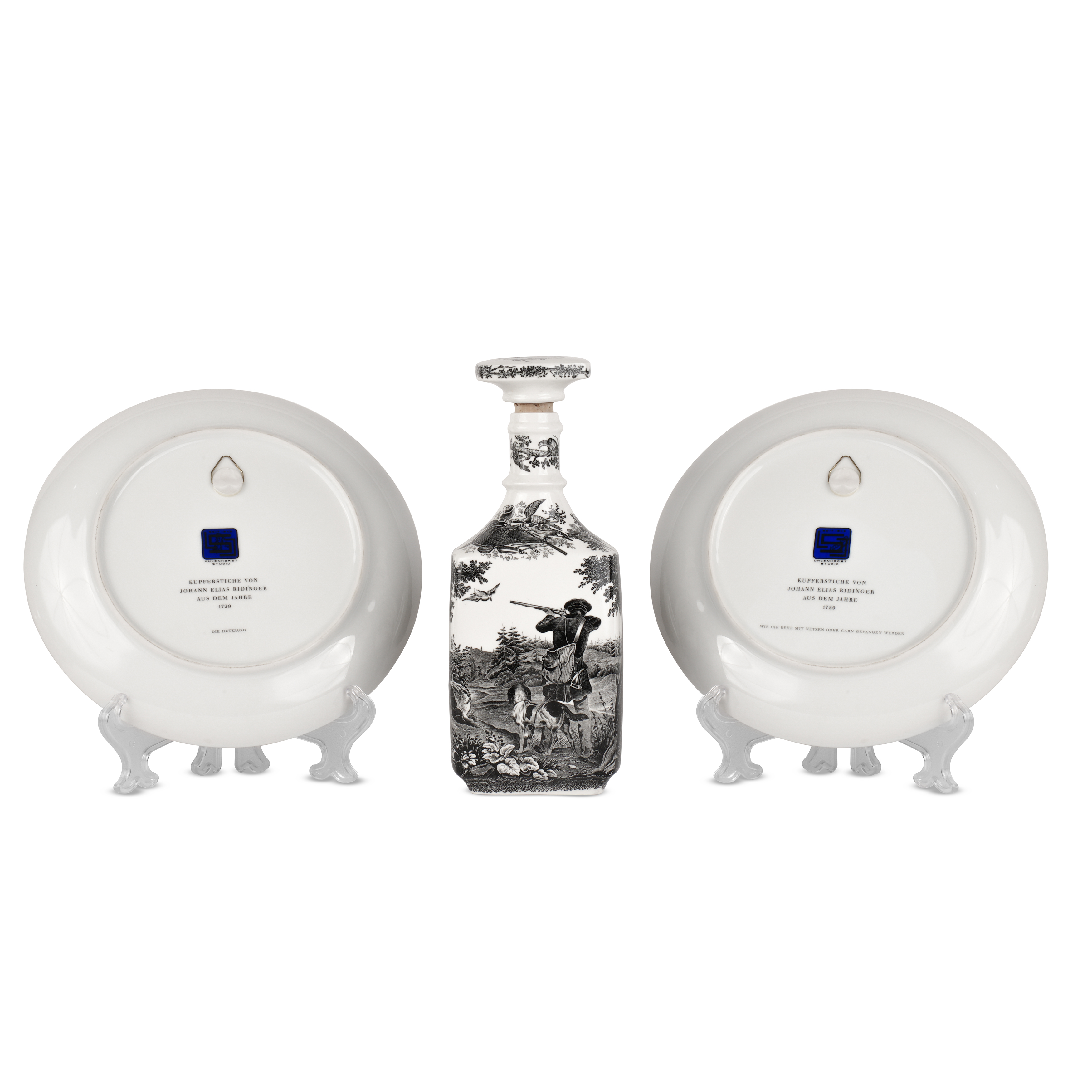 Фарфор, монохромная печать, клейма «Villeroy & Boch, Mettlach», «Uhlenhorst-Studio», мануфактура Виллерой & Бох, серия «Artemis», Германия, вторая половина ХХ века, высота штофа - 24 х 9 х 5 см, объем - 0,5 л, диаметр тарелок - по 23,5 см, пепельницы - 5 х 8,5 см, стакан - 10 х 8,5 см, высота стопок - по 6 см