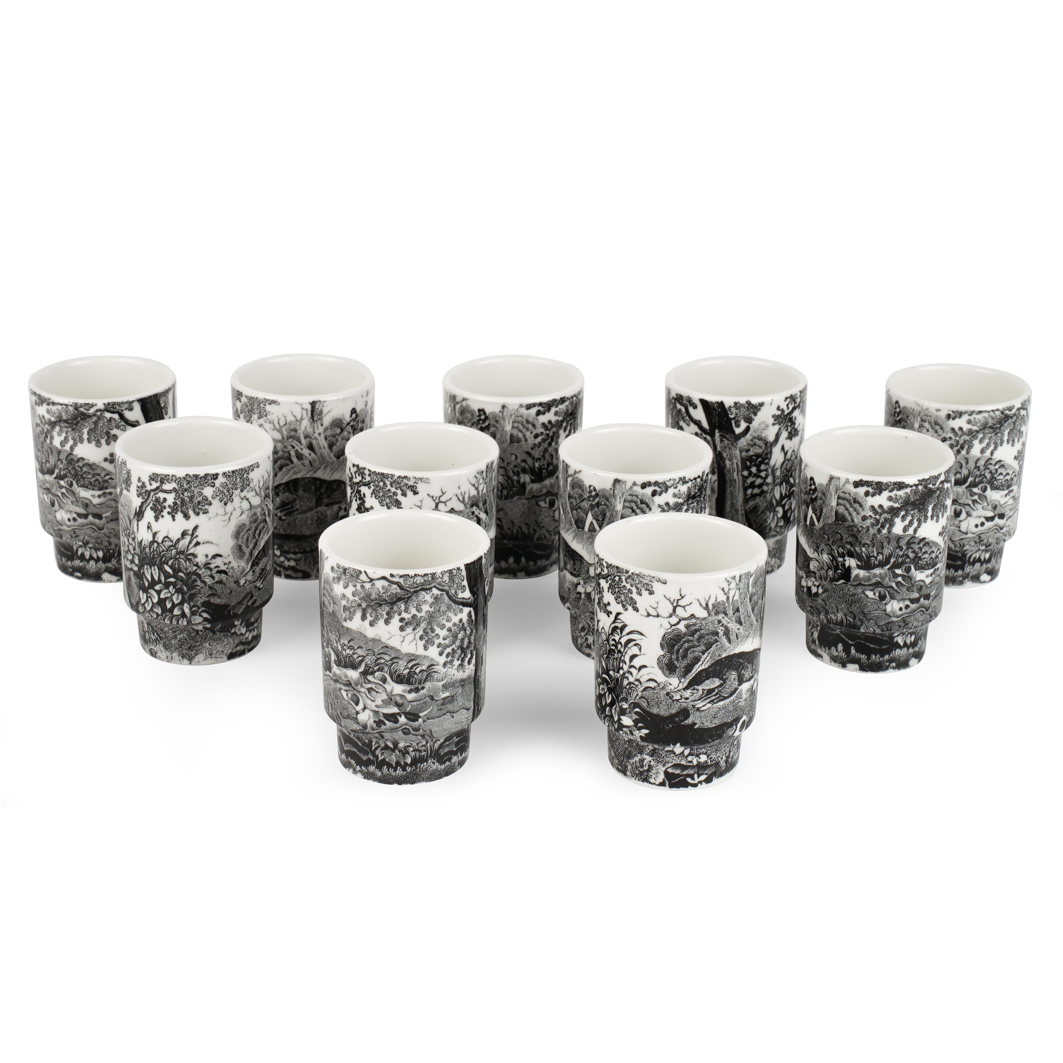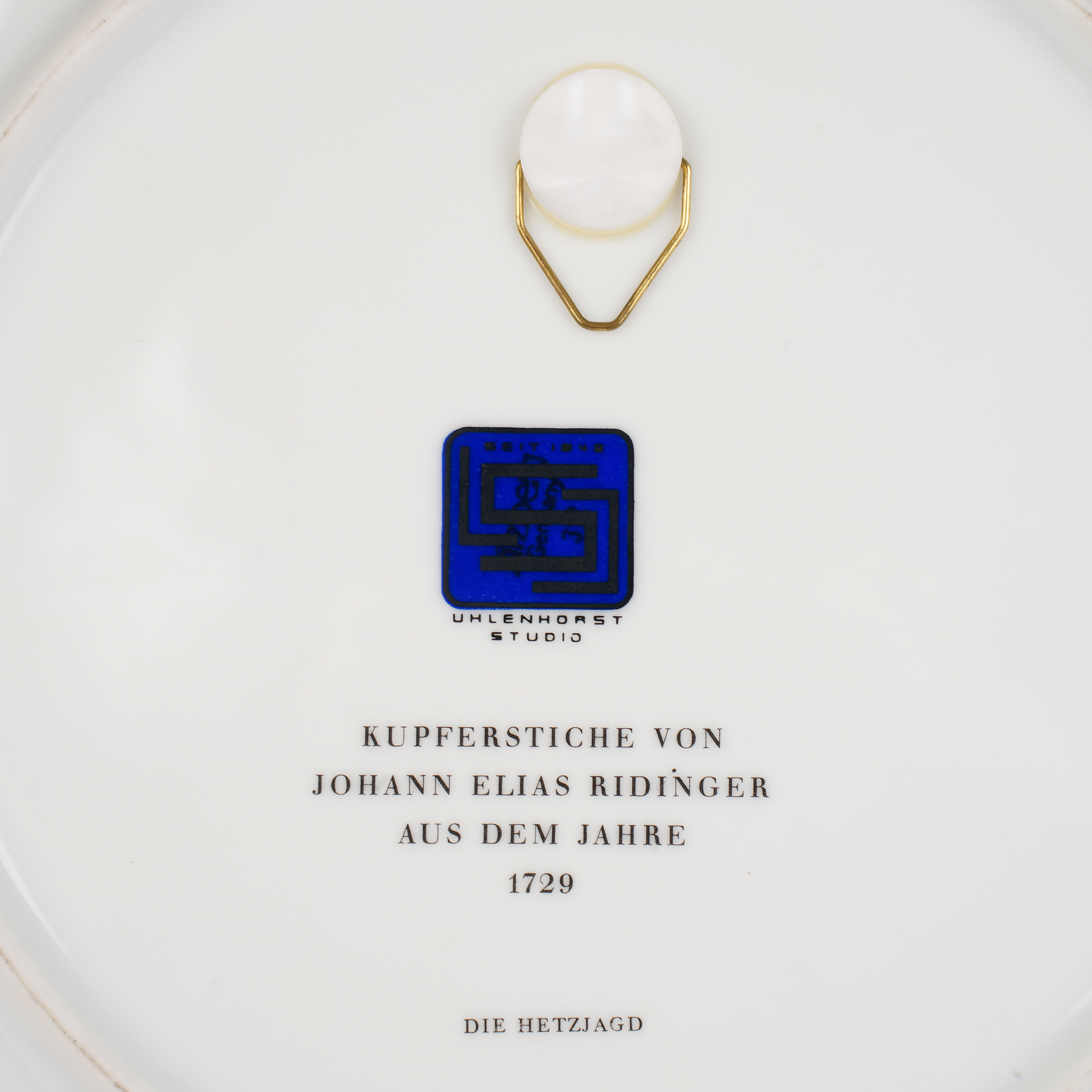 Штоф для ликера с крышкой, 11 стопок, 2 тарелки, 2 пепельницы и стакан для сигар со сценами гравюр 1729 года Иоганна Ридингера (Johann Elias Ridinger, 1698- 1767).