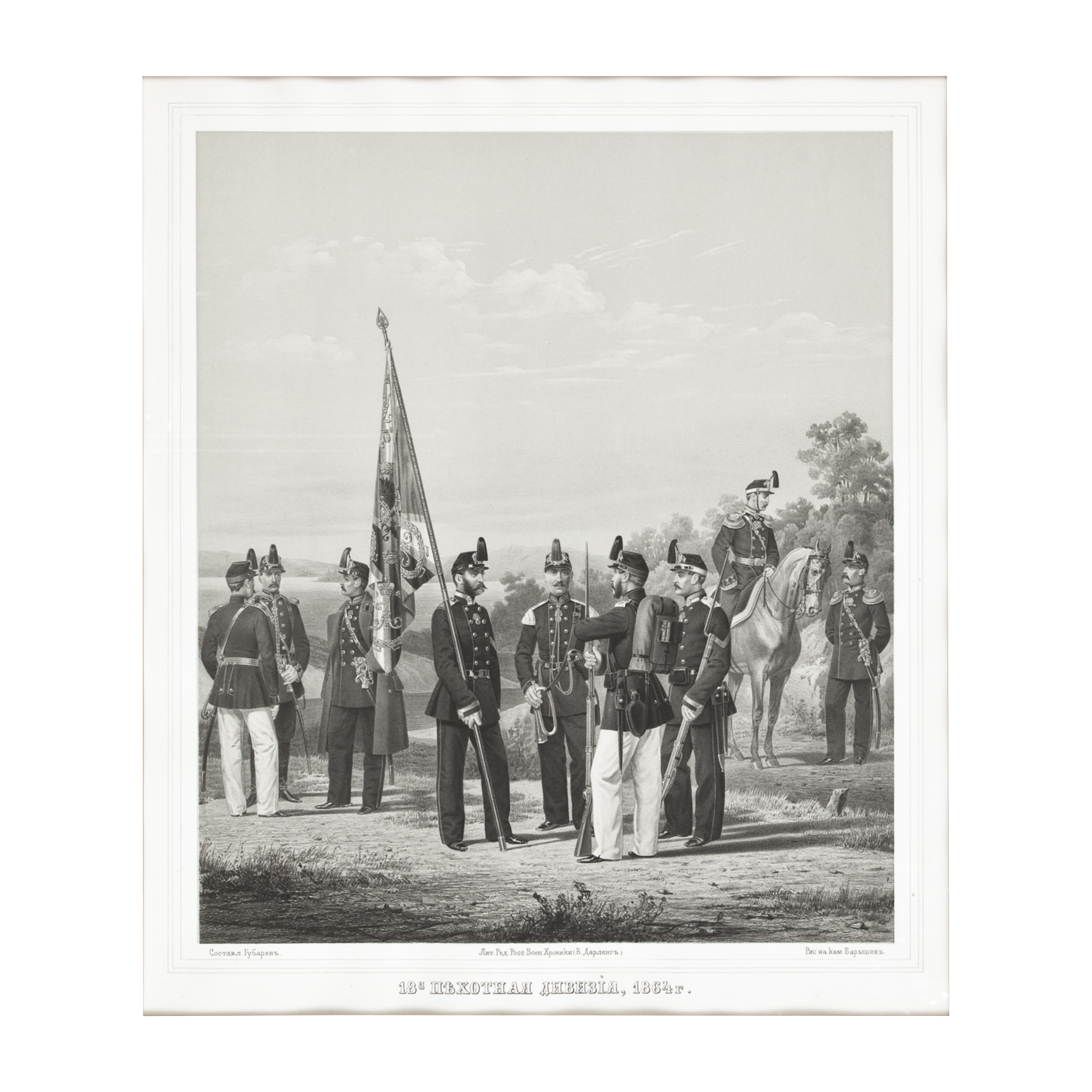 Бумага, типографская печать, под изображением литографированные надписи: «Составл. Губаревъ», «Лит. Ред. Росс. Военн. Хроники (В. Дарленгъ.)», «Рис. на кам. Барышевъ». Выполнена по рисунку русского художника-баталиста Петра Кирилловича Губарева (1818 – не ранее 1874), гравер Яков Дмитриевич Барышев; Санкт-Петербург, издание редакции Российской Художественной (военной) хроники В. Дарлинга, 1870-е годы; Размер изображения (в/ш): 40,5 х 35,6 см, листа: 47 х 41 см, в раме: 83 х 76 см.