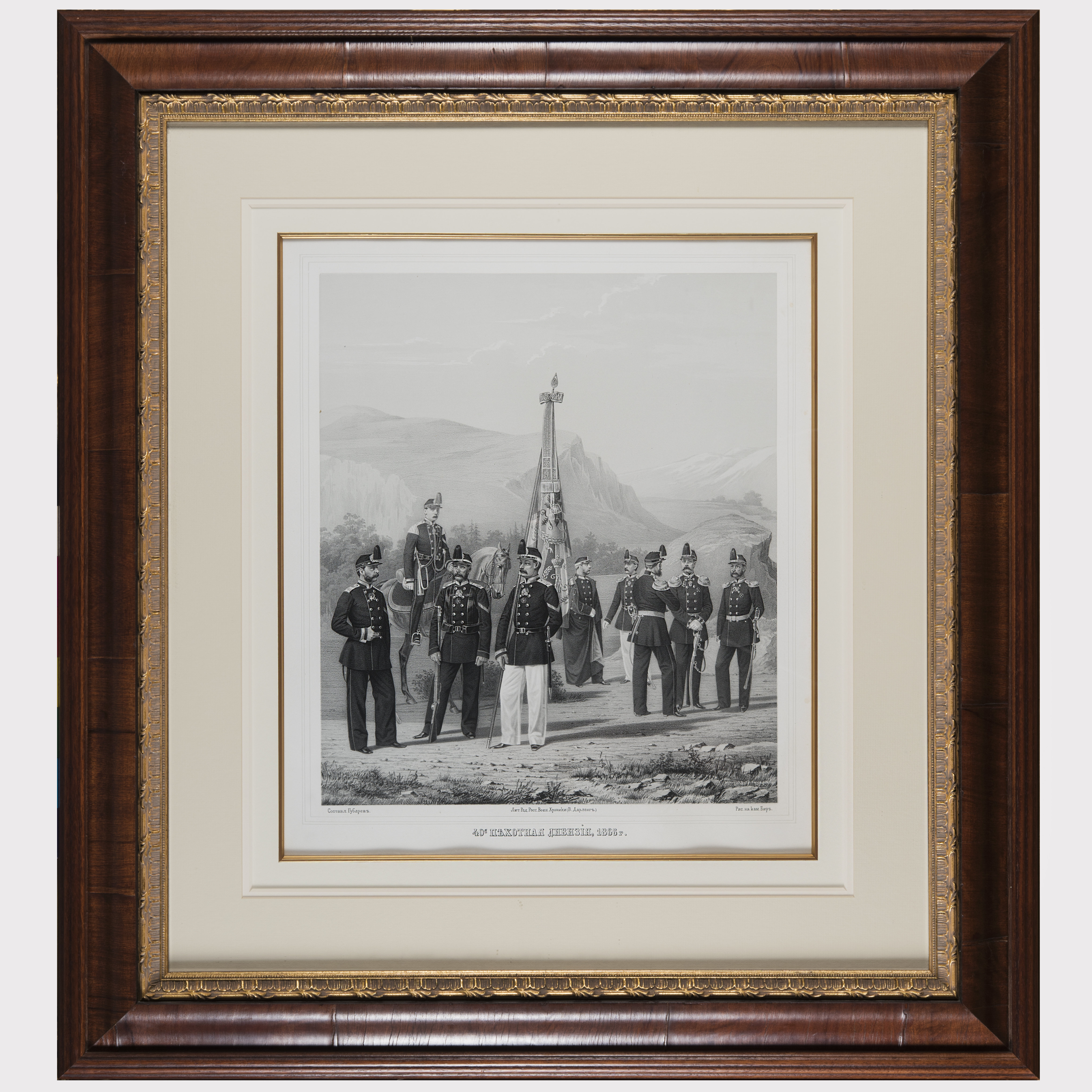Выполнена по рисунку русского художника-баталиста Петра Кирилловича Губарева (1818 – не ранее 1874), гравер Р. Бир. Из серии литографированных изображений форм обмундирования русской армии 1855-1865 годов. Бумага, типографская печать, под изображением литографированные надписи: «Составл. Губаревъ», «Лит. Ред. Росс. Военн. Хроники (В. Дарленгъ.)», «Рис. на кам. Биръ.». Издание редакции Российской Художественной (военной) хроники В. Дарлинга. Размер изображения (в/ш): 40,5 х 35,6 см, листа: 47 х 41 см, в раме: 83 х 76 см.