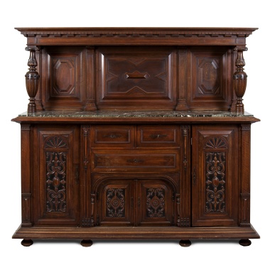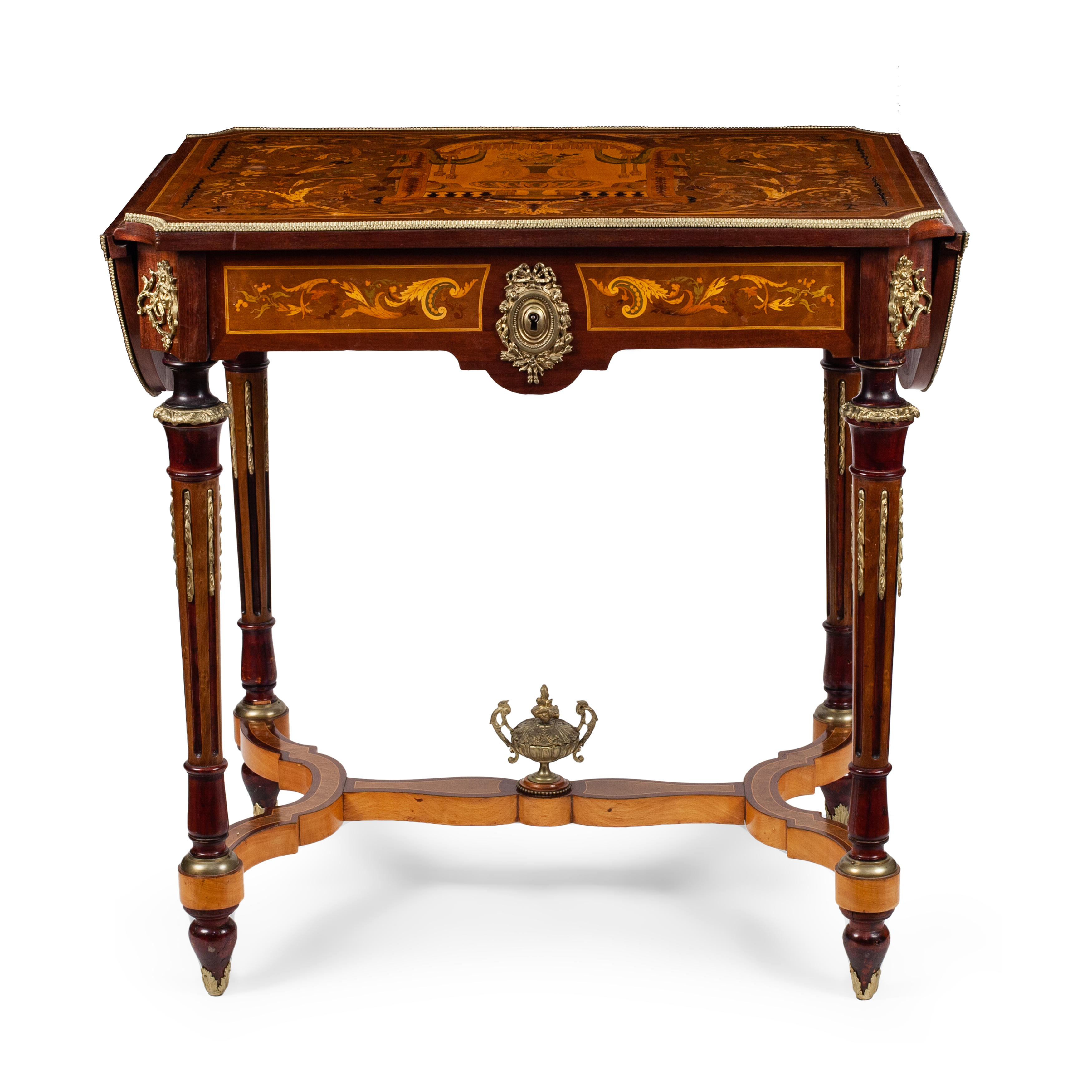 Дерево (основа), шпонирование, техника маркетри (инкрустация ценными породами дерева: розовое дерево, палисандр, груша), металлические накладки, бронза. Западная Европа, конец XIX века, размер: высота 76 см, длина 78 см, ширина 57 см