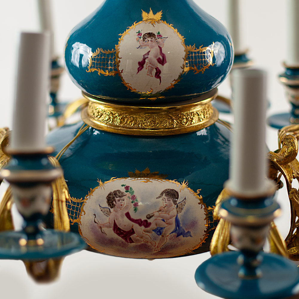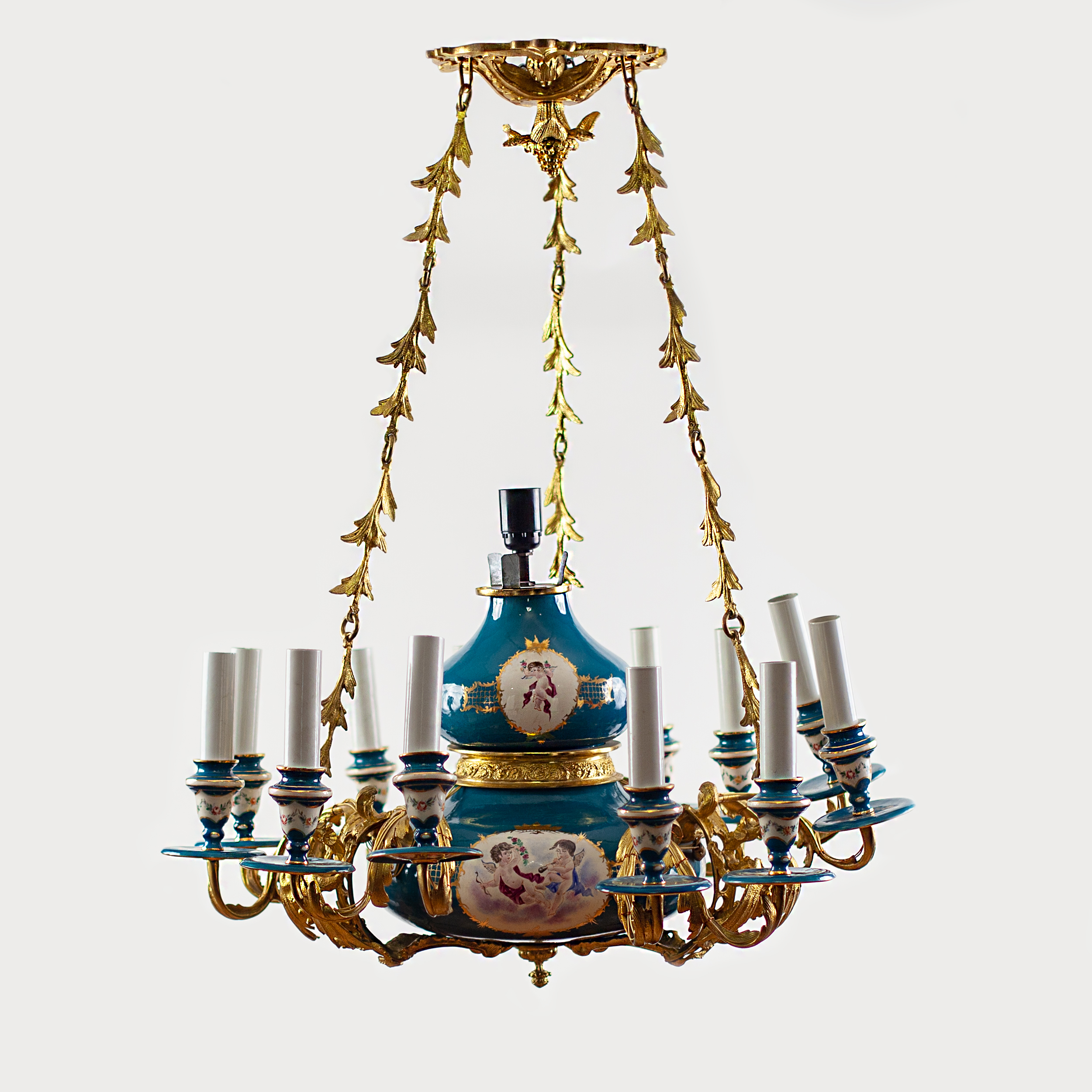 Фарфор, бирюзовое крытье, деколь, бронза, чеканка, золочение, Европа, ХХ век, размер: высота 90 см, диаметр - 70 см