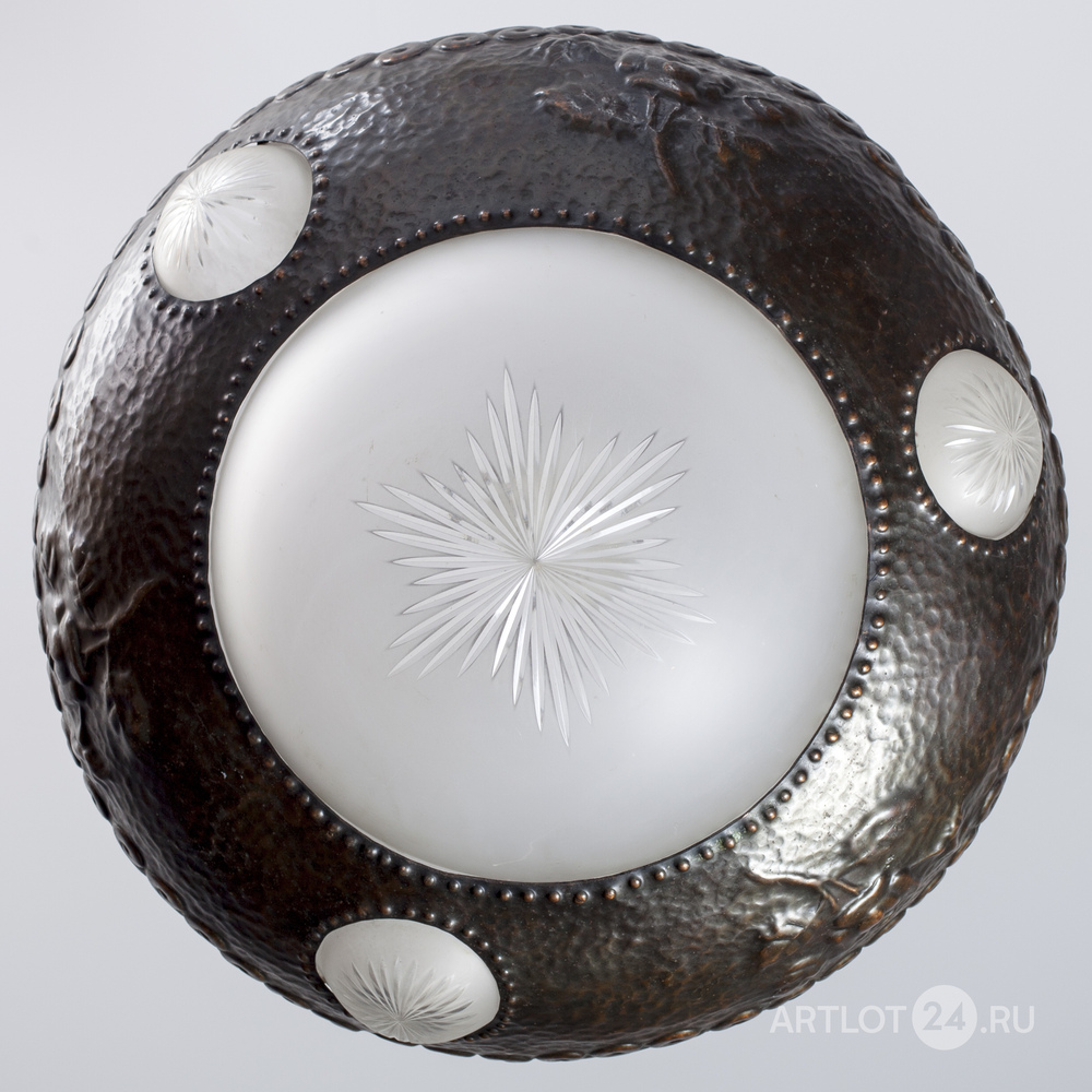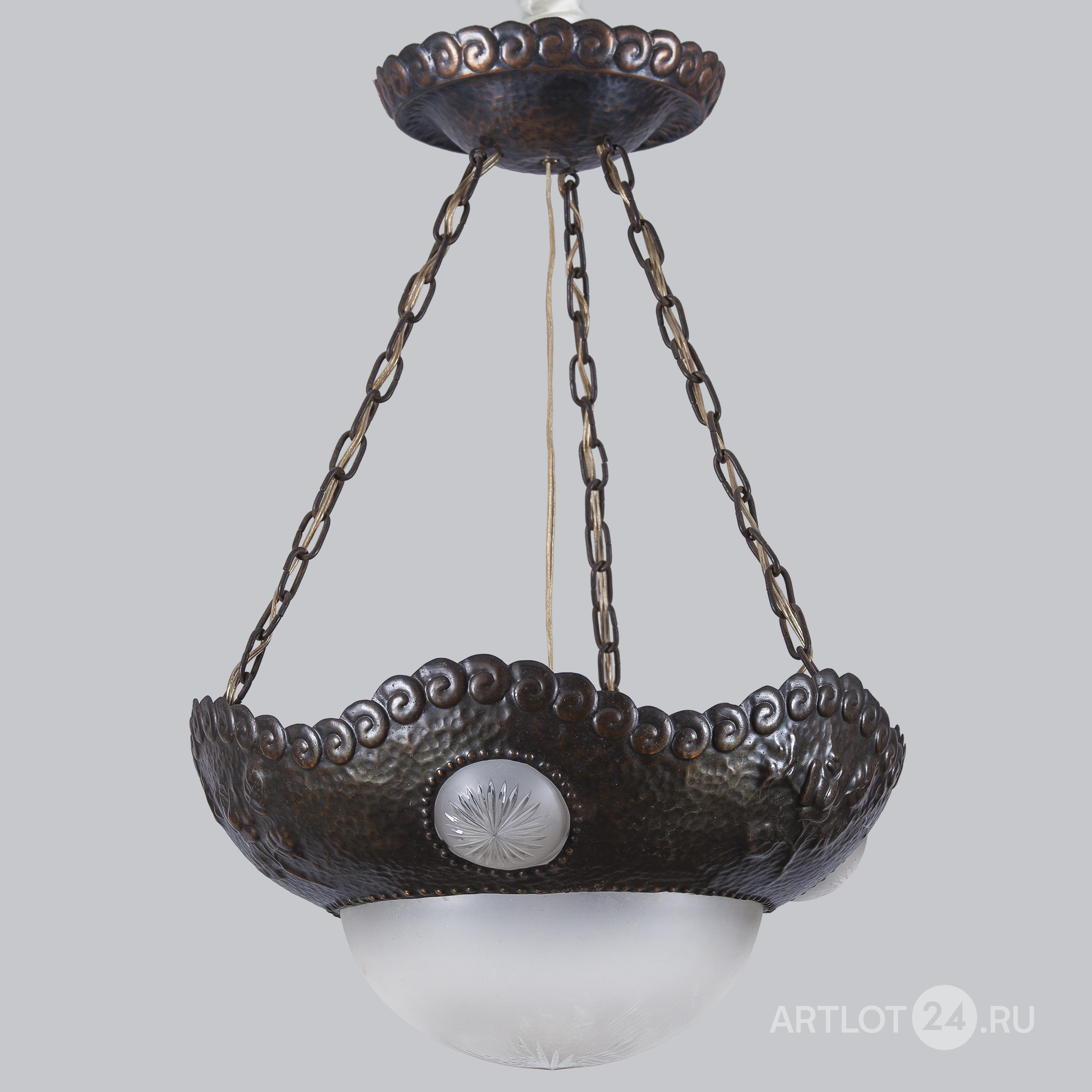 Светильник потолочный на 4 светоточки. Медный сплав, патинирование, штамповка, чеканка, плафон- матовое стекло с граненым рисунком, вставки - бесцветное матированное стекло, Россия, начало ХХ века, размеры: высота - 80 см, диаметр - 50 см