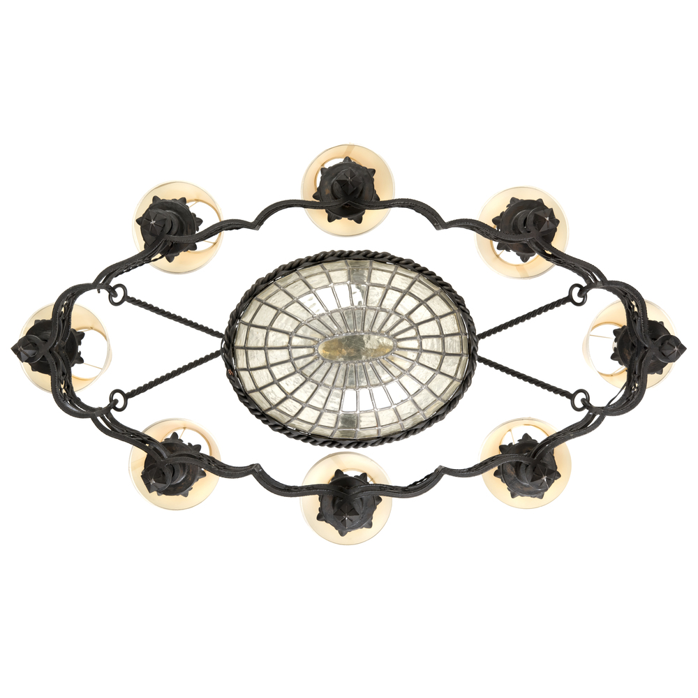 На десять светоточек. Металл, чугун, литье, ковка, плафон бесцветного рельефного стекла в технике витража, Европа, начало ХХ века, размеры (в/ш/г): 105 х 125 х 55 см, длина штока - 120 см