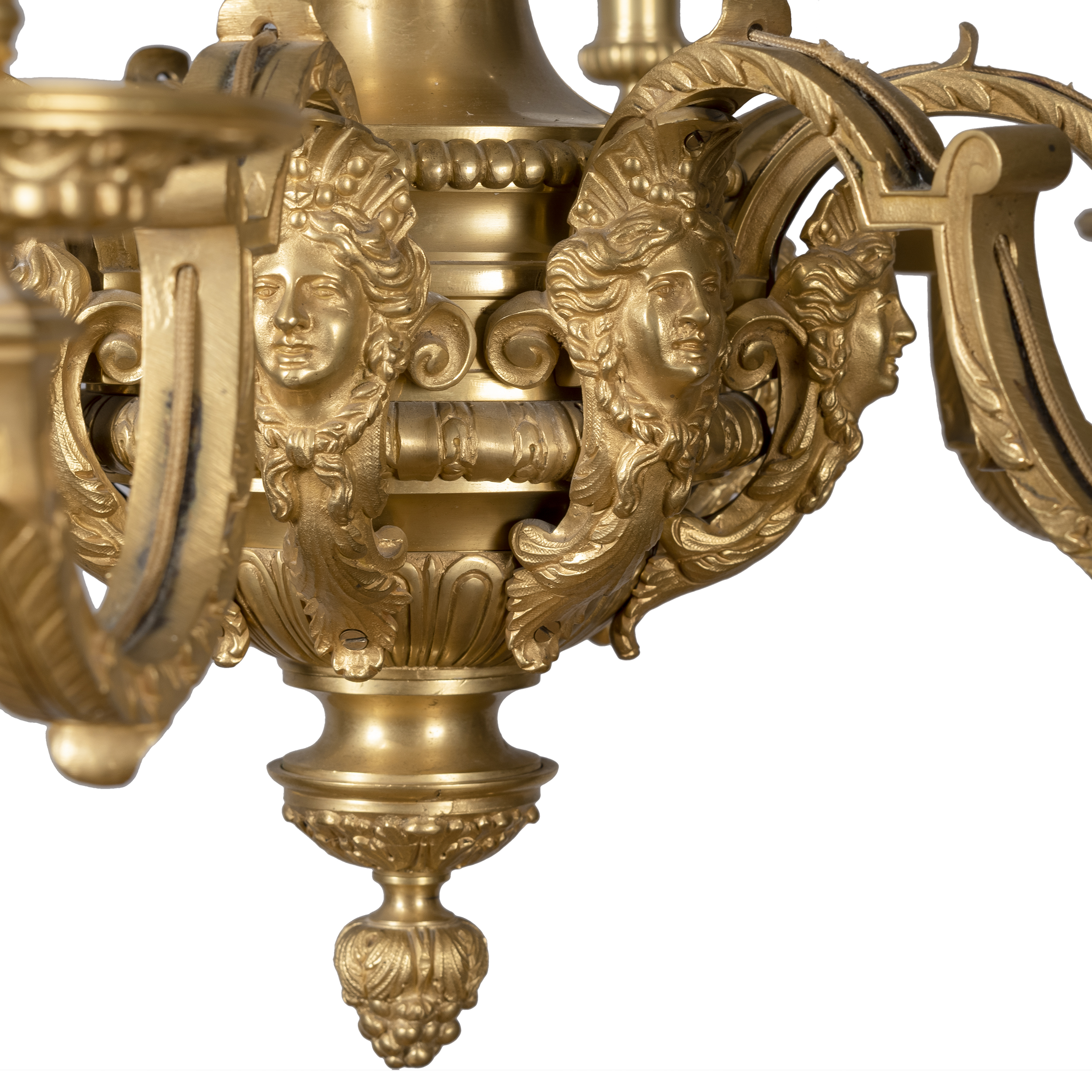 Люстра по образцу начала XVIII века, центральная часть украшена женскими маскаронами и листьями аканта, на 8 светоточек. Бронза, литье, чеканка, золочение, Франция, XIX век, размеры: высота 120 см, диаметр: 71,5 см