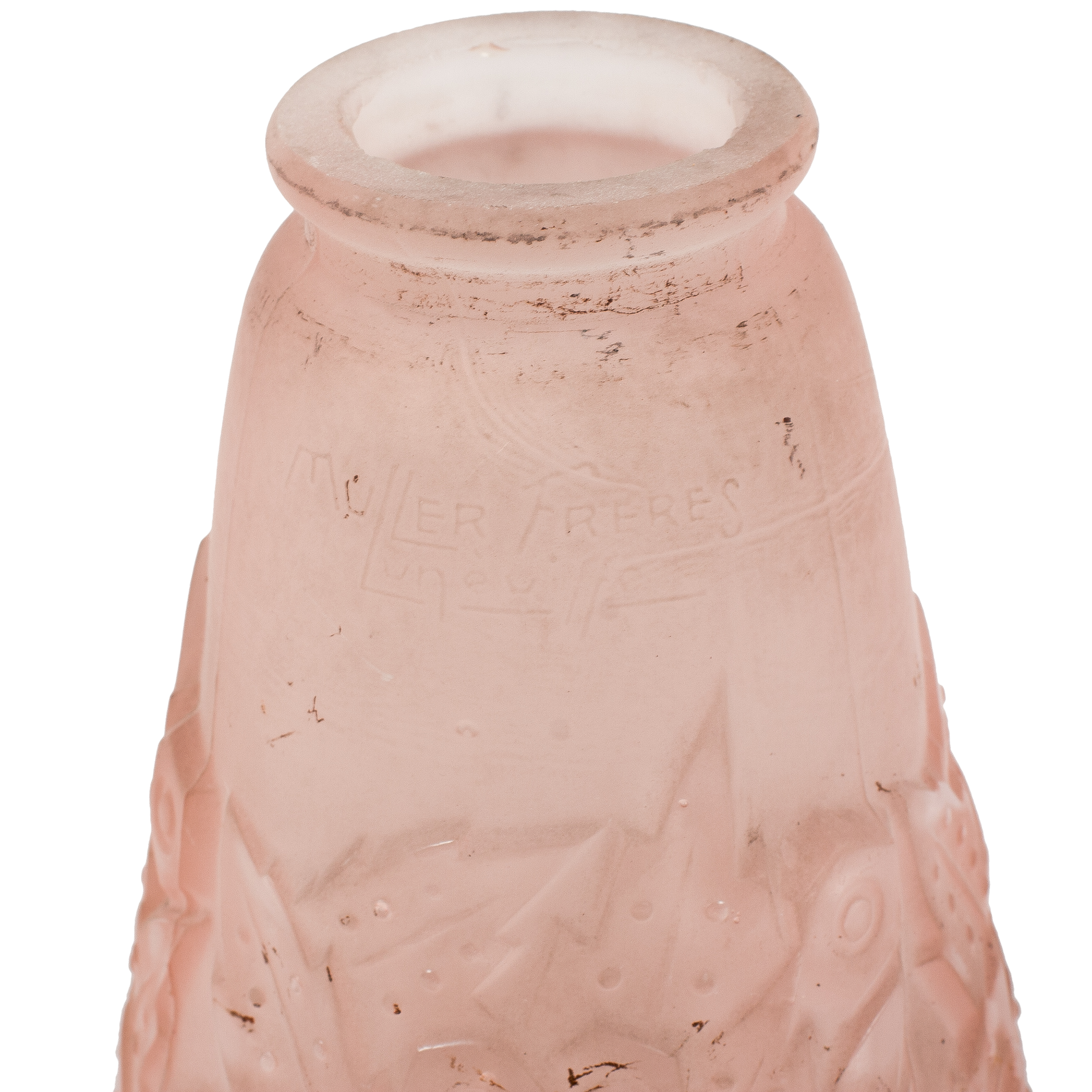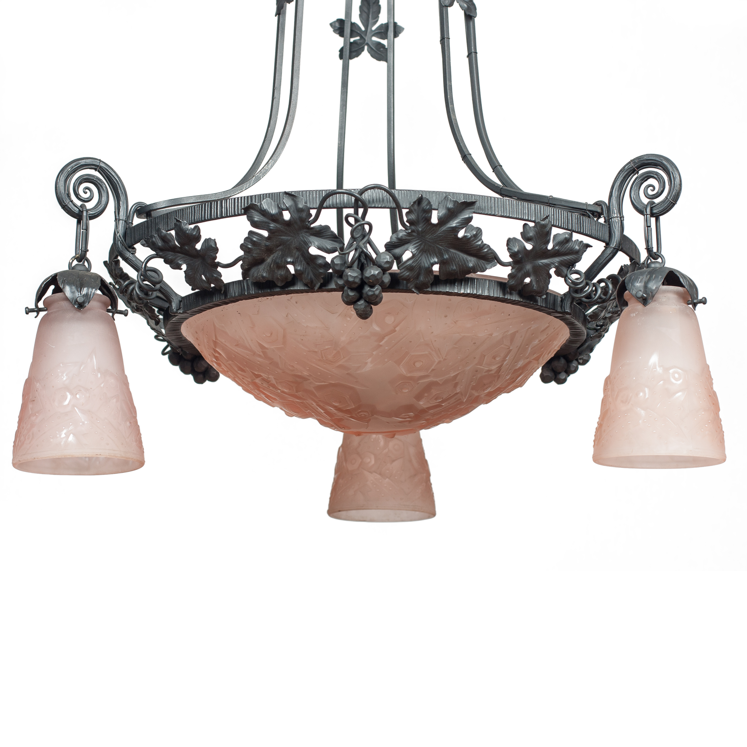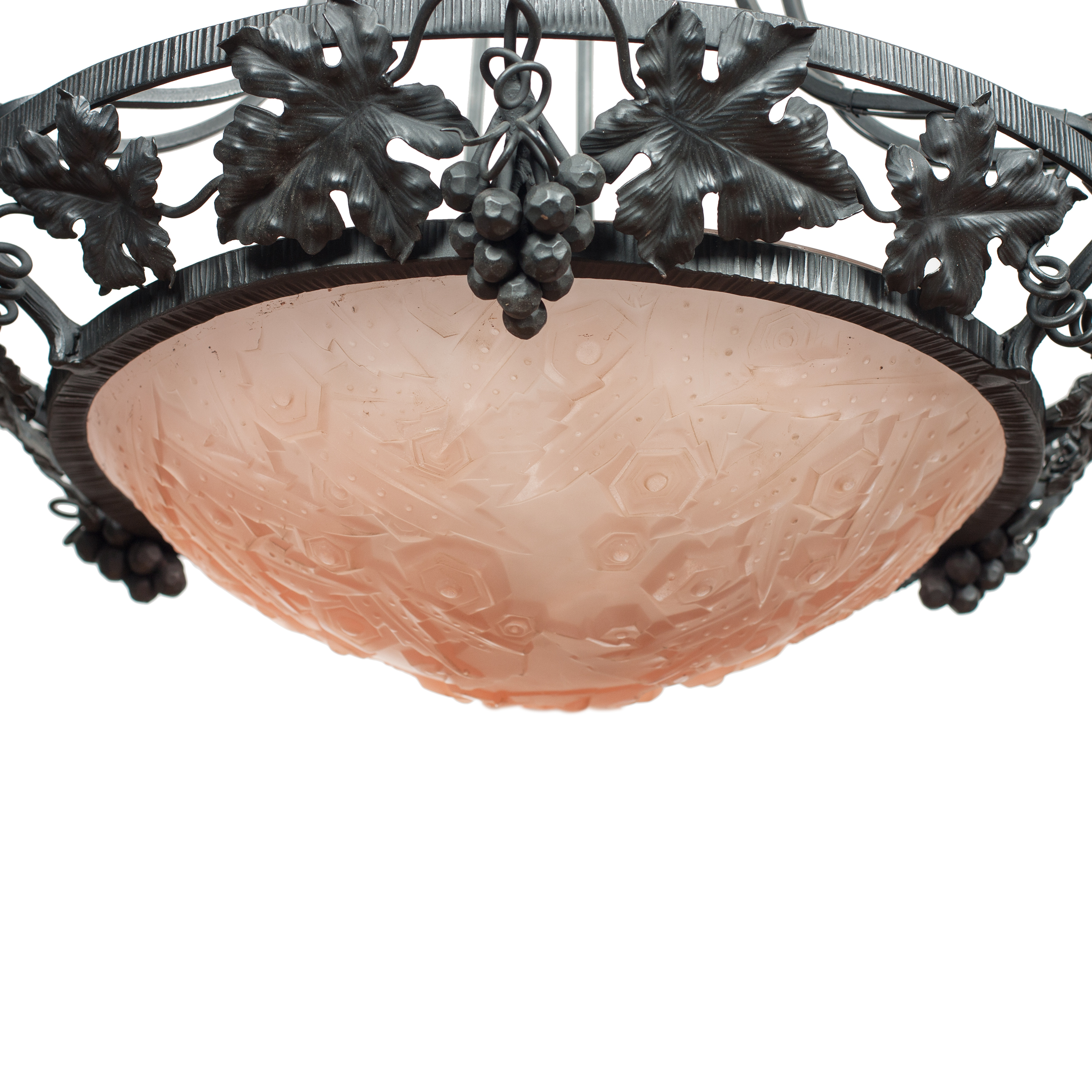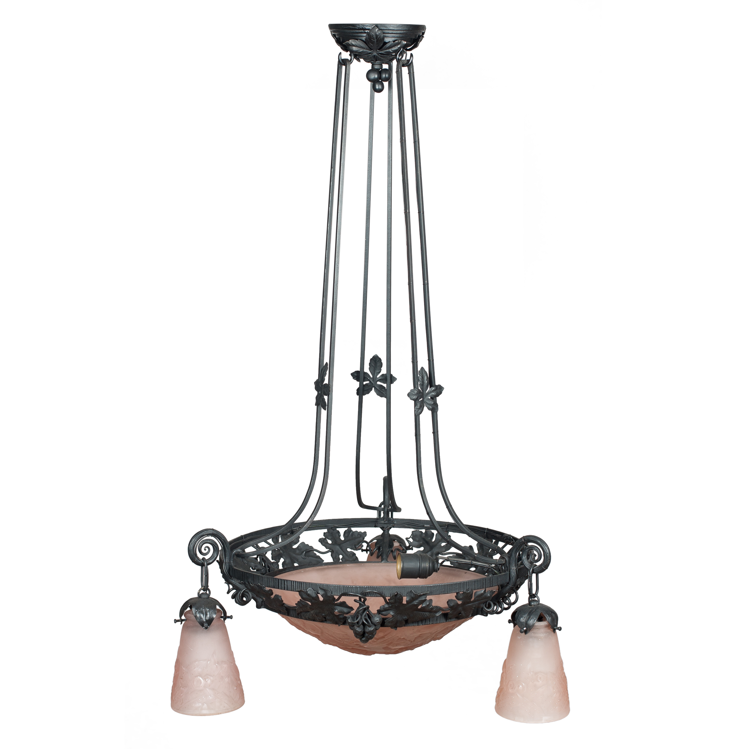 Металл, литье, ковка, плафоны - матовое многослойное прессованное стекло розового цвета, матирование, подпись на стекле «Muller Freres Luneville»