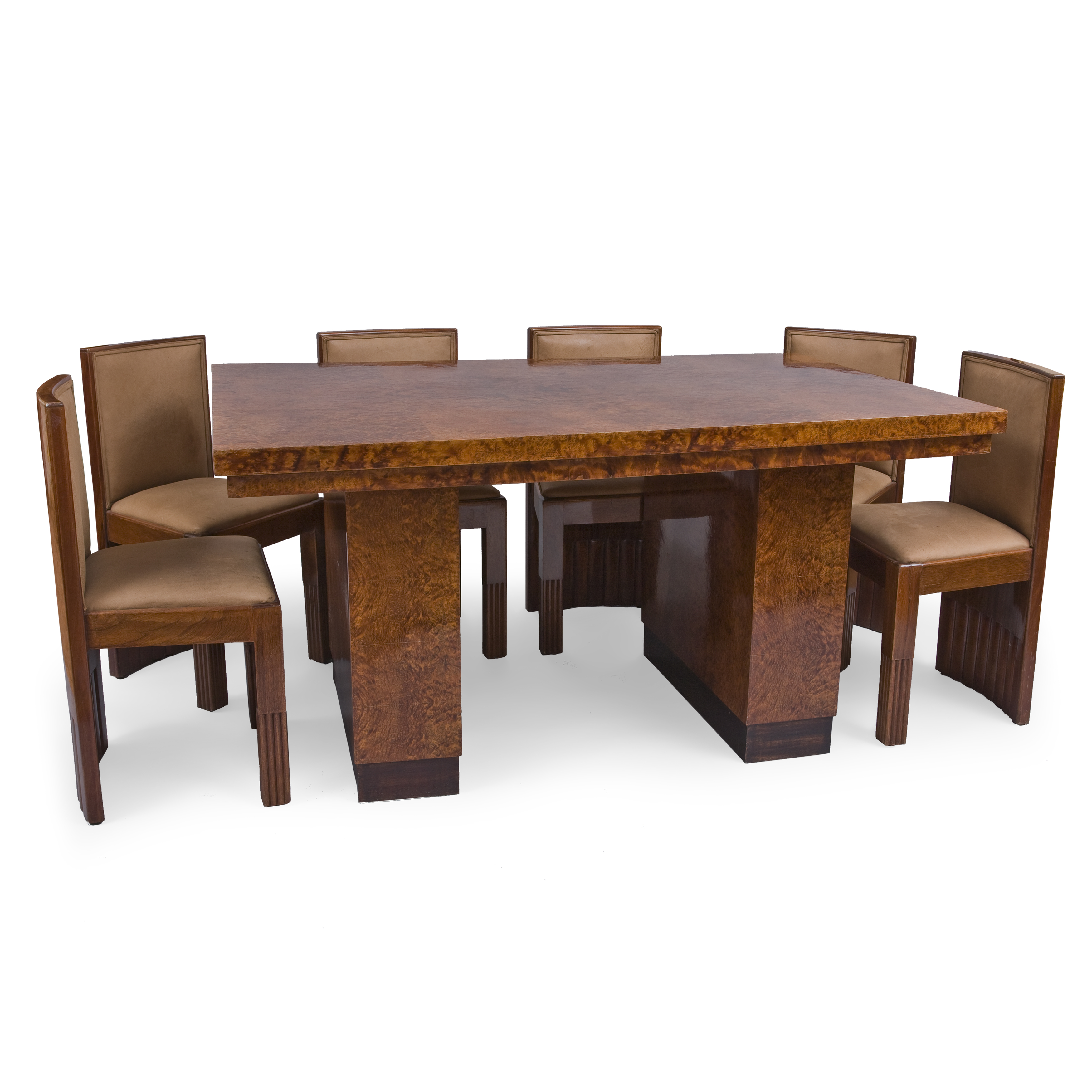 Красное дерево, шпон тополя «птичий глаз», кожа, столярная работа, Европа, начало XX века, размер (в/ш/г): стол - 77 х 150 x 99 см, стулья - 81 х 44 х 38 см