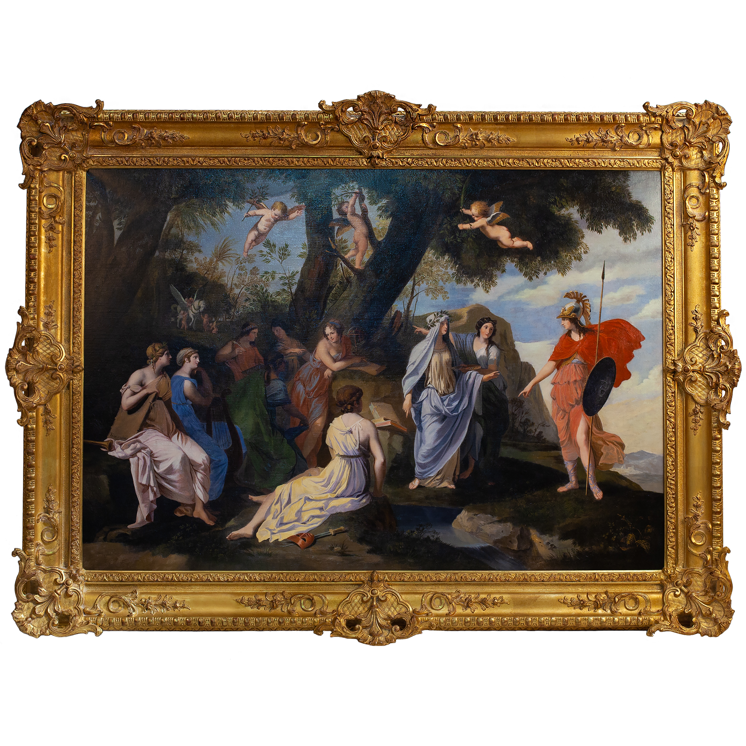 Вся сцена, запечатлённая художником, дышит гармонией и умиротворением. Кажется, что время здесь остановилось, а небесные мелодии сливаются с шелестом листвы, рождая неповторимую симфонию красоты и мудрости. Это не просто картина, а окно в мир грёз, где боги и музы живут в согласии, даря миру свет знаний и вдохновения.