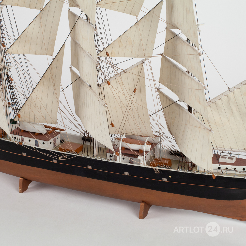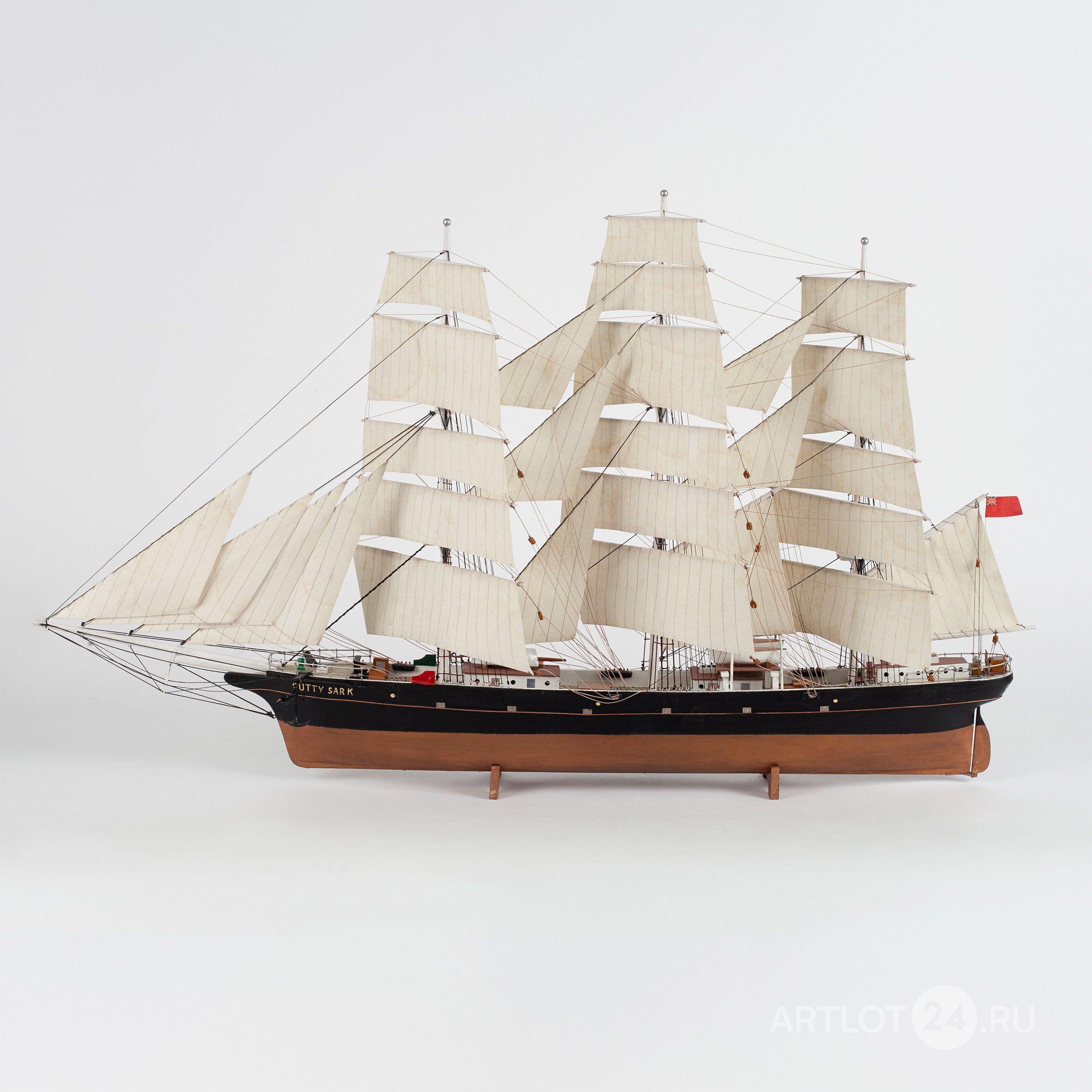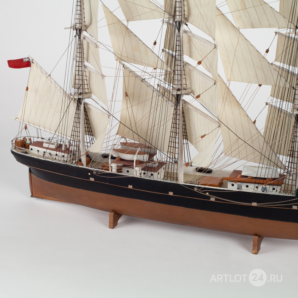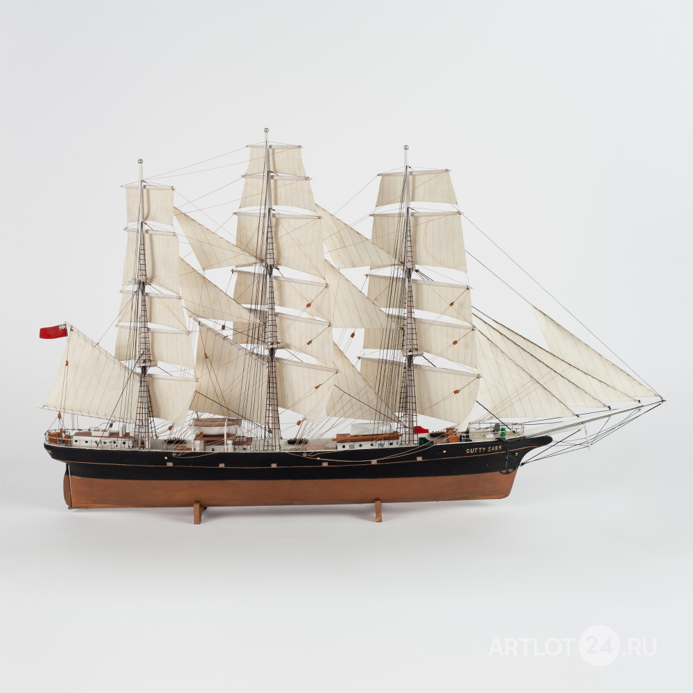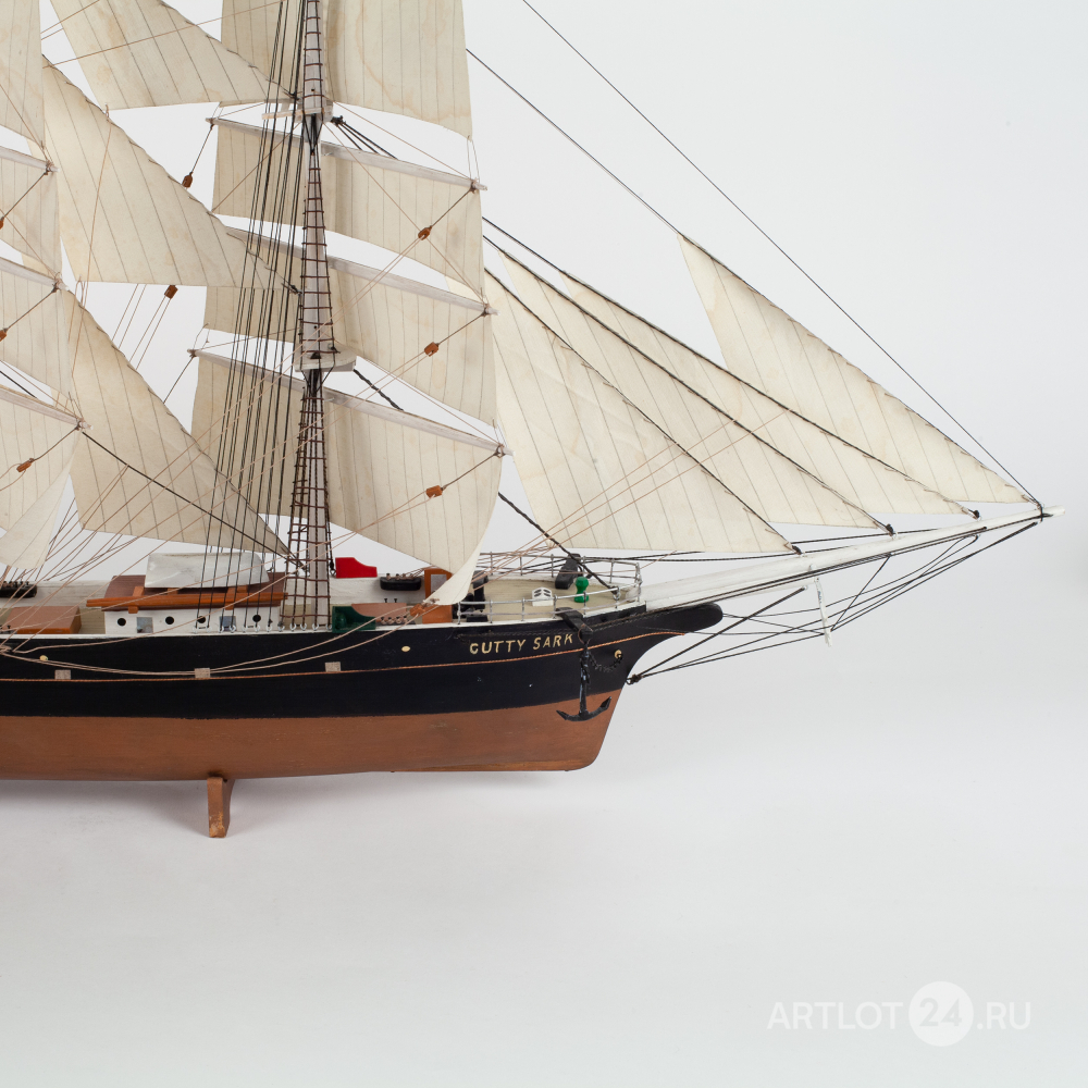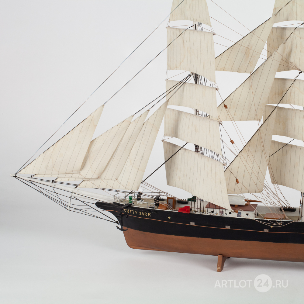 Модель корабля знаменитого британского клипера «Cutty Sark», построенного в 1869 году. Деревянная корма, использование различных пород дерева, окрашивание, шпатлевка, смолы, металл, ткань, название по борту «Cutty Sark», Европа, вторая половина XX века, размер (в/ш/г): 42 х 53 х 14 см