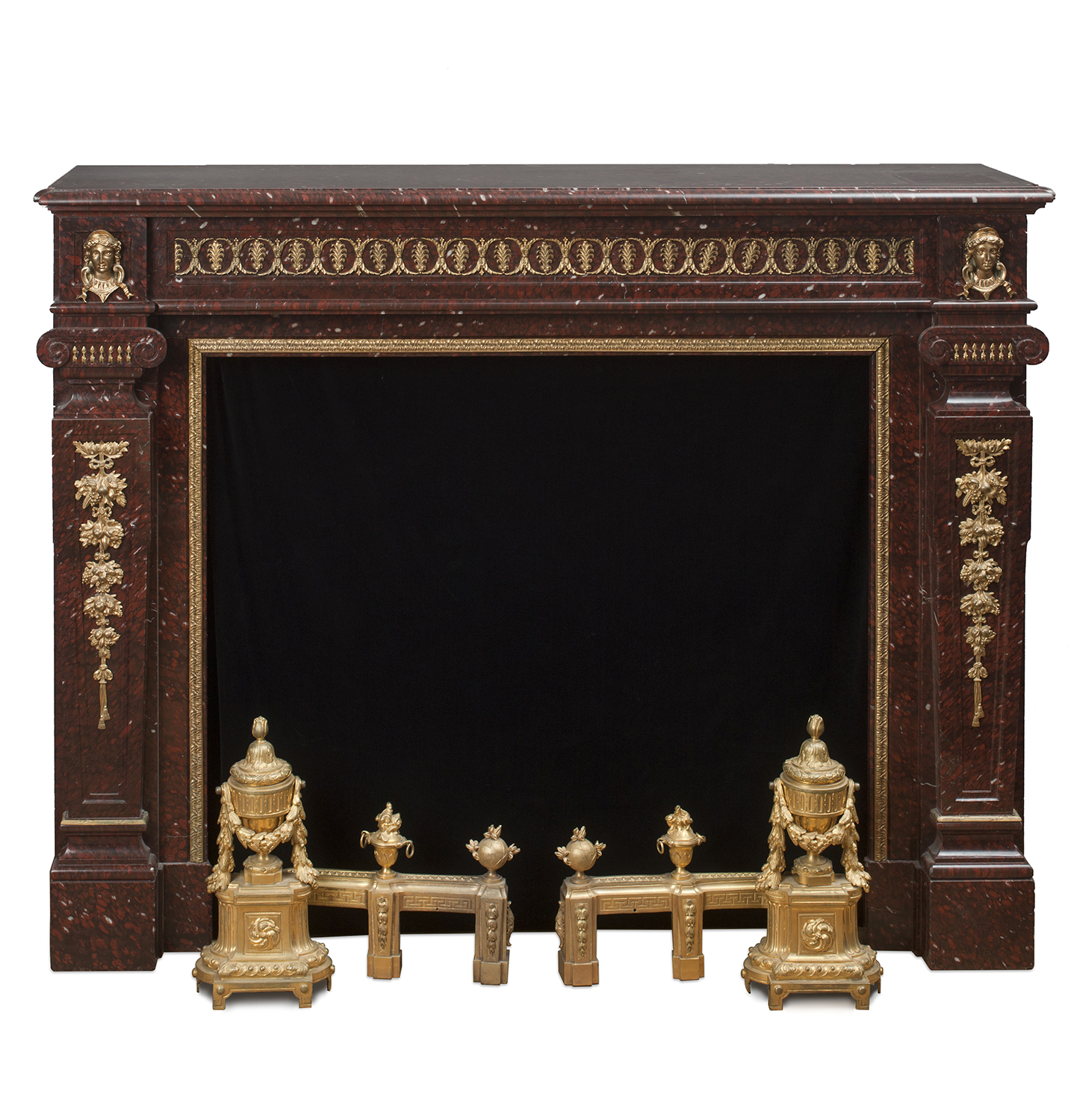 С пилястрами в виде колонн ионического ордера, украшенными маскаронами и гирляндами роз. Мрамор гриотт, шлифовка, полировка, бронза, литье, чеканка, золочение, Европа, XIX век, размеры: высота/ширина/глубина 113х145х37 см
