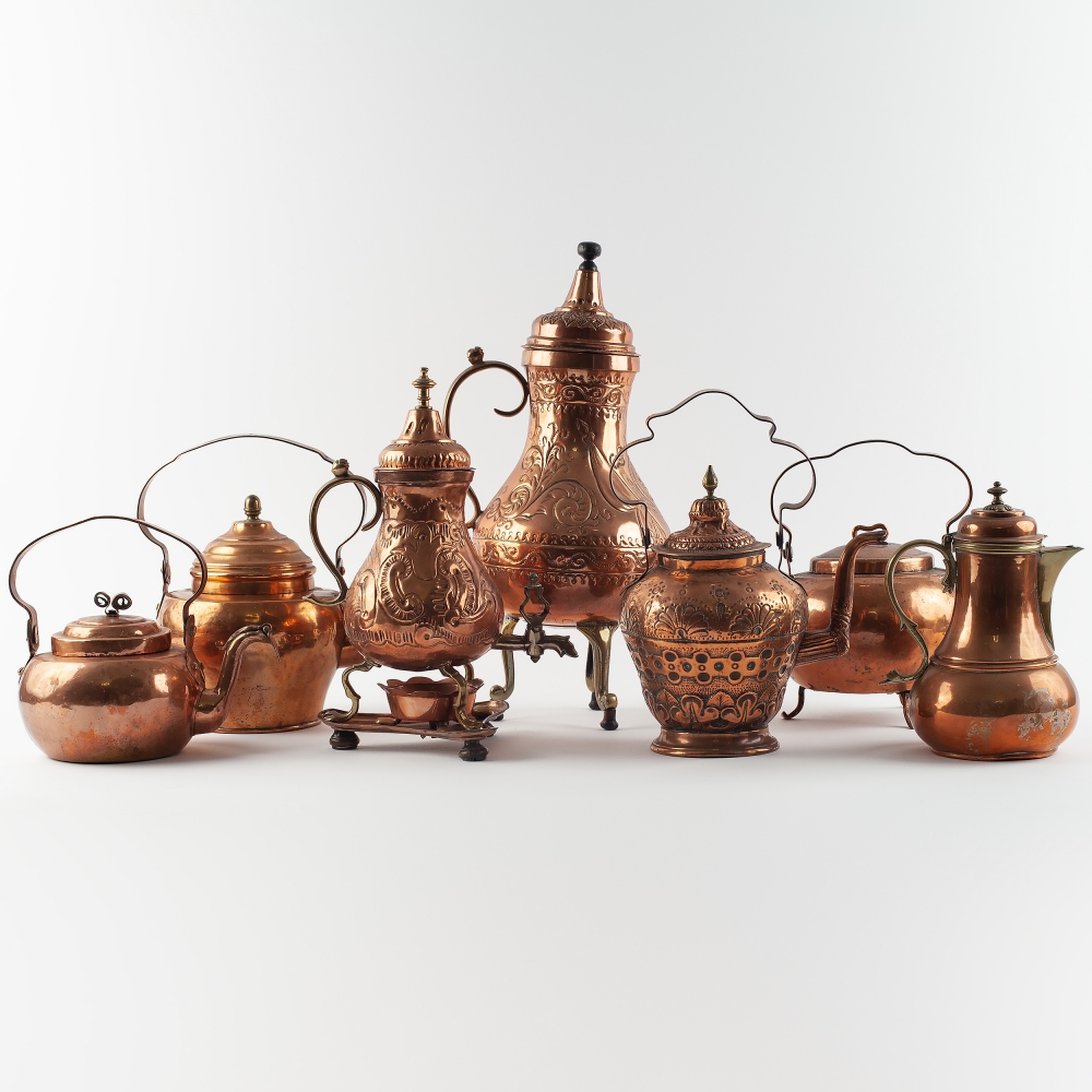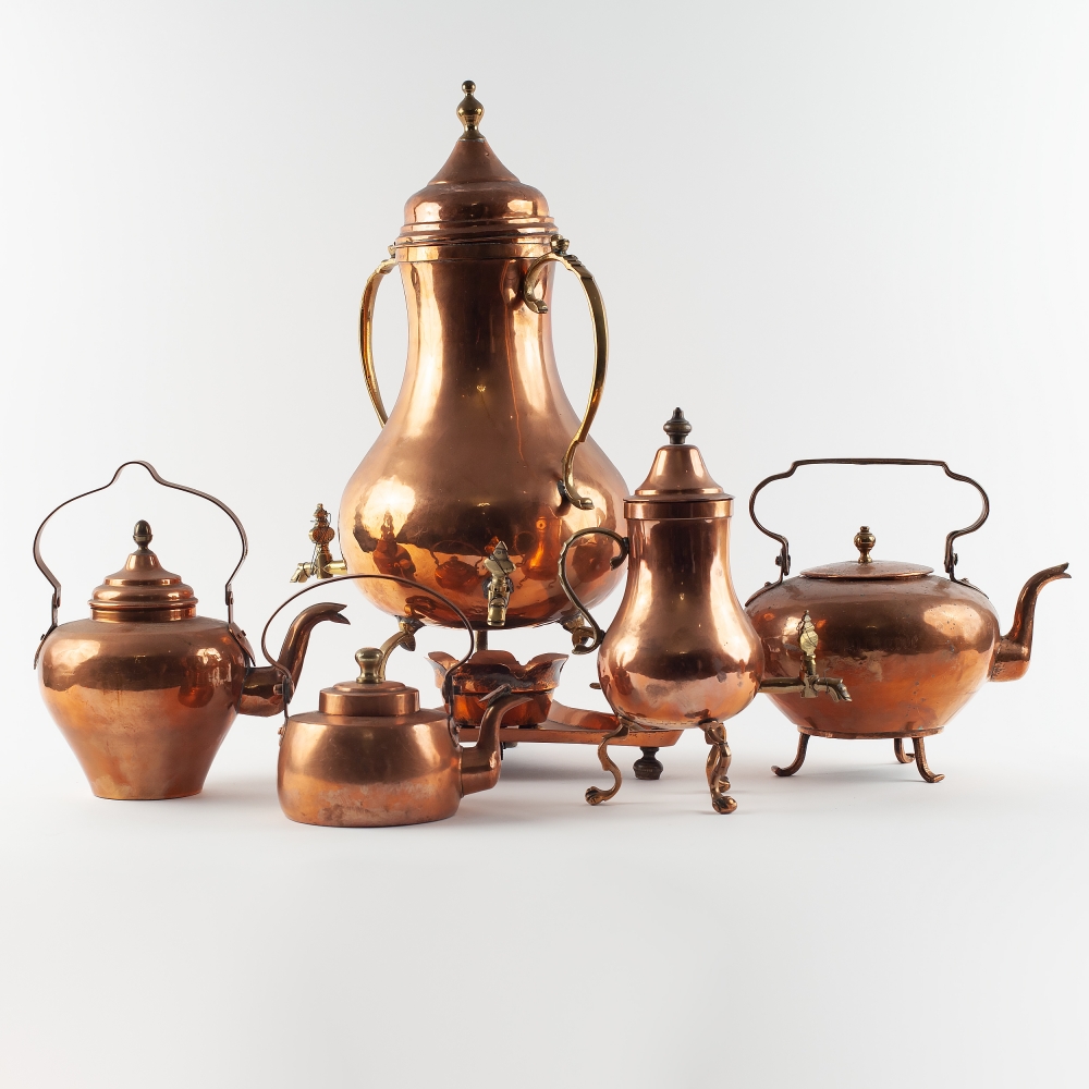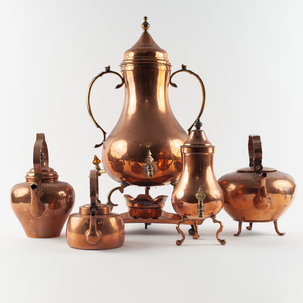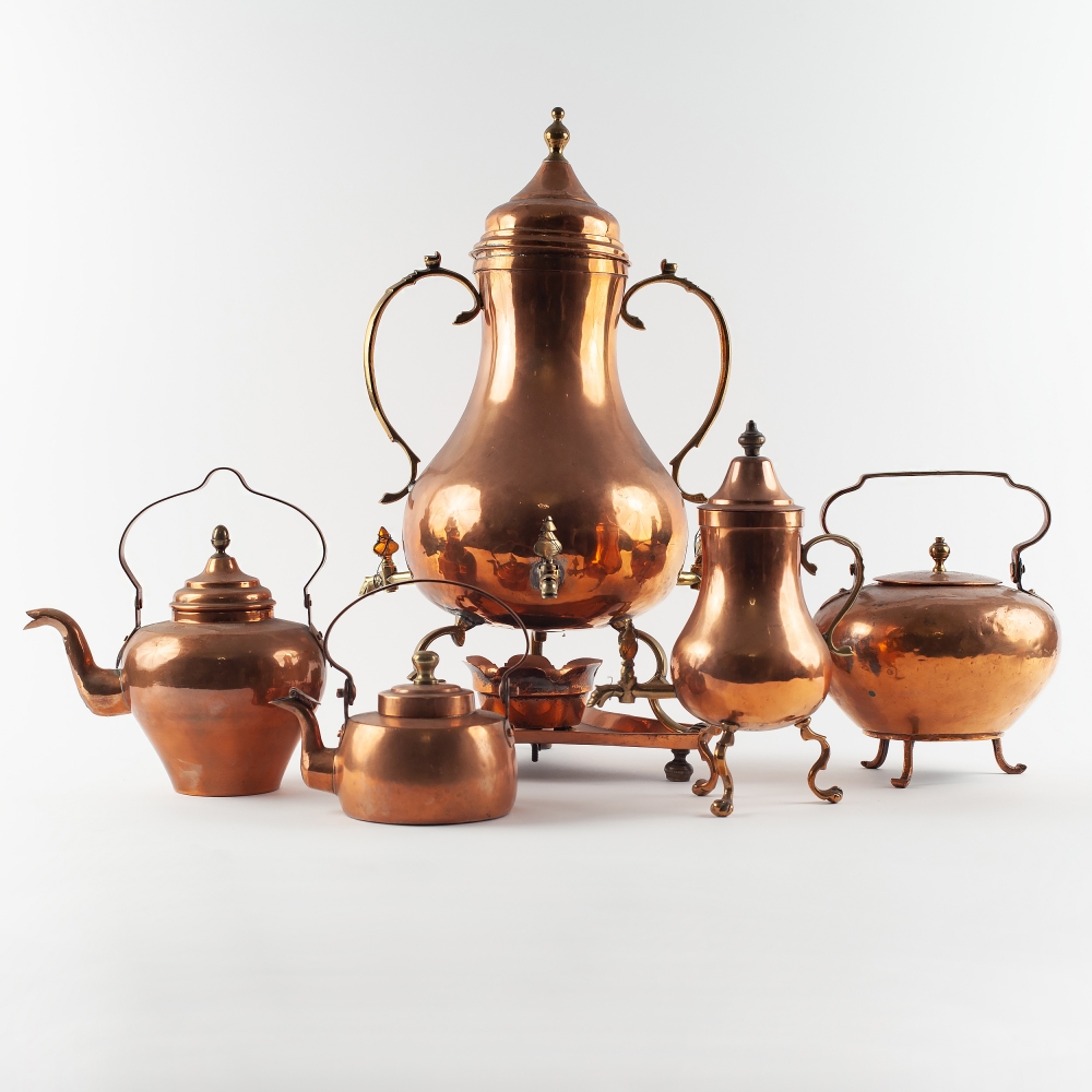 Состоит из 14 предметов. Медь, латунь, внутри лужение, выколотка, штамп, дерево, монтировка, Европа, конец XIX – начало XX века, высота большего чайника – 47 см