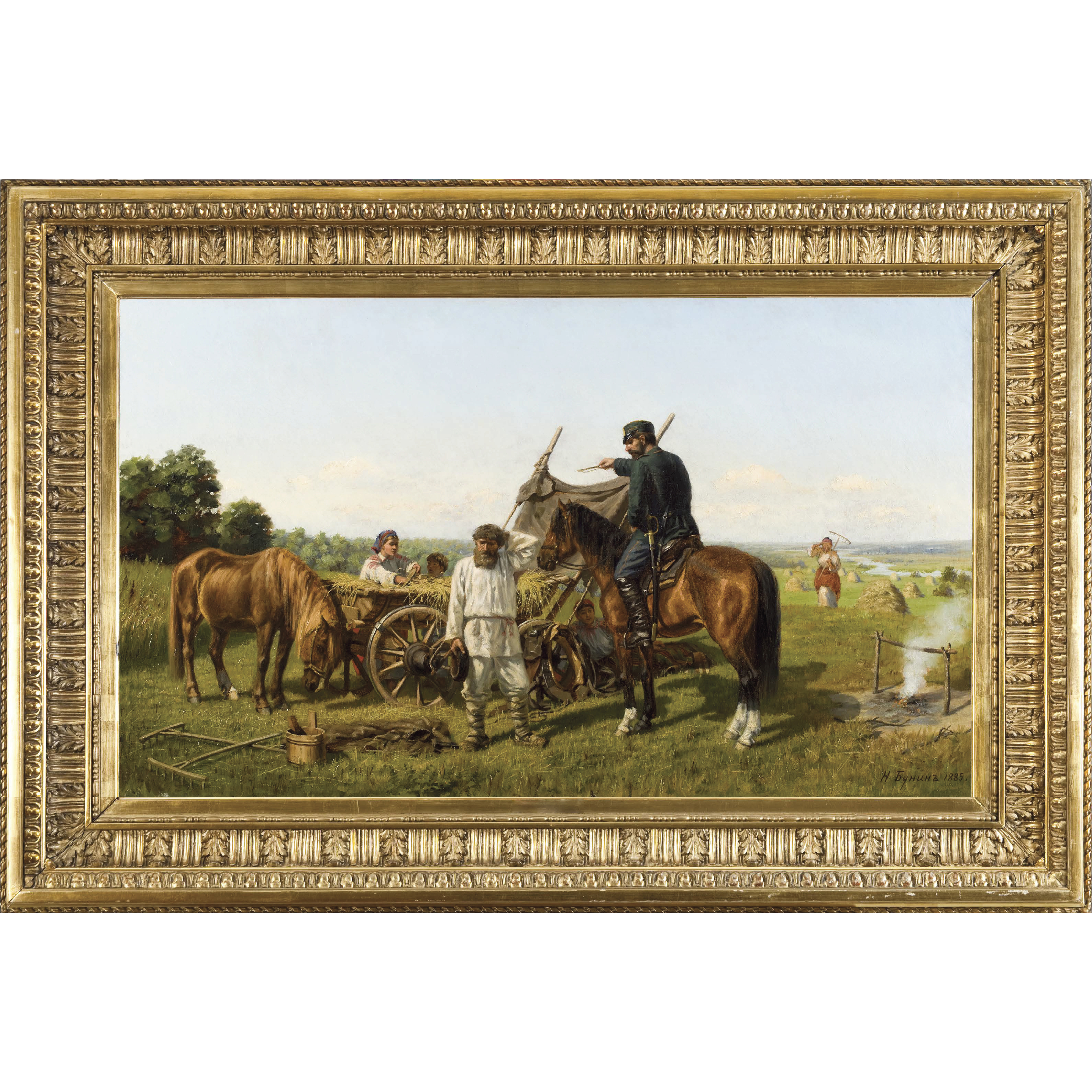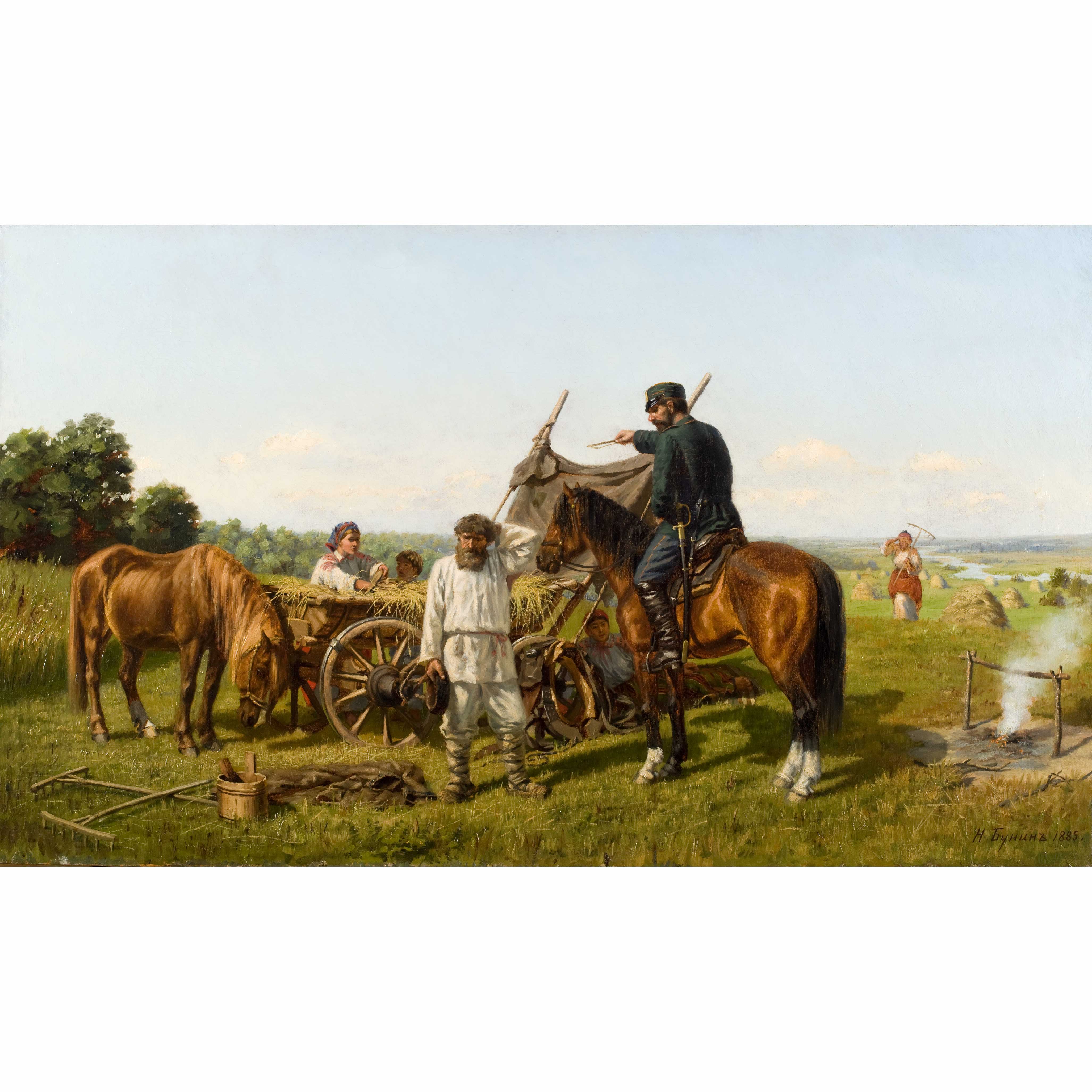 Выполняя академические задания, Н.Н. Бунин писал картины на темы взаимодействия военнослужащих с крестьянами, как, например, представленное полотно "Урядник", напечатанное в журнале "Нива".