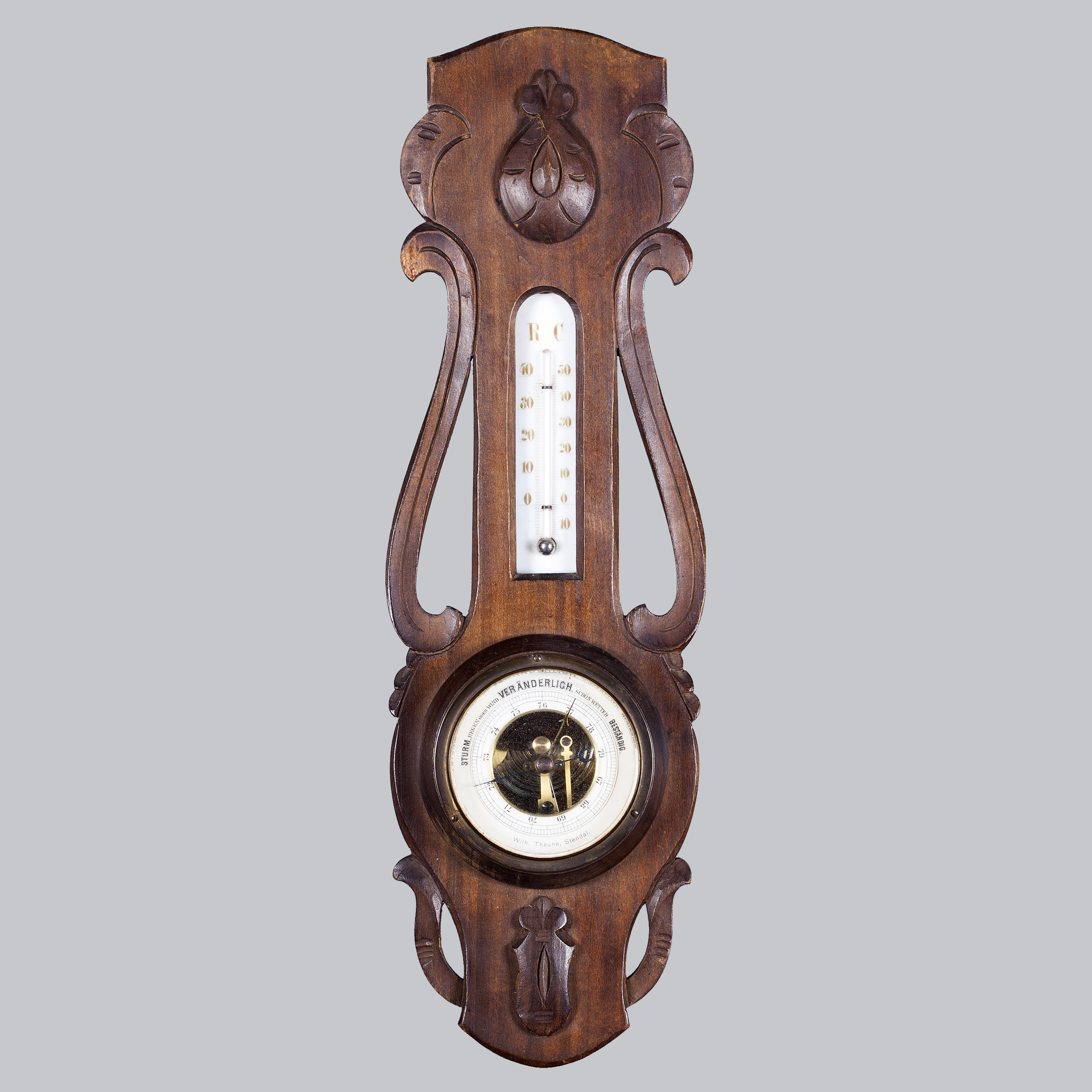 Деревянный корпус, резьба, столярная работа, механизм барометра, термометр, Германия, 1930-е годы, размер (д/ш): 47 x 15 см