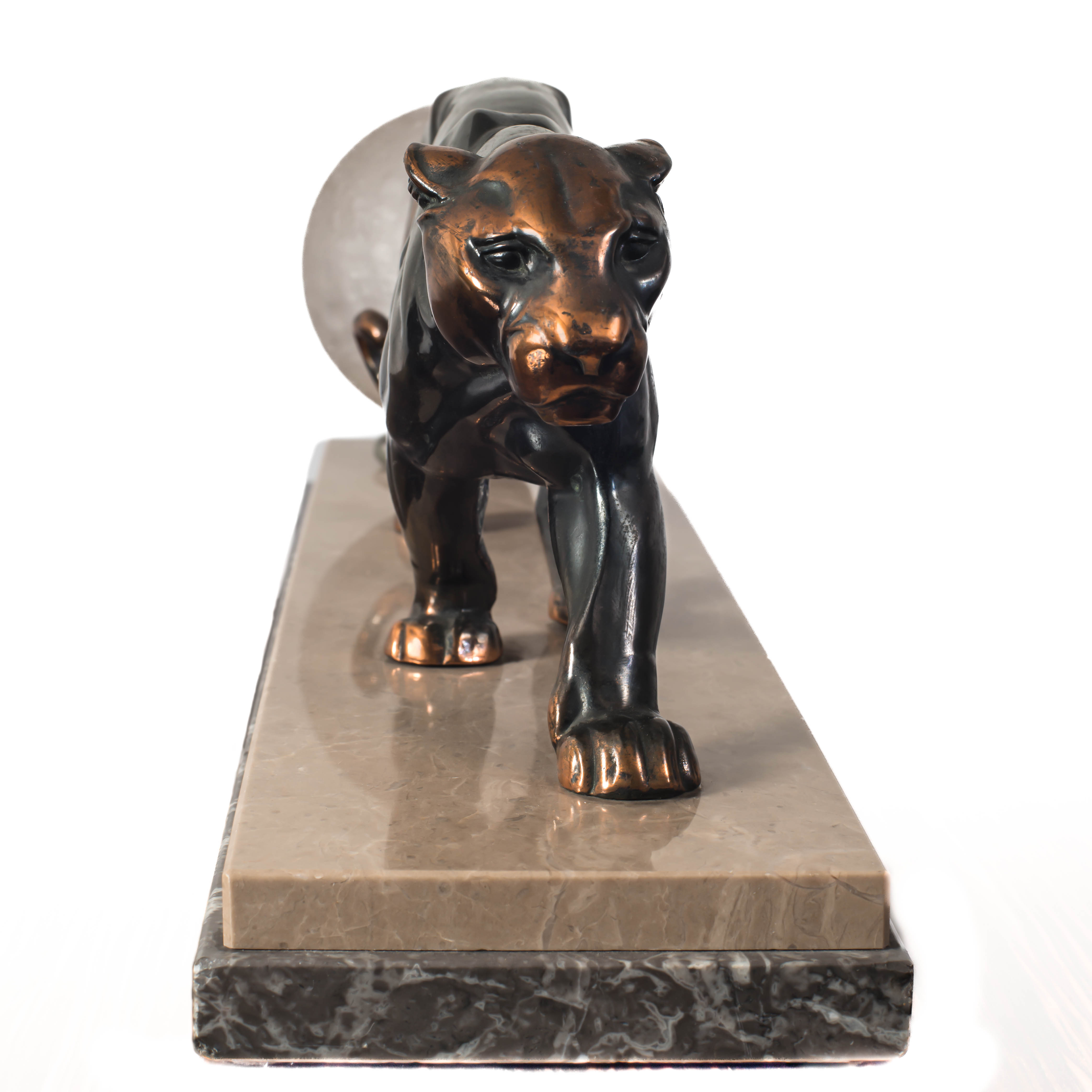 Предположительно по модели Макс Ле Верье. Бронза, литье, патинирование, мрамор, аутентичный плафон в технике кракле, Макс Ле Верье (Луиз Октавиан Максим ле Верье, Max Le Verrier, 1891-1973), размер (в/д/г): 19 х 60 х 14 см.