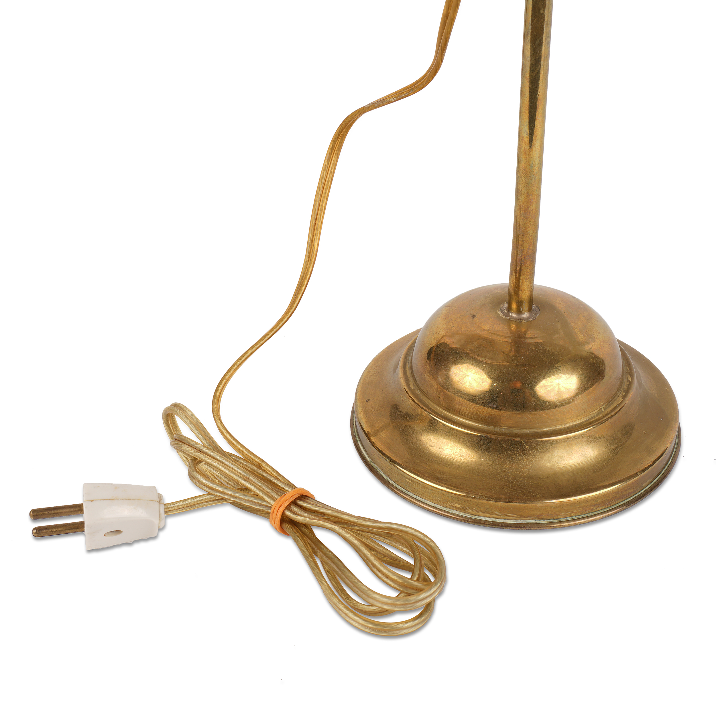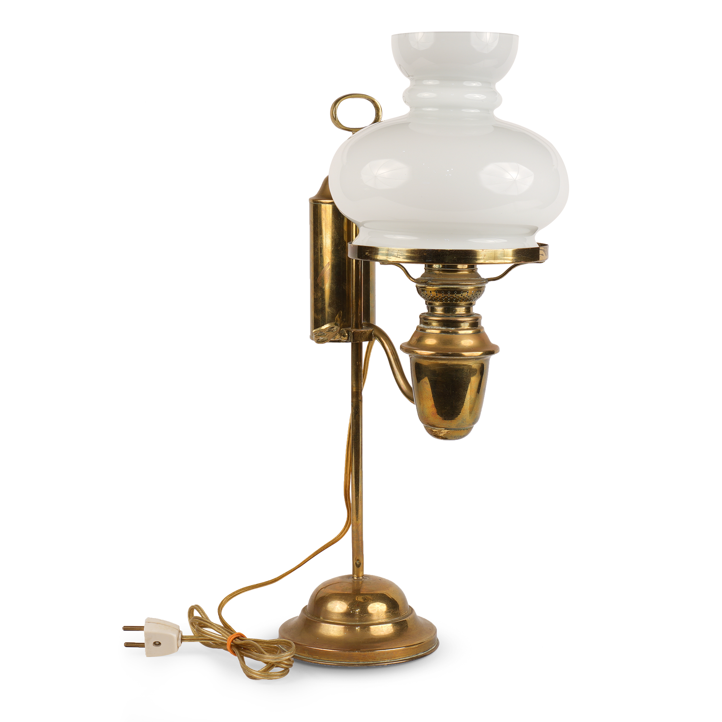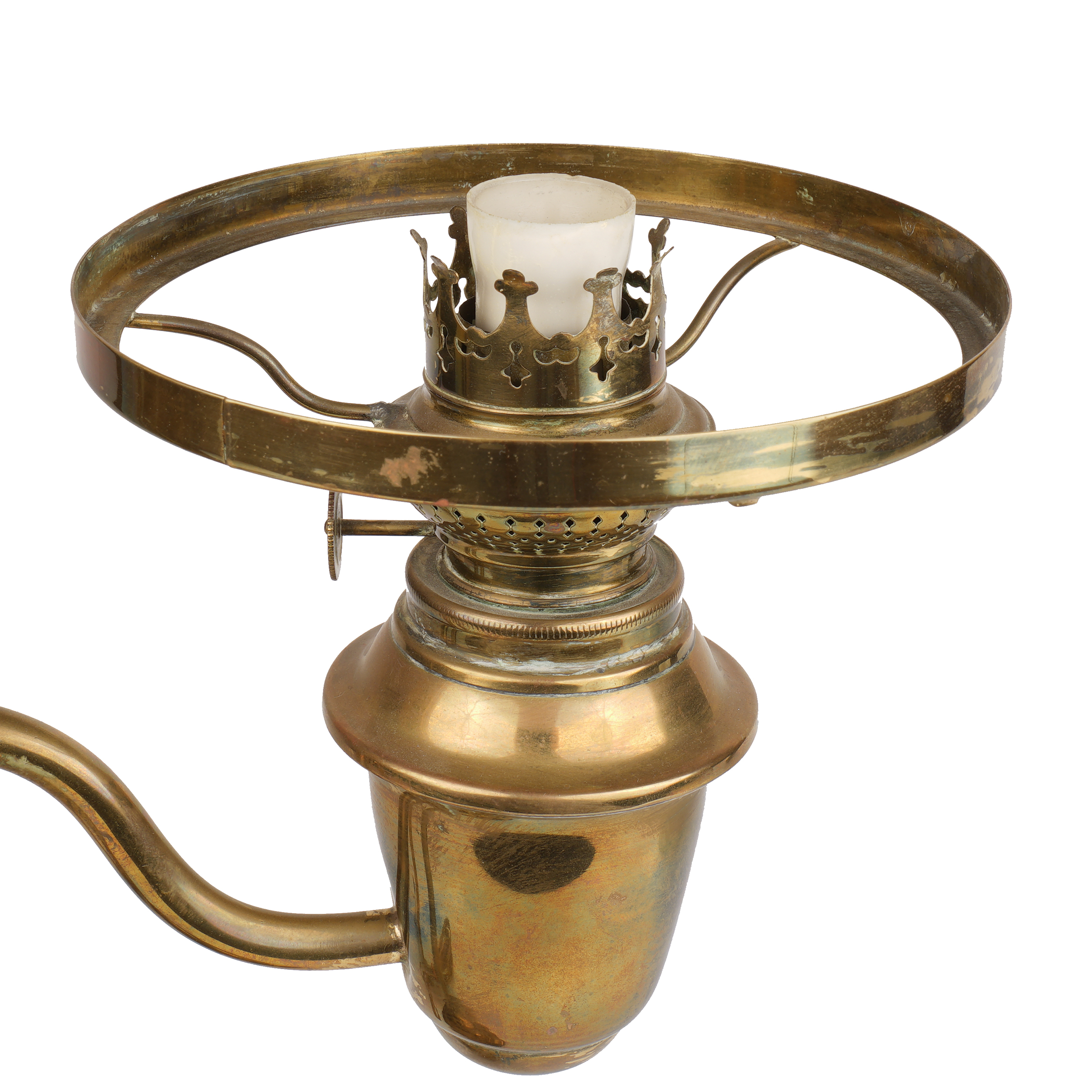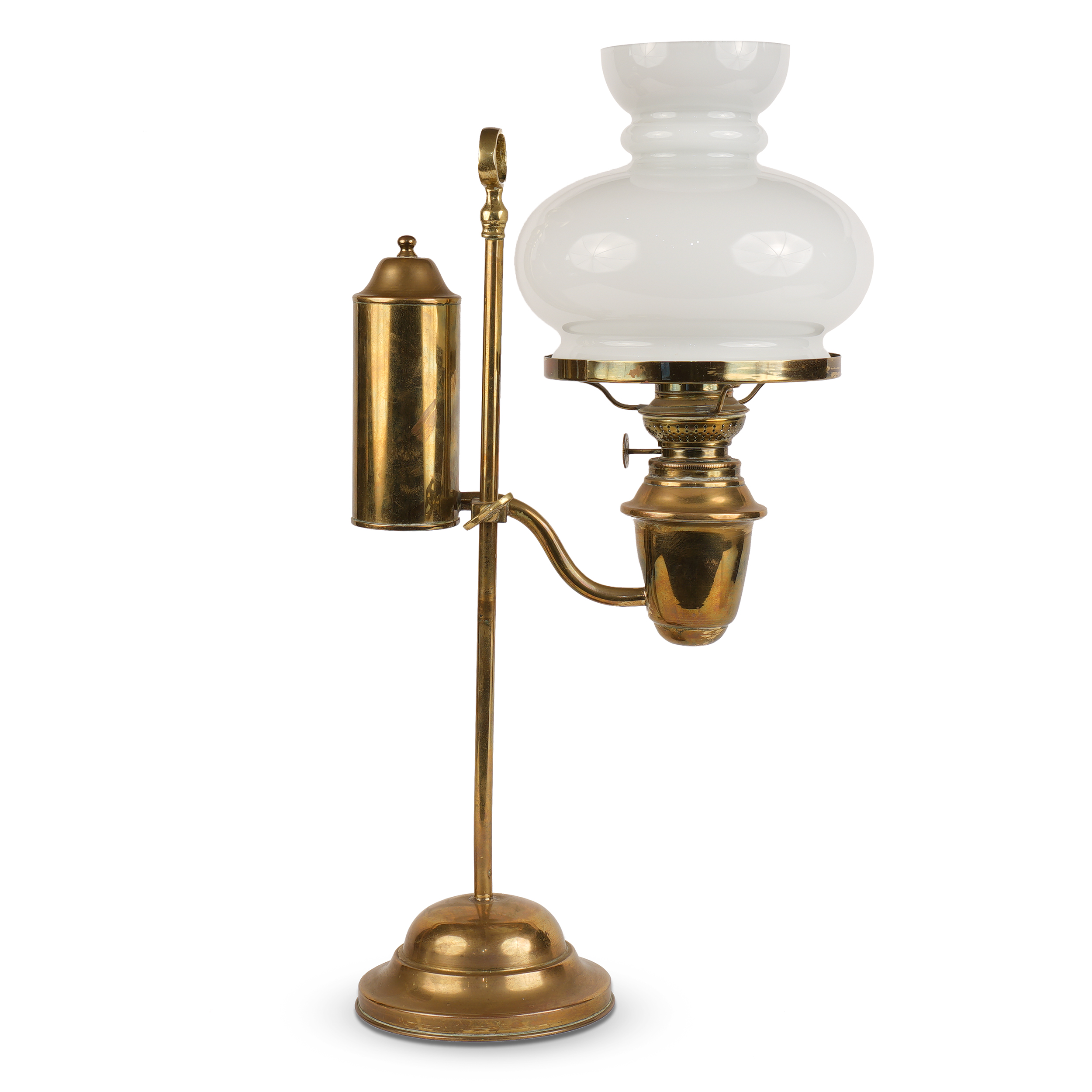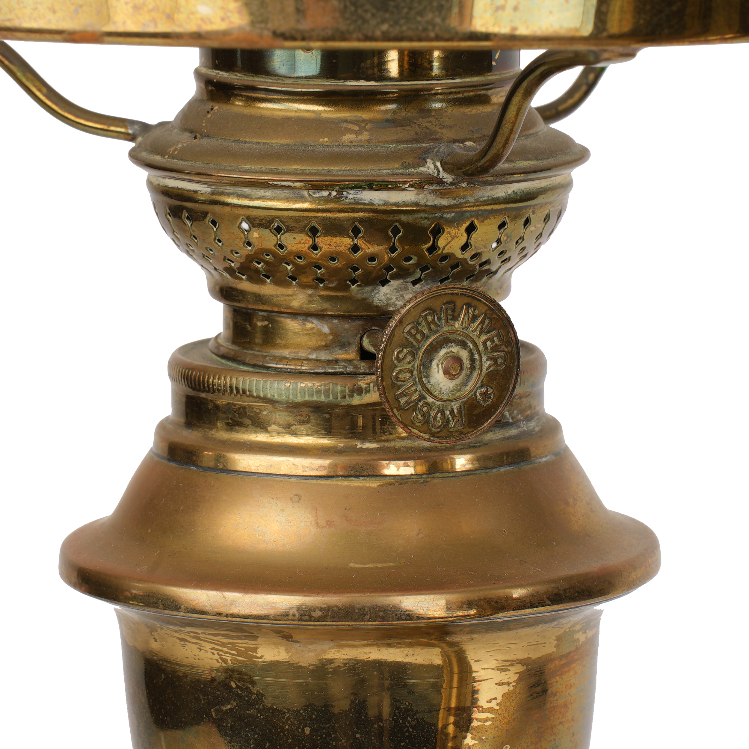 Студенческая лампа «Горелка Космос» викторианской эпохи. Латунь, стекло, вертикальный резервуар на регулируемой центральной оси, в основании утяжелитель для устойчивости, клейма: круглая марка на вентиле и головке механизма горелки - "Kosmos Brenner", Западная Европа, 1870-1905 годы, высота - 47 см